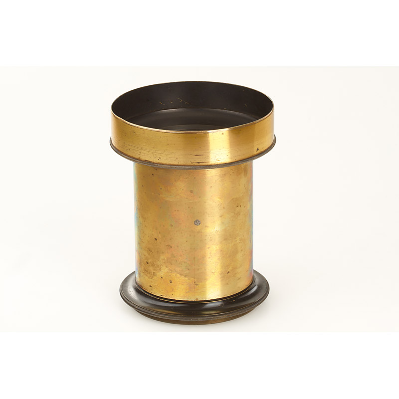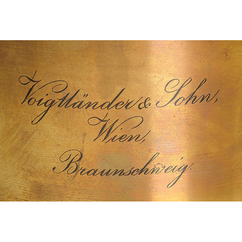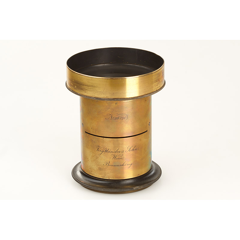 c.65cm focal length, engraved 'Voigtländer & Sohn, Wien, Braunschweig' (clean lenses), for waterhouse stops, lens diameter c.9cm, total height incl. hood 18cm, shutter cap