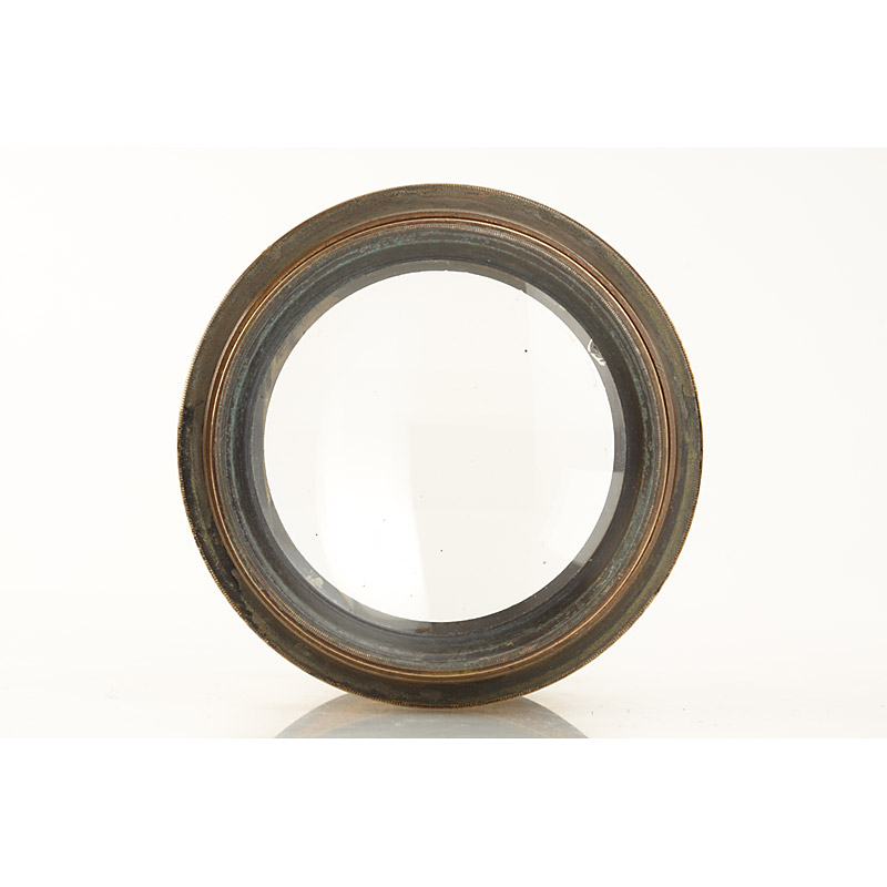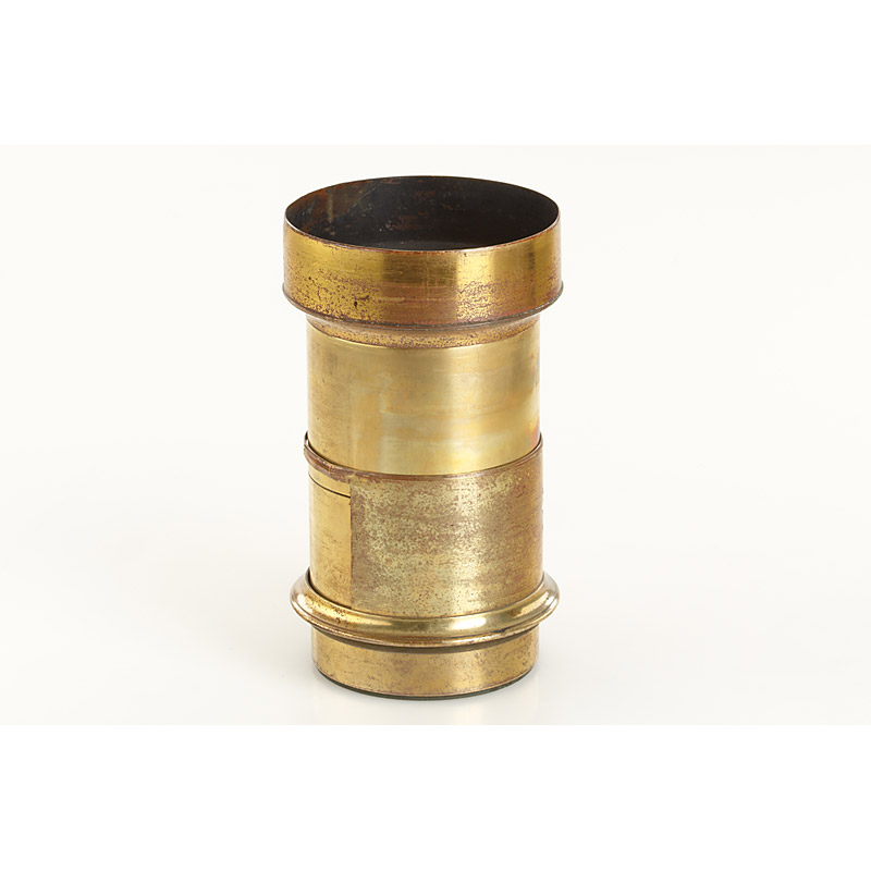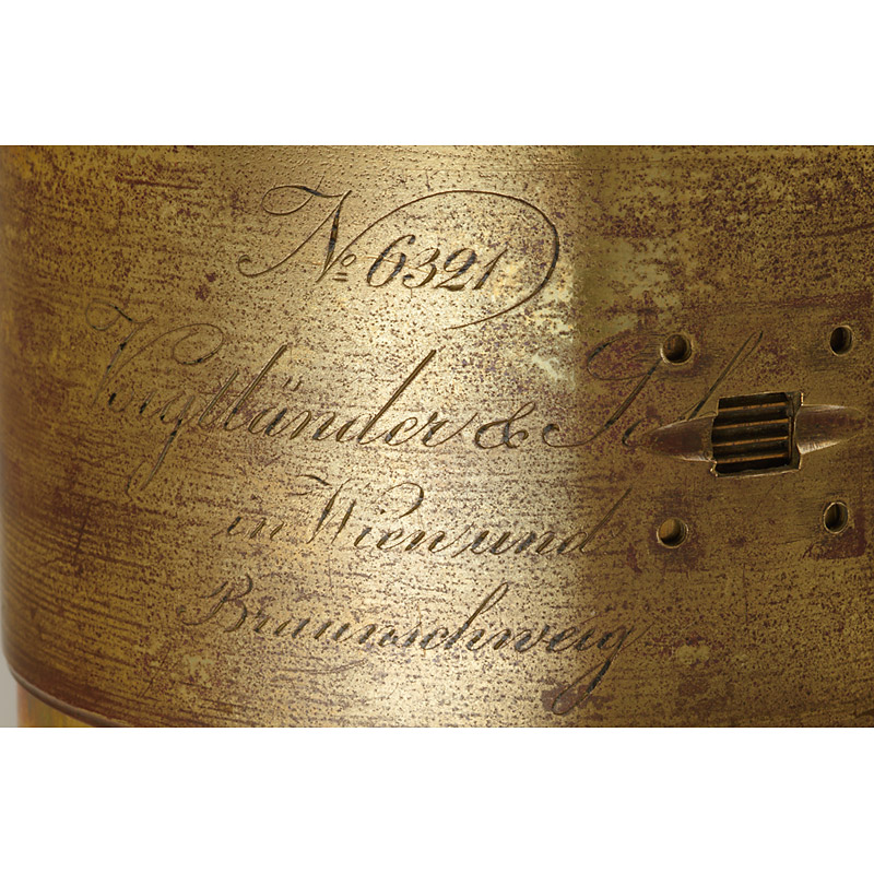 early Petzval lens, focal length c.26cm, barrel engraved 'Voigtländer & Sohn in Wien und Braunschweig', later modified for waterhouse stops and barrel re-engraved (around 1865), rack and pinion focusing missing, lens diameter c.8cm, rear element with small glass chip, total height including hood c.20cm