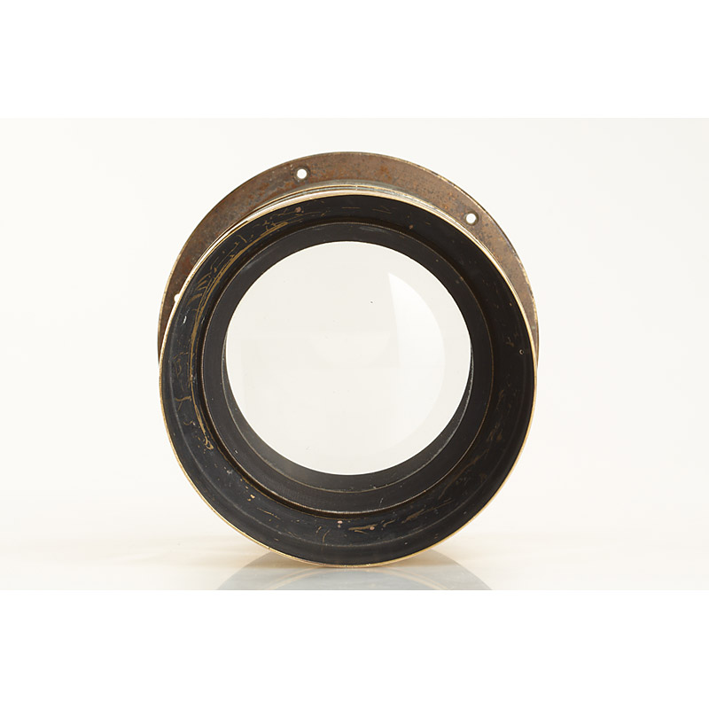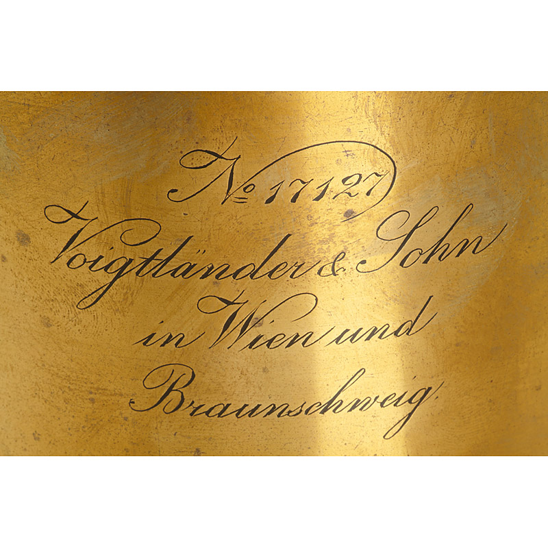 c.45cm focal length, barrel engraved 'Voigtländer & Sohn in Wien und Braunschweig' (with fine lenses, rear element with some marks), for waterhouse stops, front and rear lens diameter c.11cm, total height incl. hood 27.5cm, mounting ring, original shutter cap with wooden knob