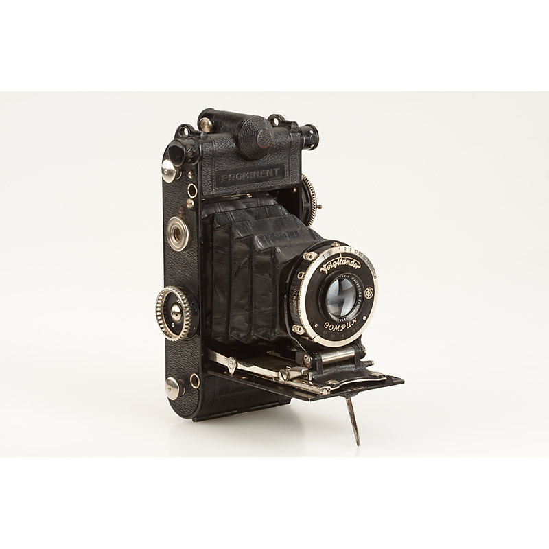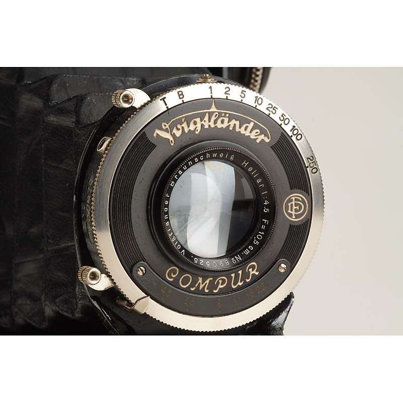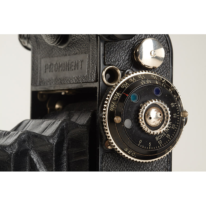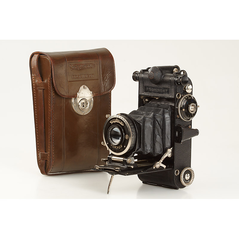 for 6x9cm exposures on roll film, in fine condition with Heliar 4.5/10.5cm no.890525 in good working Compur shutter, 4.5x6cm mask inserts, original case, the Prominent was the first camera with a built-in light meter