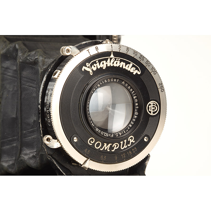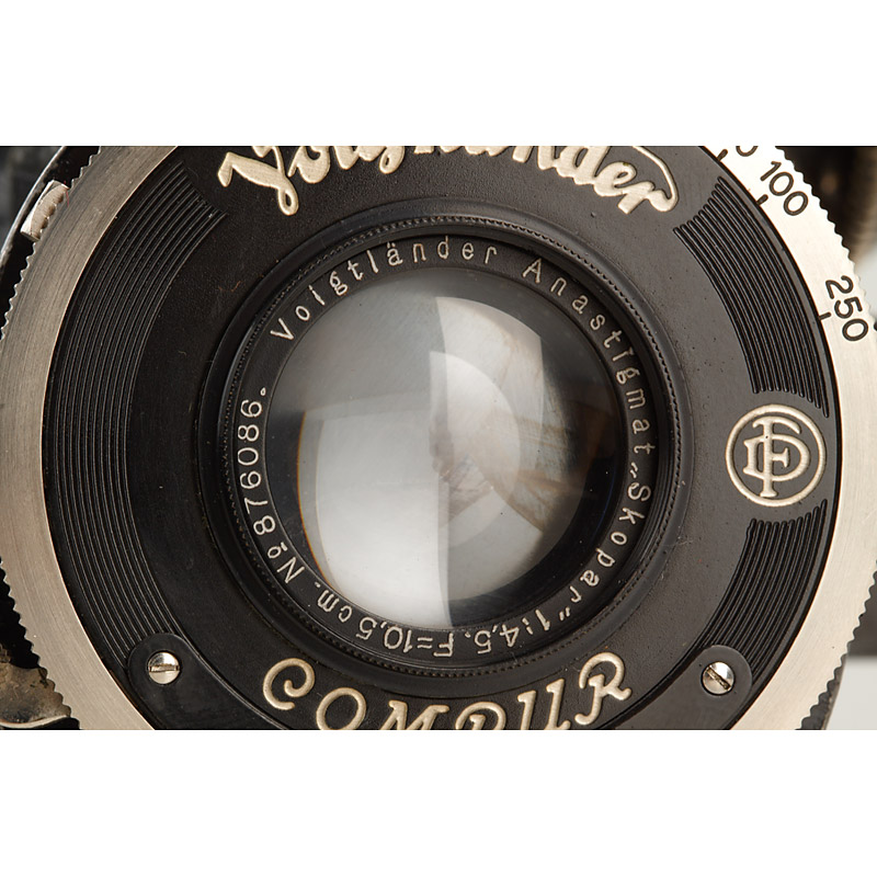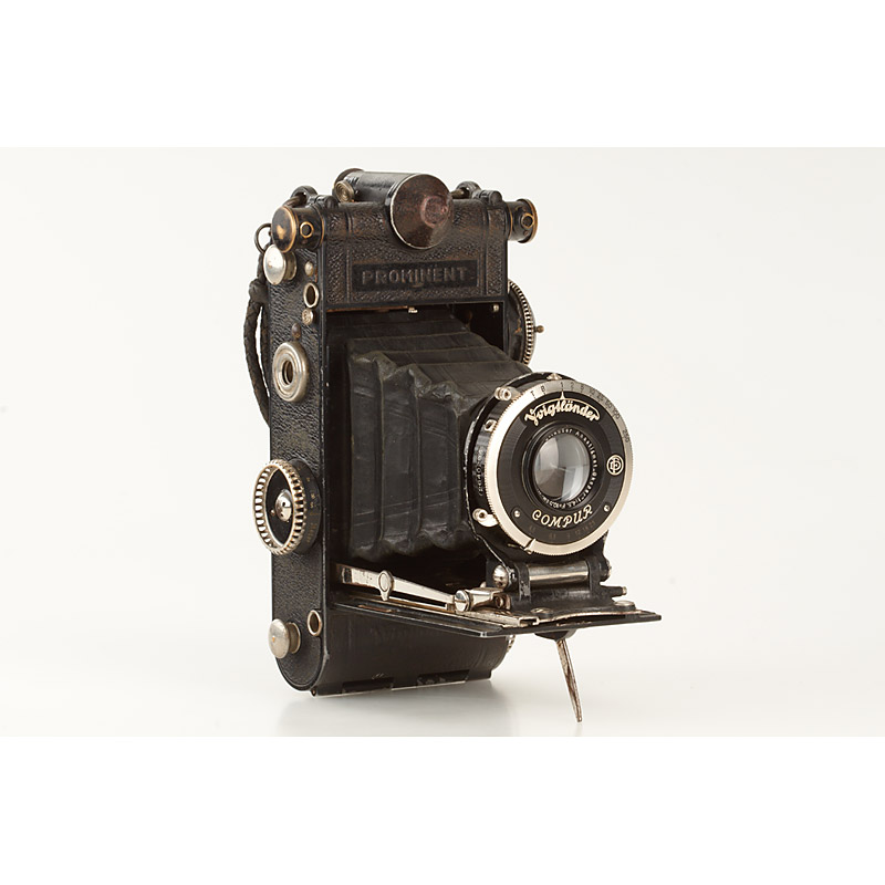 for 6x9cm exposures on roll film, in fine condition with Skopar 4.5/10.5cm no.876086 in good working Compur shutter, the Prominent was the first camera with a built-in light meter, original case