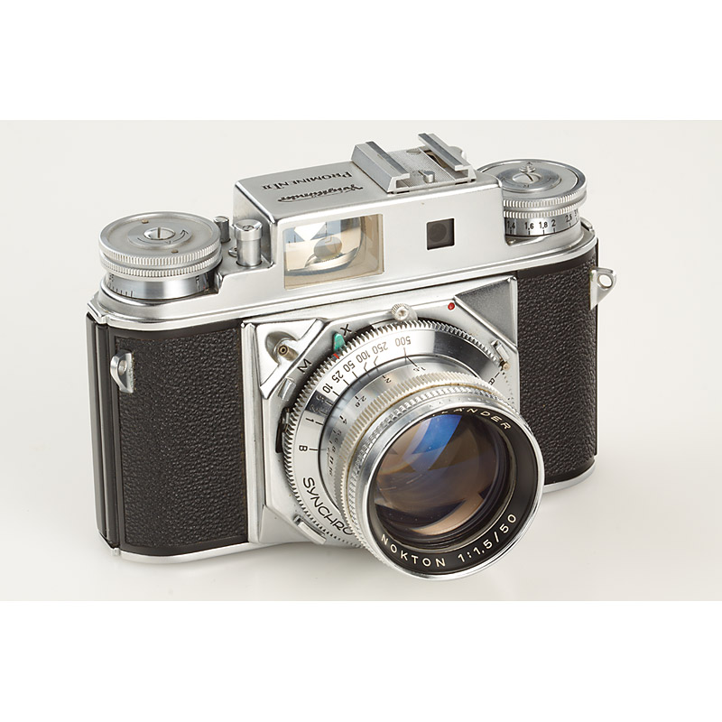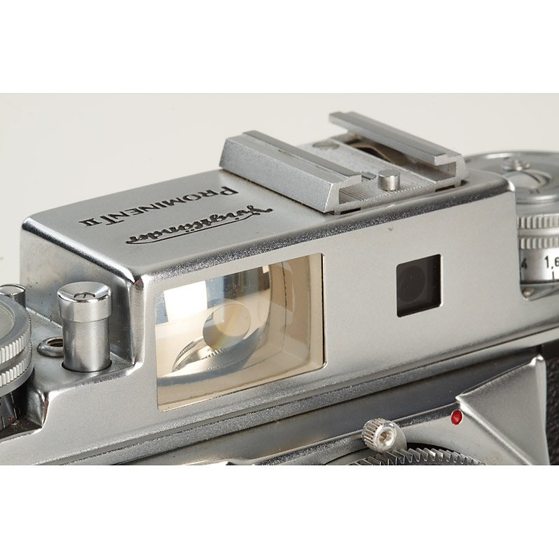 very clean Prominent II body with 'black face' Nokton 1.5/50mm no.4444800 (310/49 hood), rare Telomar 5.5/100mm no.3467065 with mirror reflex housing with straight finder and very rare 45° prism in case