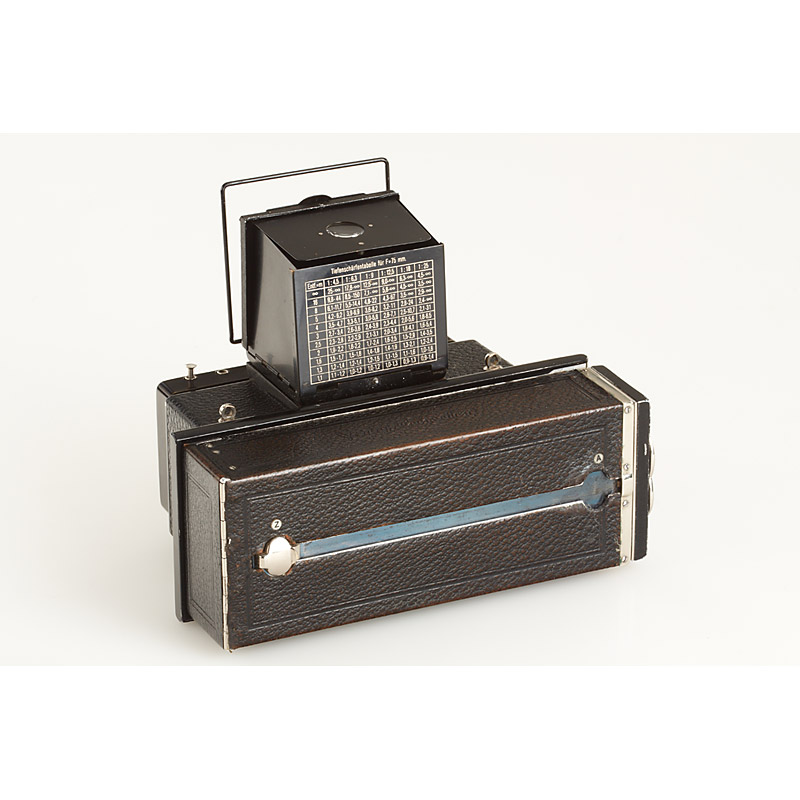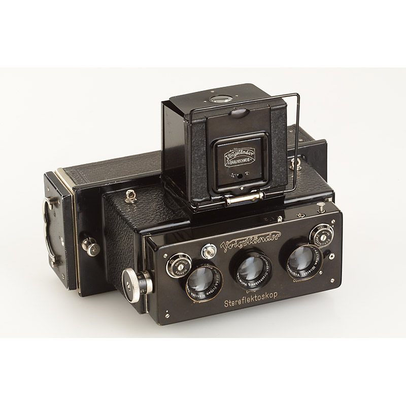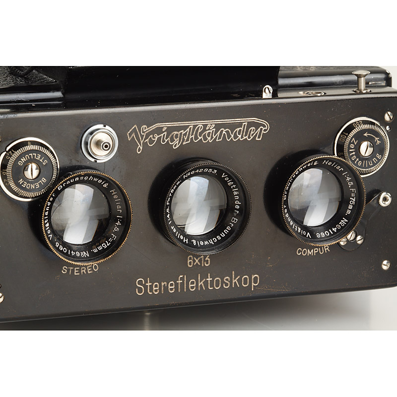 6x13cm, large format Stereflektoskop in very fine condition and good working order, late version with 3 Heliar lenses 4.5/75mm nos.641065/6 and 642853, original case, caps, rubber hoods and custom made 120 roll film back