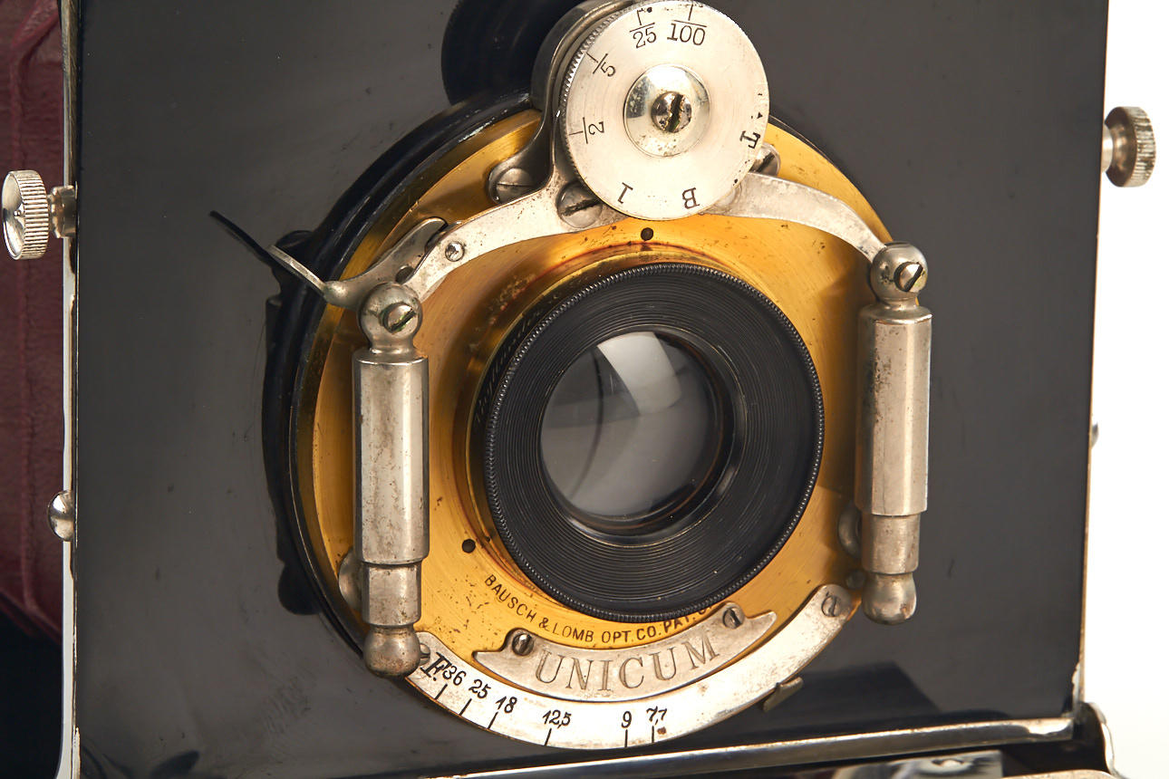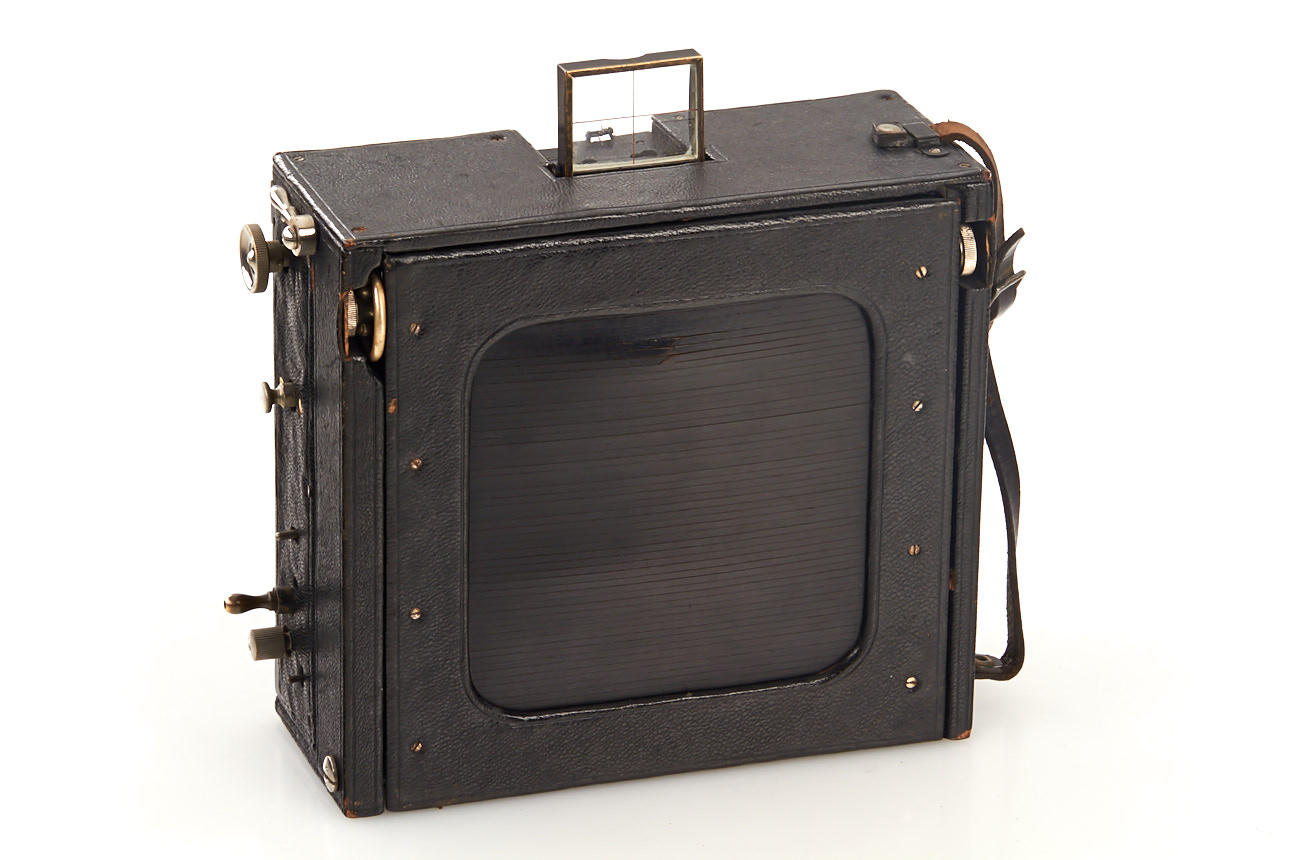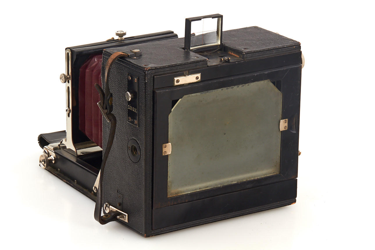 early 9x12cm folding camera with roller blind shutter, probably a pre-series or prototype (shares similarities with early Alpin and Heliar models), unique roller blind built-in in folding bed, wooden body, metal front standard, with Voigtländer Euryscop 14cm lens no.66082 in B&L Unicum shutter