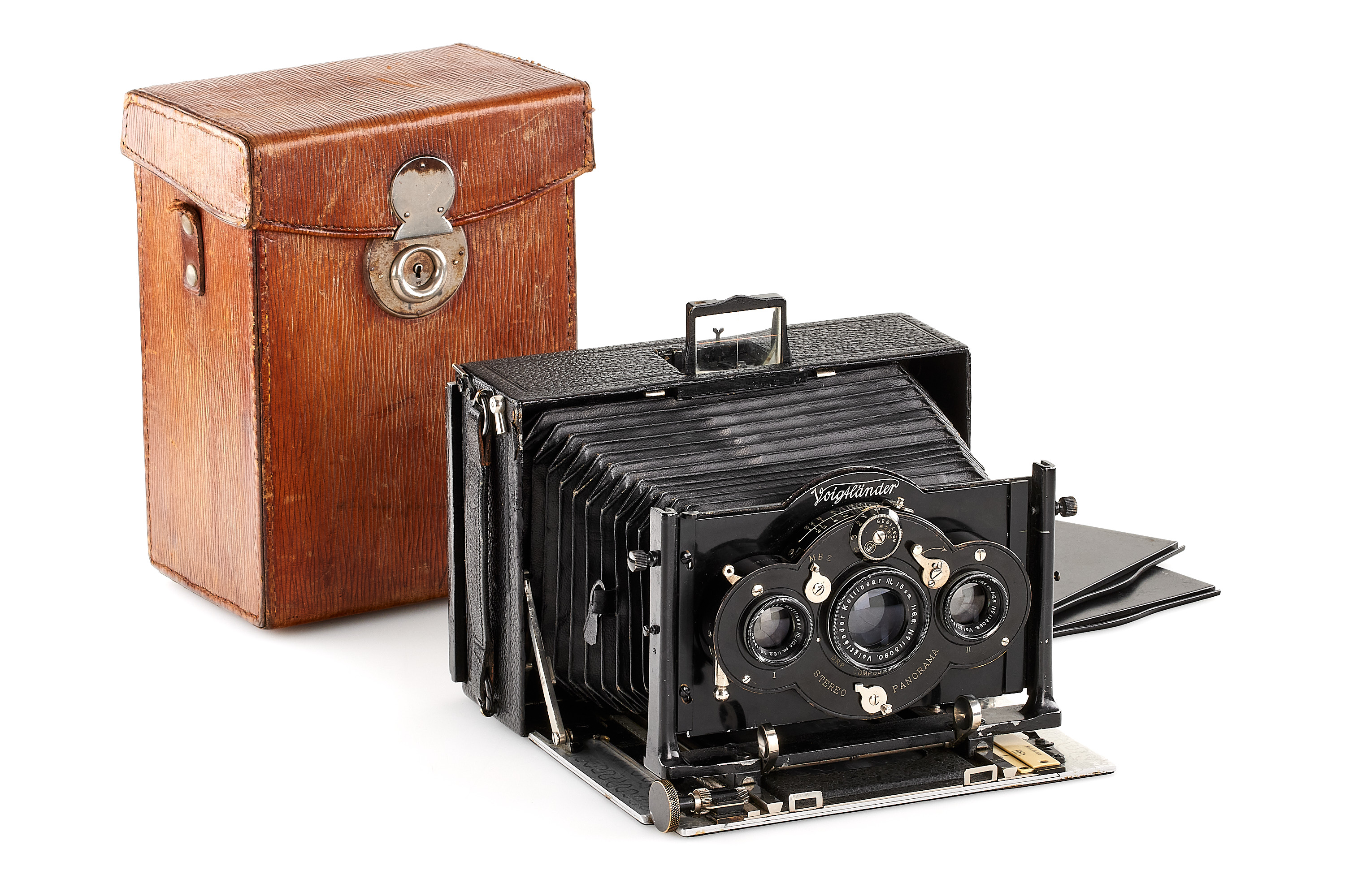 A very rare folding-bed camera for stereo and panoramic exposures. Uncommon three-lens shutter with one Kollinear III 15cn no.113090 and two 10.5cm Kollinear III lenses no.113088 and 113089. In beautiful condition, with two cassettes and a leather case.