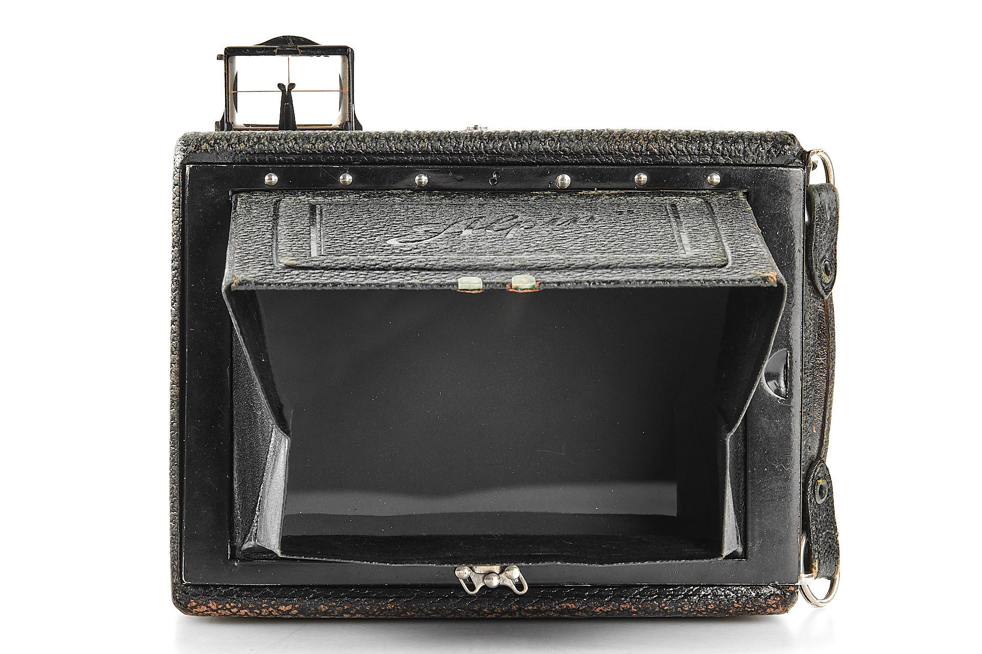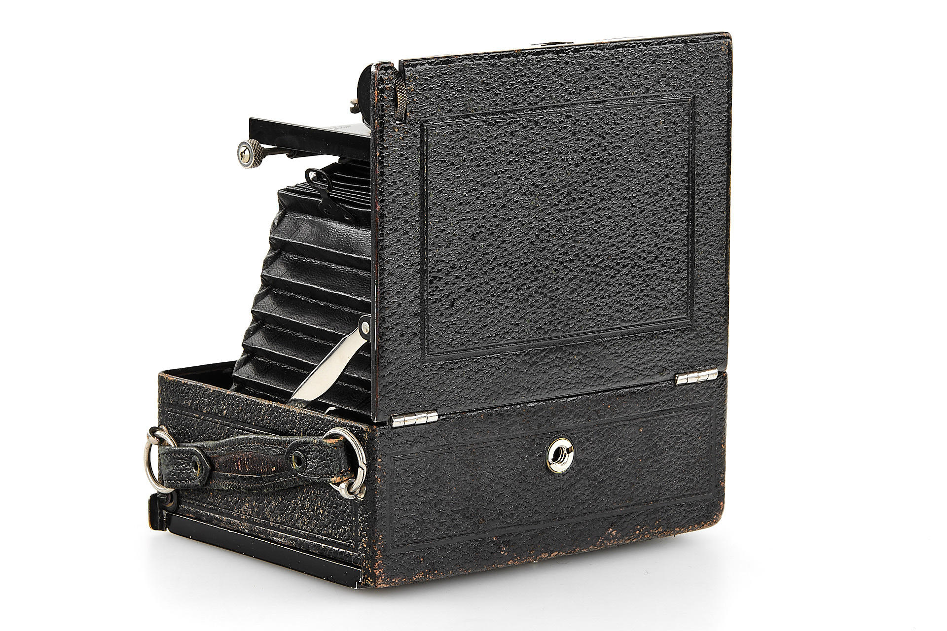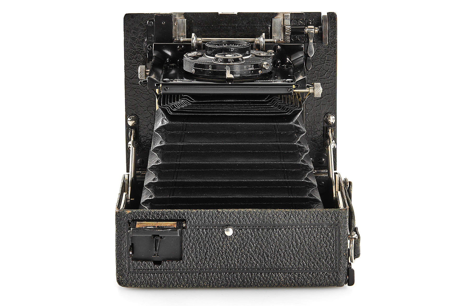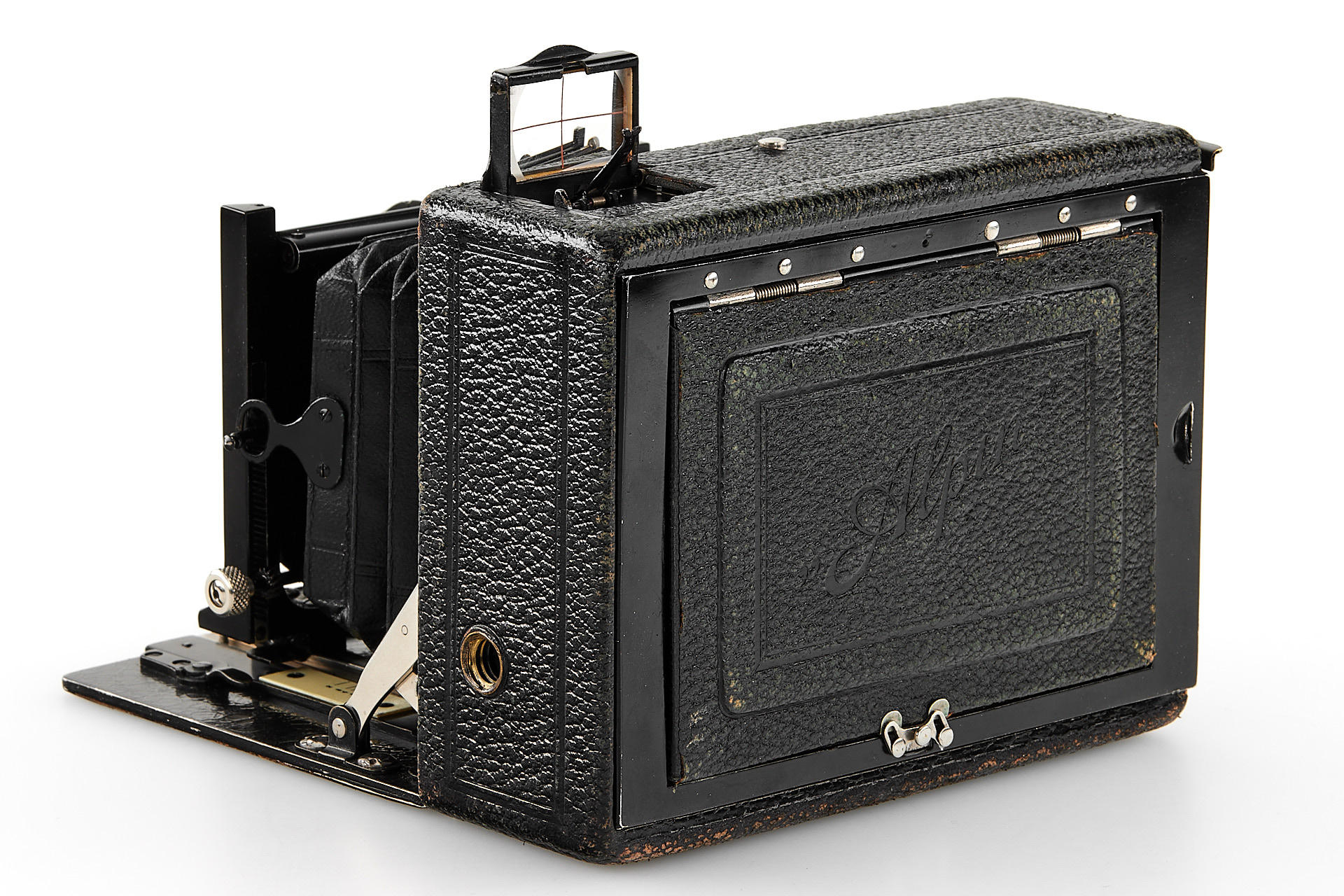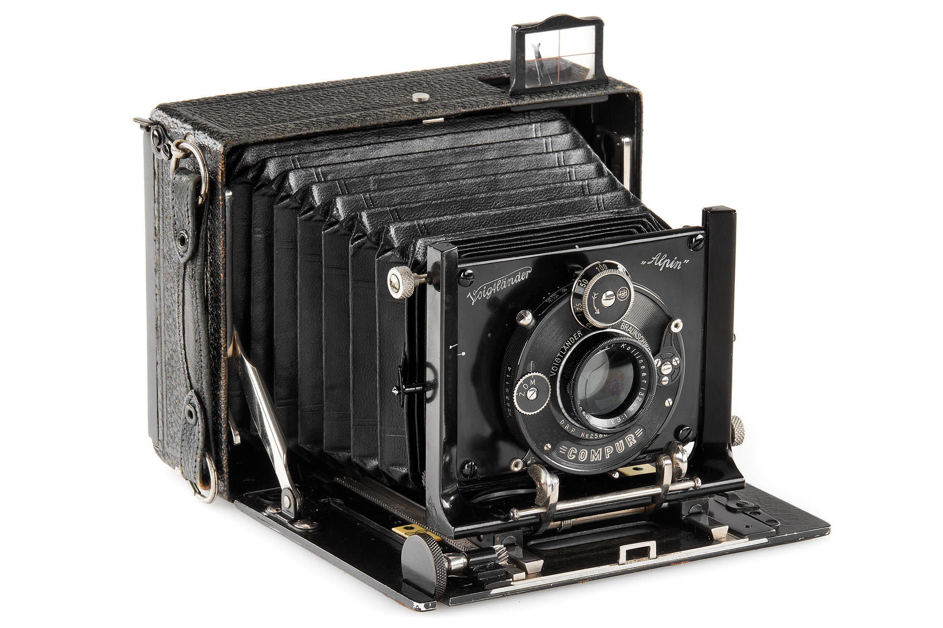 Very interesting and rare folding plate camera for horizontal 9x12cm exposure, later model in very good condition and working order, with Kollinear 6.3/132mm no.153957 in Compur shutter, with ground glass and 3x film plate holders