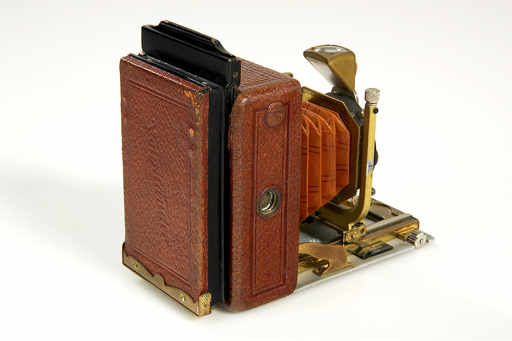 rare 4.5x6cm Bergheil, brown leather covering, brown bellows, gold plated metal parts, Kollinear 6.3/75mm no.223202 in Compur shutter, complete with focusing screen adapter, film pack adapter, 3 original film holders