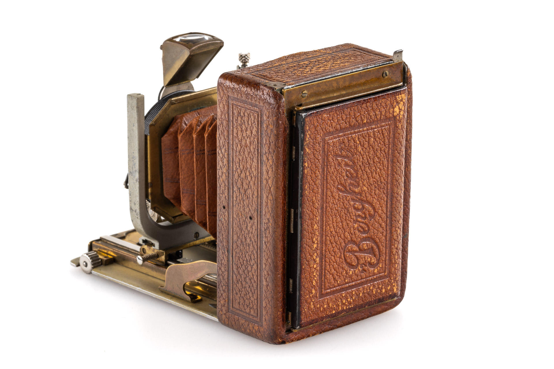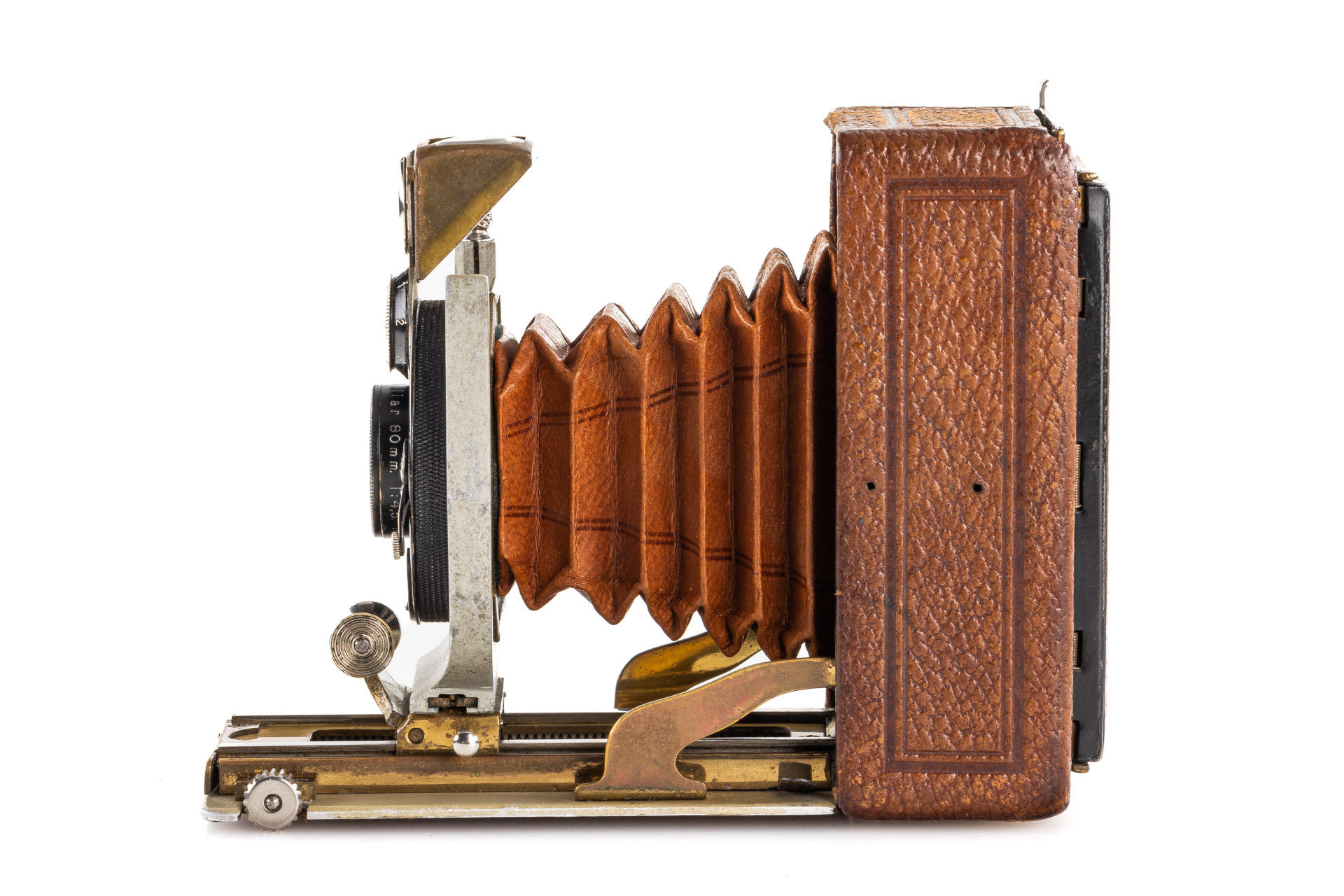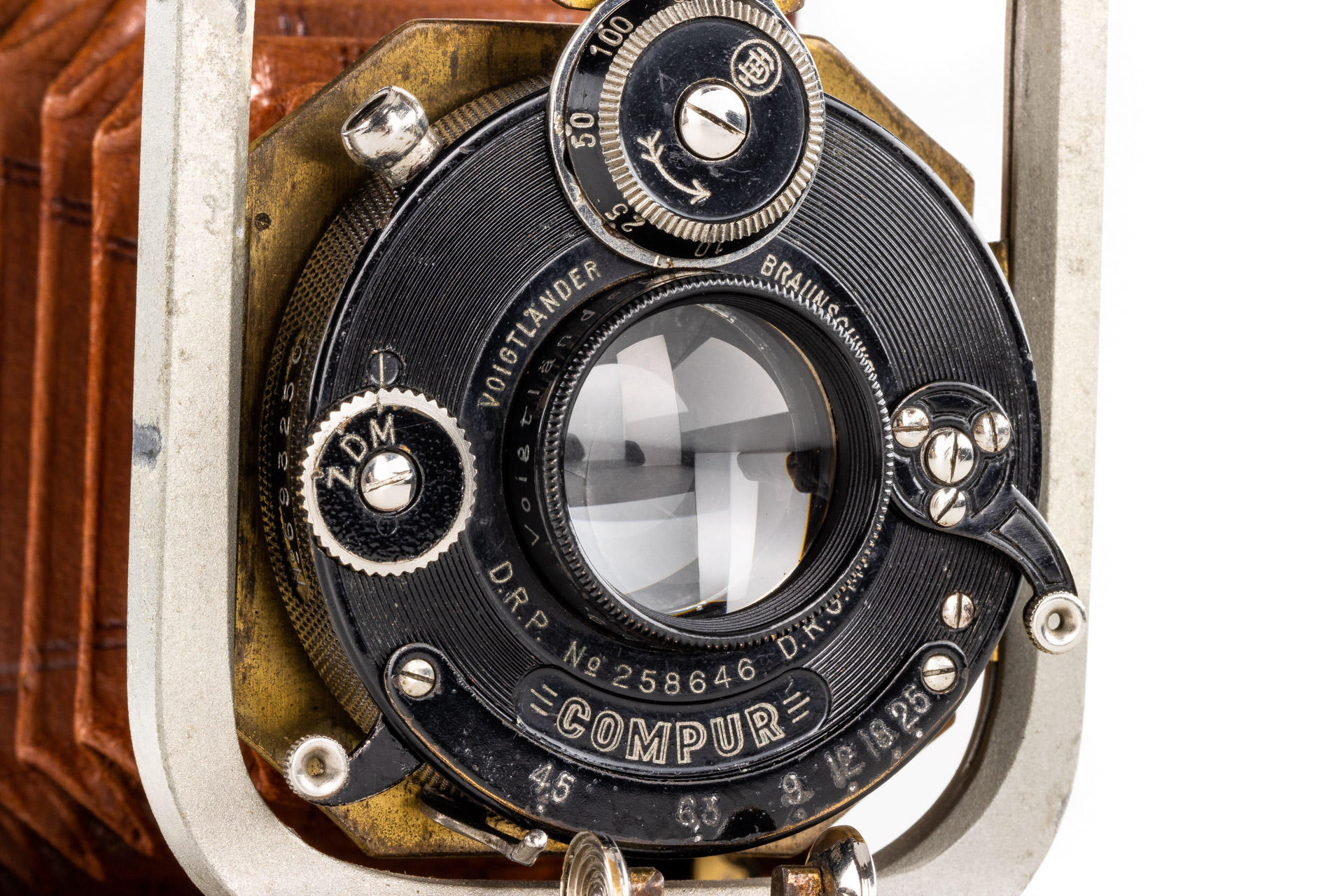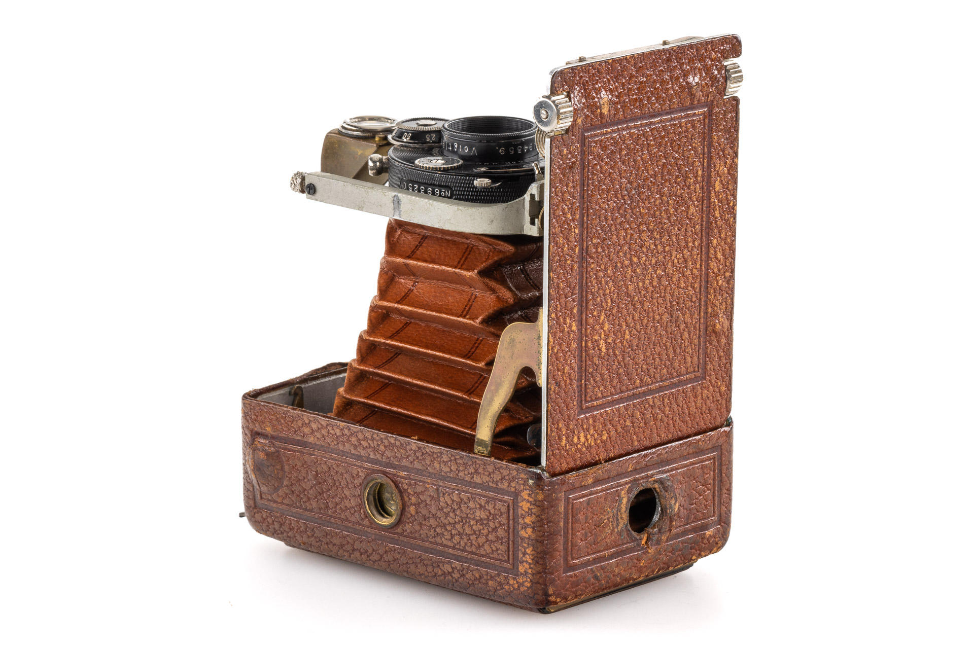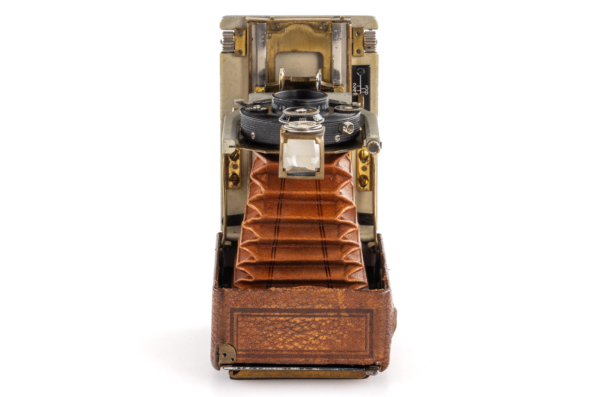 Very rare 4.5x6cm Deluxe version, in good cosmetic condition, with brown leather covering, brown bellows, gold-plated metal parts, with Heliar 4.5/80mm no.194359 in Compur shutter, with ground glass back