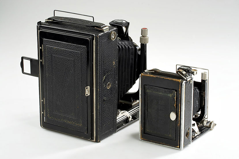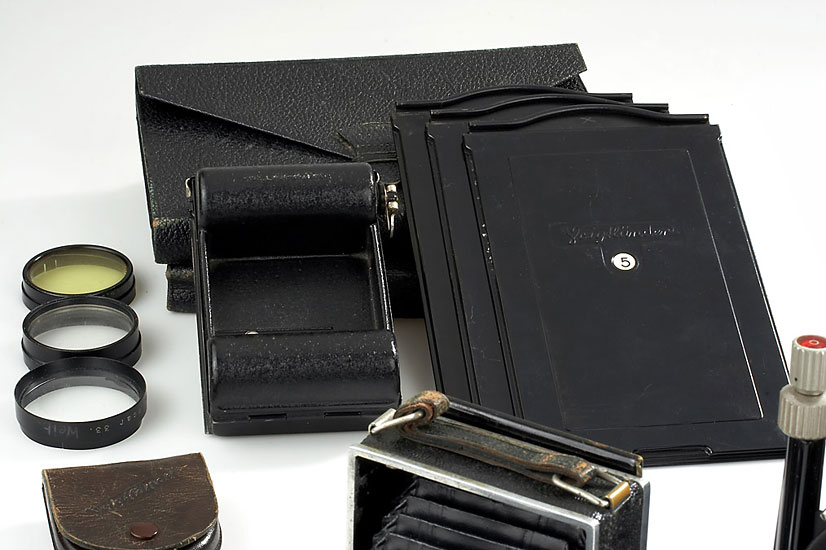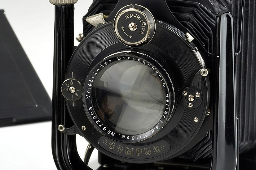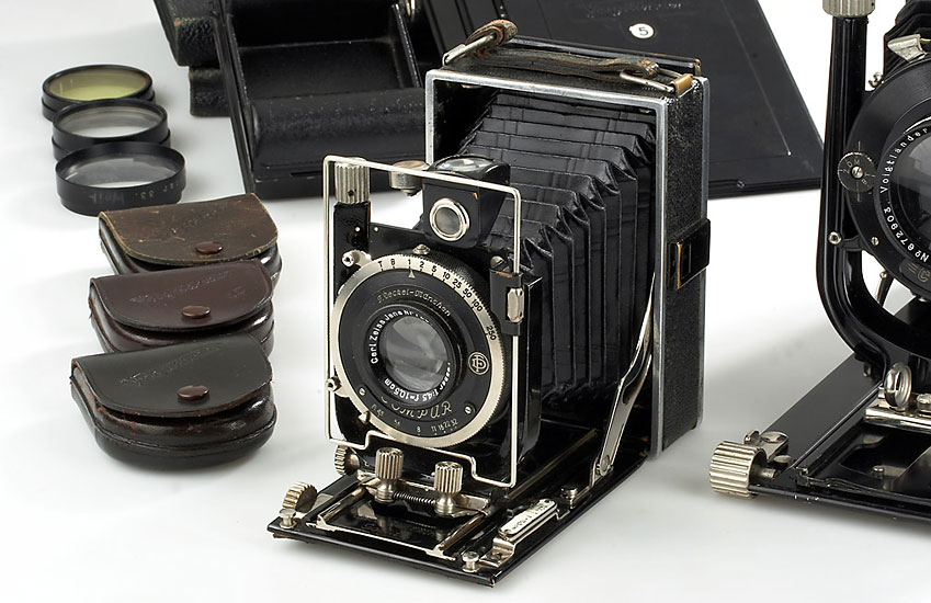 10x15cm, in good original condition, Heliar 4.5/18cm no.672903 in Compur shutter, with focusing screen adapter, case, 6 film holders in cases, Voigtländer WW. Focar 33 and Focar 12 in cases, also included: Bentzin Primar 6.5x9cm, Tessar 4.5/10.5cm no.1203613 in Compur shutter, rollfilm adapter, filters in case (2)