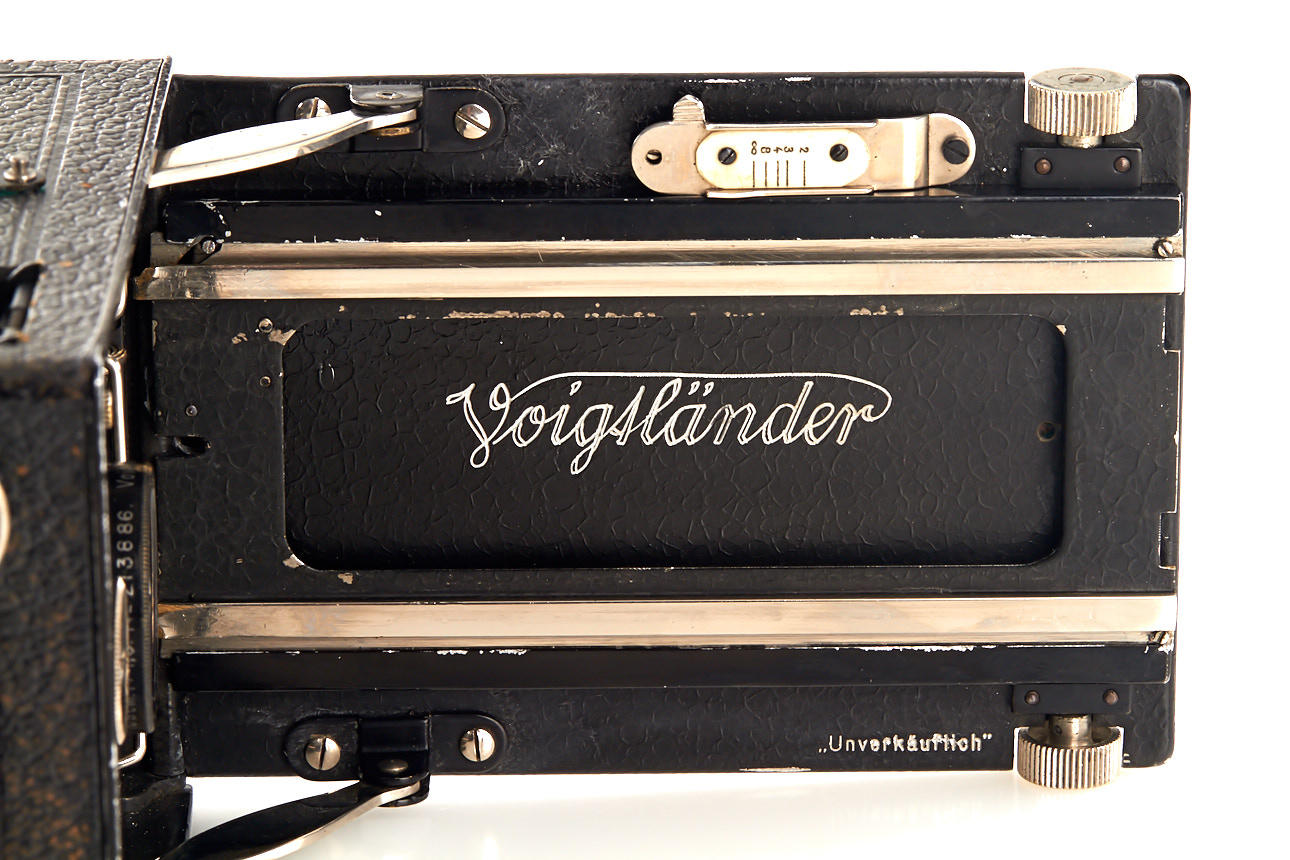 early 6.5x9cm model engraved on folding bed 'Unverkäuflich' (not for sale) - probably a display model from Voigtländer, with Heliar 4.5/10.5cm no.213886