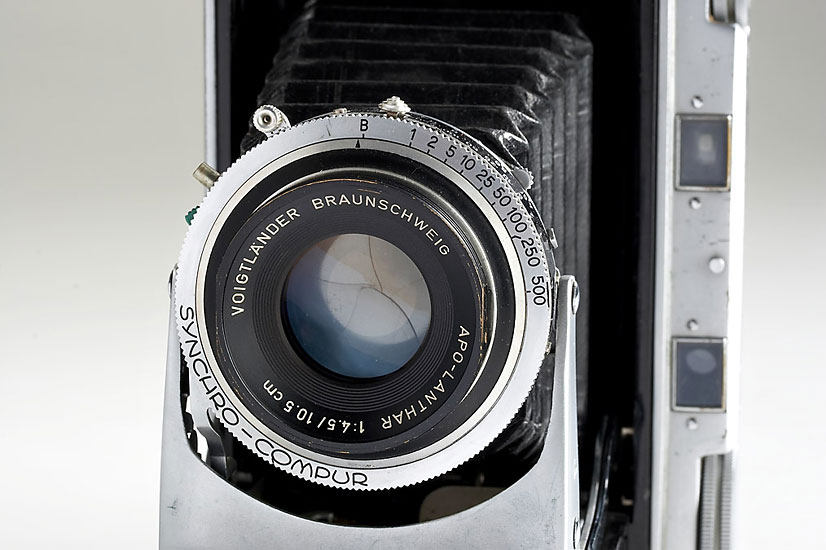 6x9cm, prototype with unique black faced Apo-Lanthar 4.5/10.5cm in Synchro-Compur shutter, inside panel of the camera hand-engraved: 'KOBO 58 VAG' (Konstruktionsbüro 1958 Voigtländer - construction bureau 1958 Voigtländer)