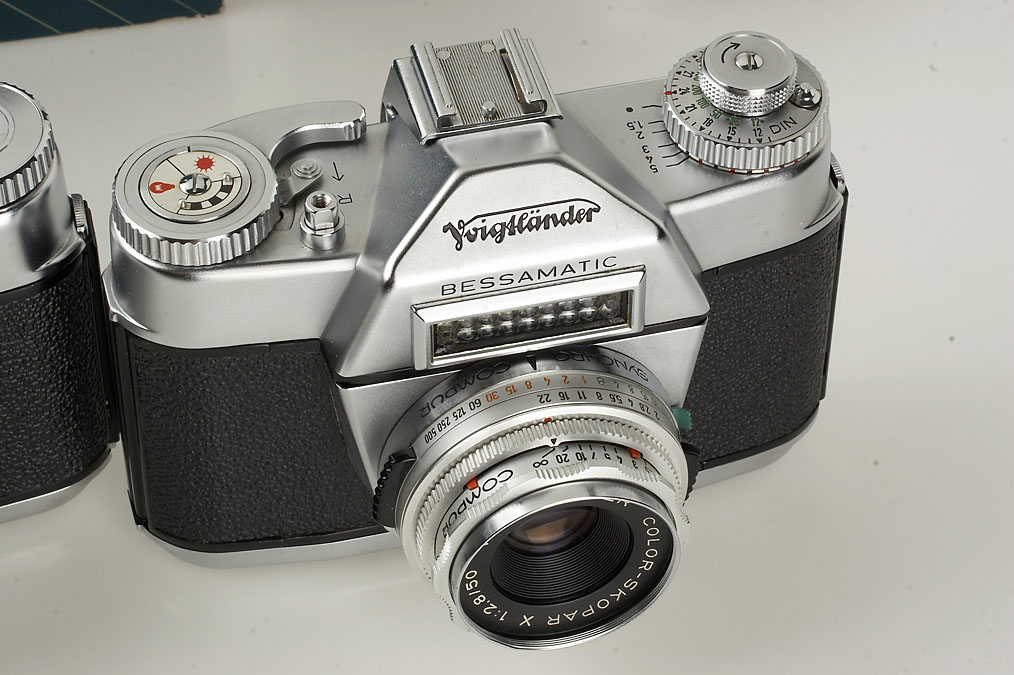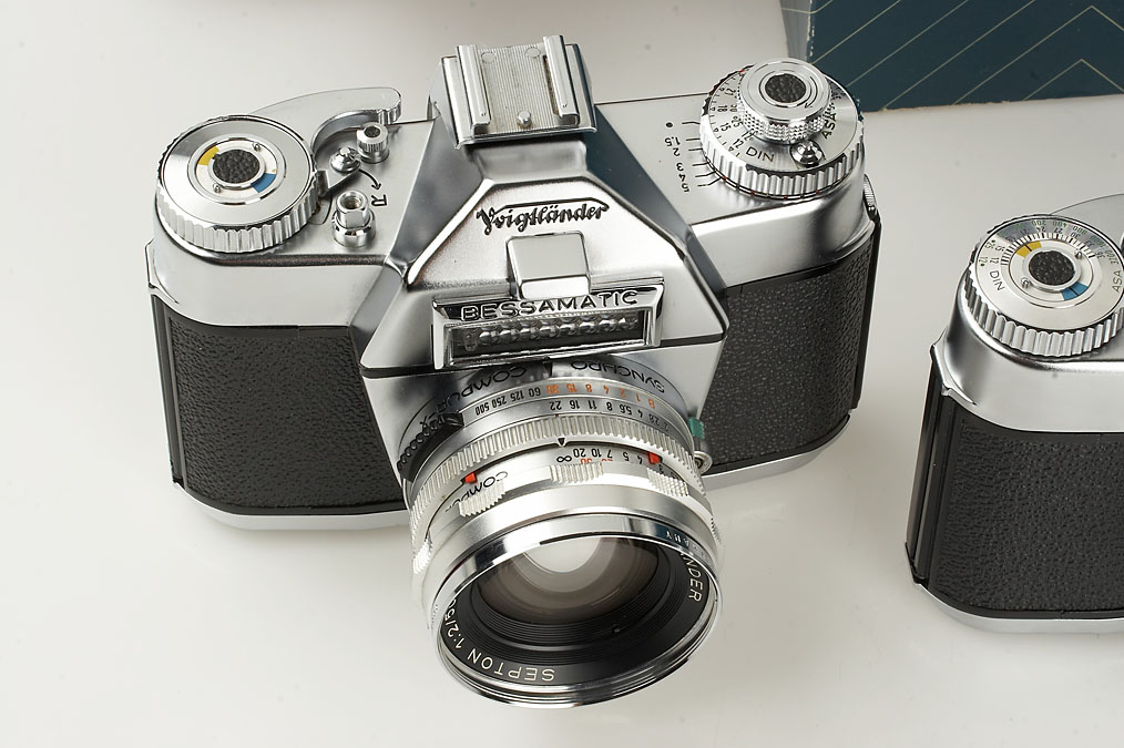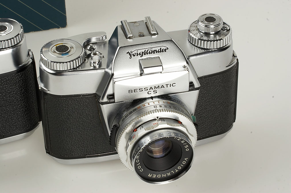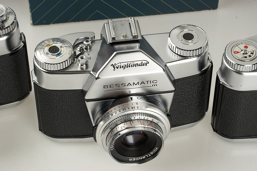 Bessamatic no.17085 with Color-Skopar X 2.8/50mm (case, condition A/B), Bessamatic de luxe no.218723 with close-focus Skoparex 3.4/35mm (original maker's box, condition A-), Bessamatic de luxe no.265620 with Septon 2/50mm (condition A-), Bessamatic-M no.306295 with Color-Lanthar 2.8/50mm (condition A-), Bessamatic CS no.411094 with close-focus Color-Skopar 2.8/50mm (condition B/A) (5)