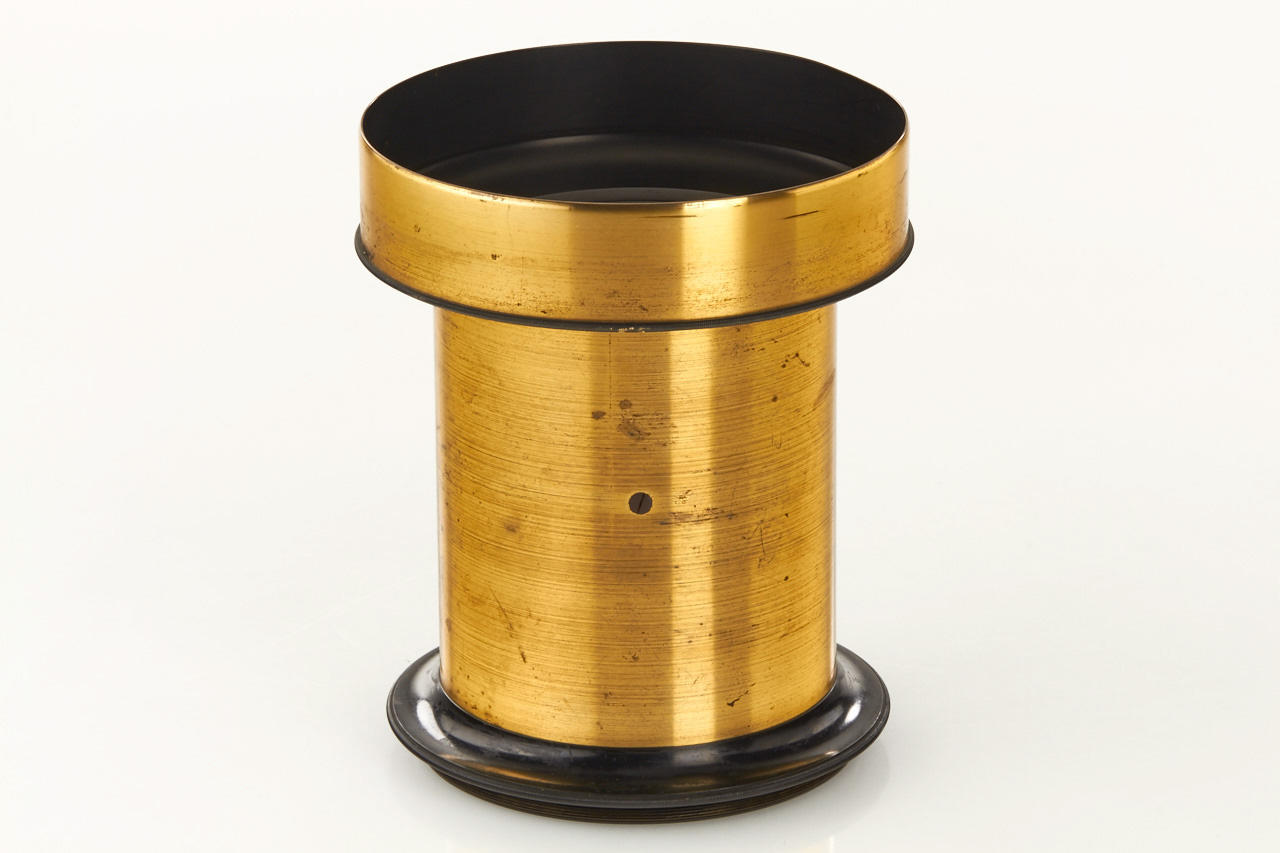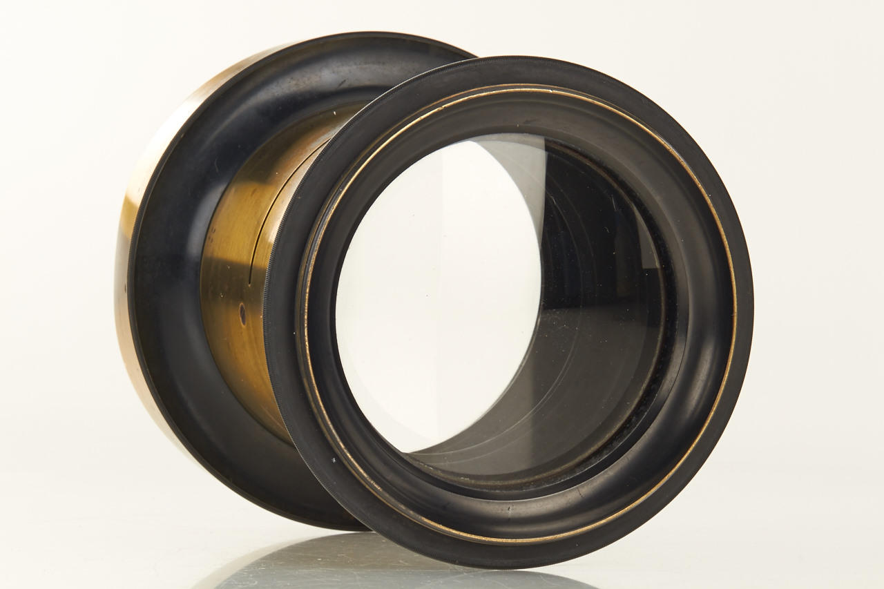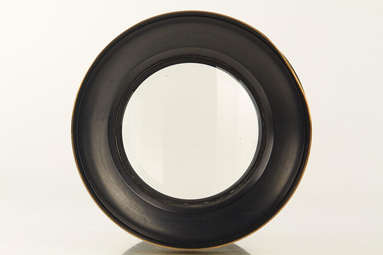 very rare "Braunschweig" lens in fine condition, focal length c.60cm and massive coverage of over 15x12 inch., very good clean optics, front and rear lens element diameter c.9cm, total height incl. hood c.17cm, slot for Waterhouse stops