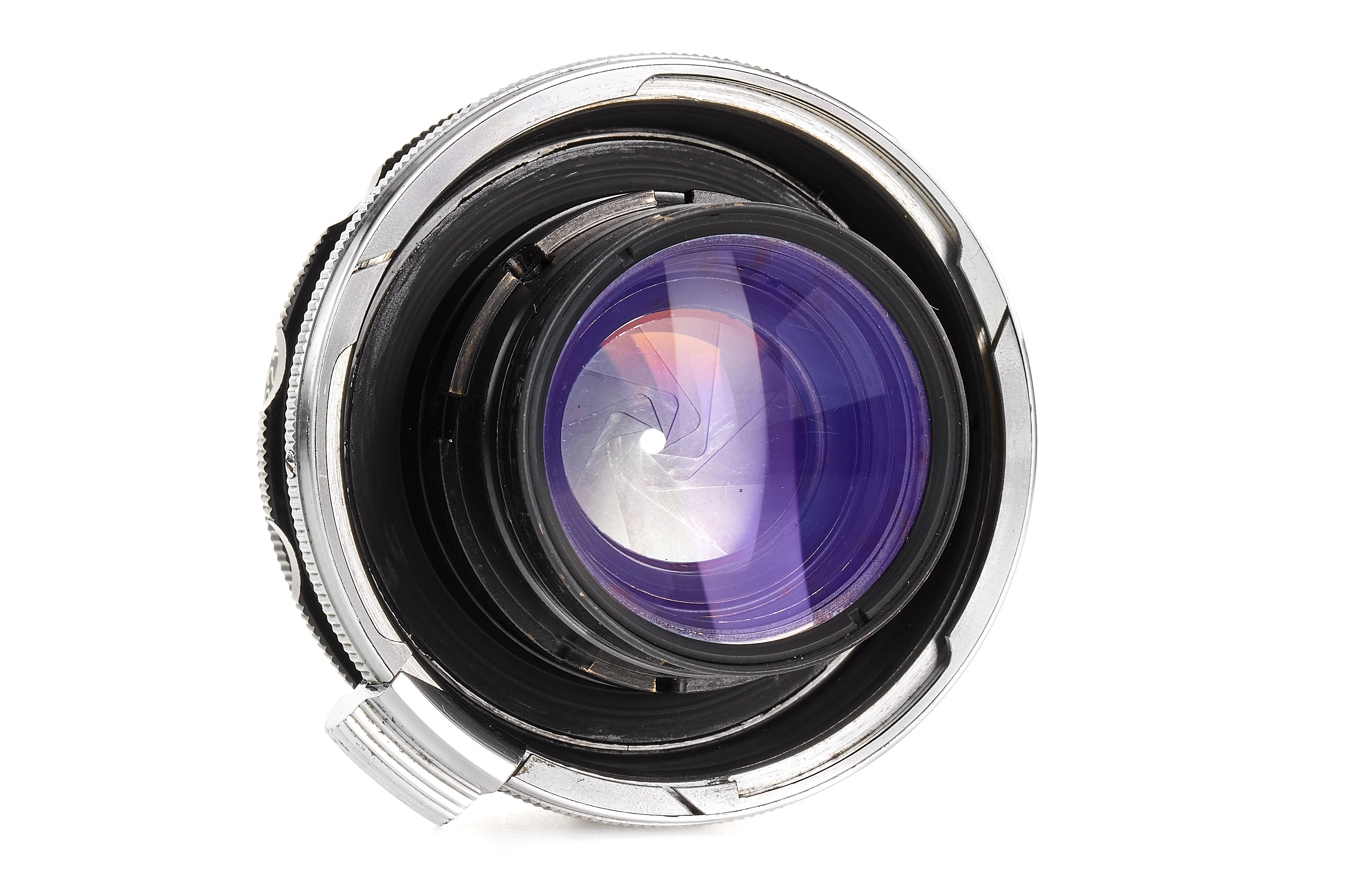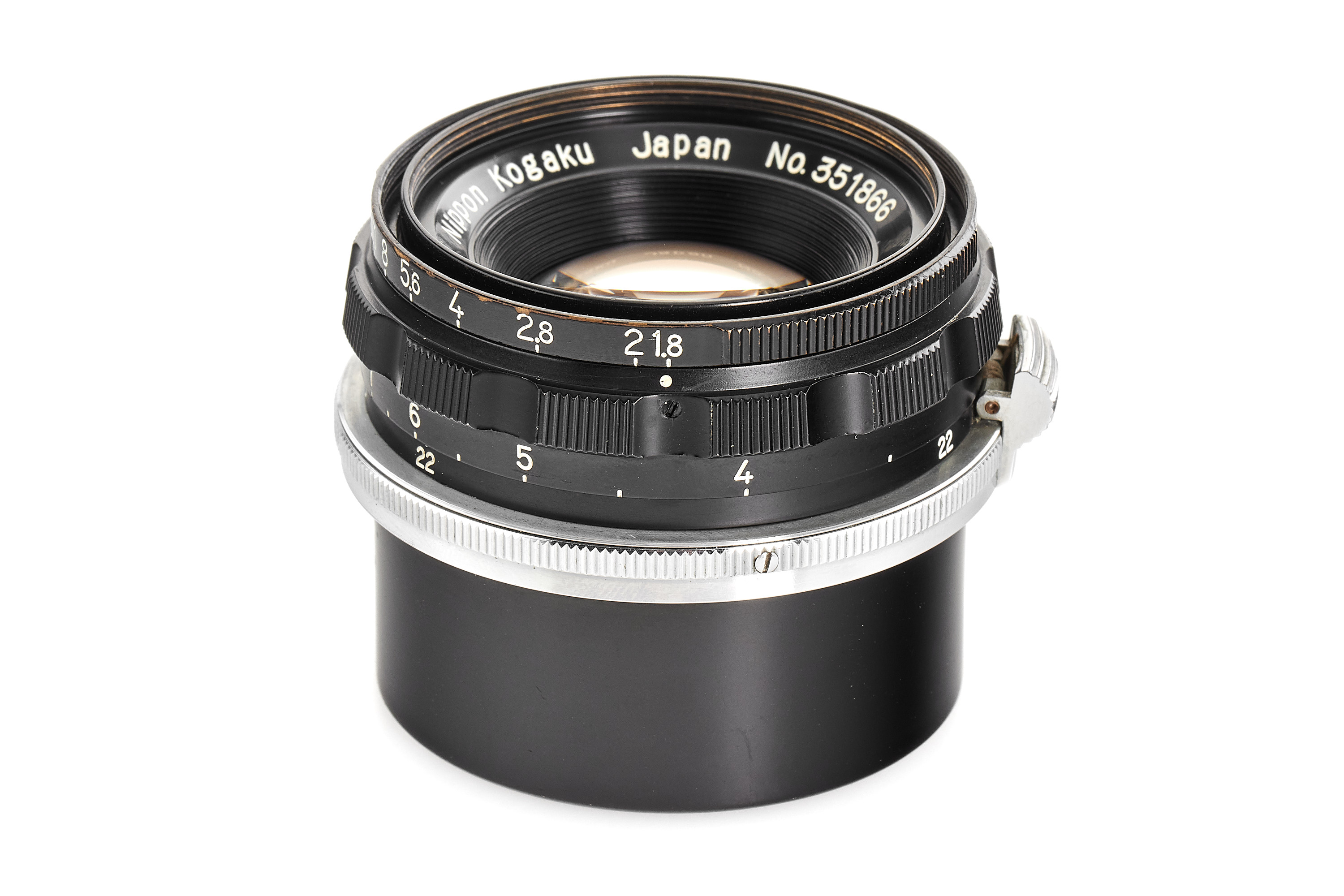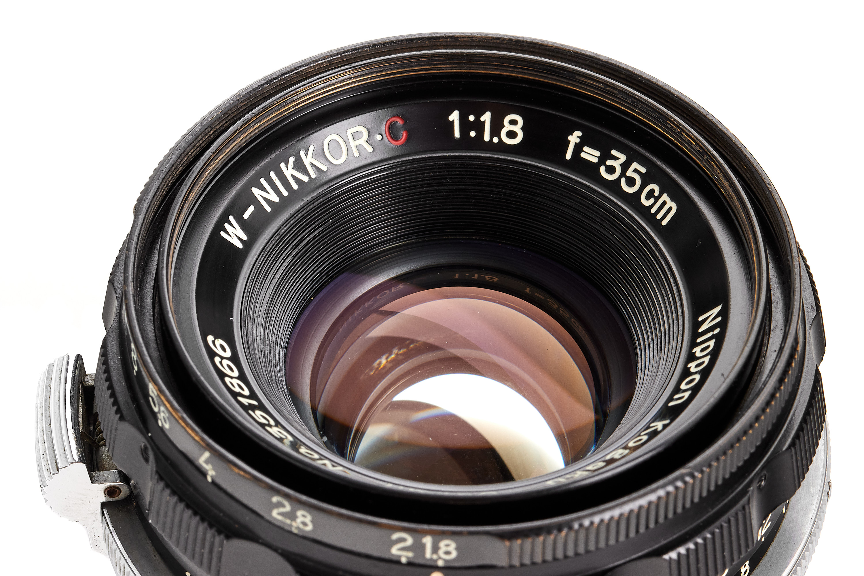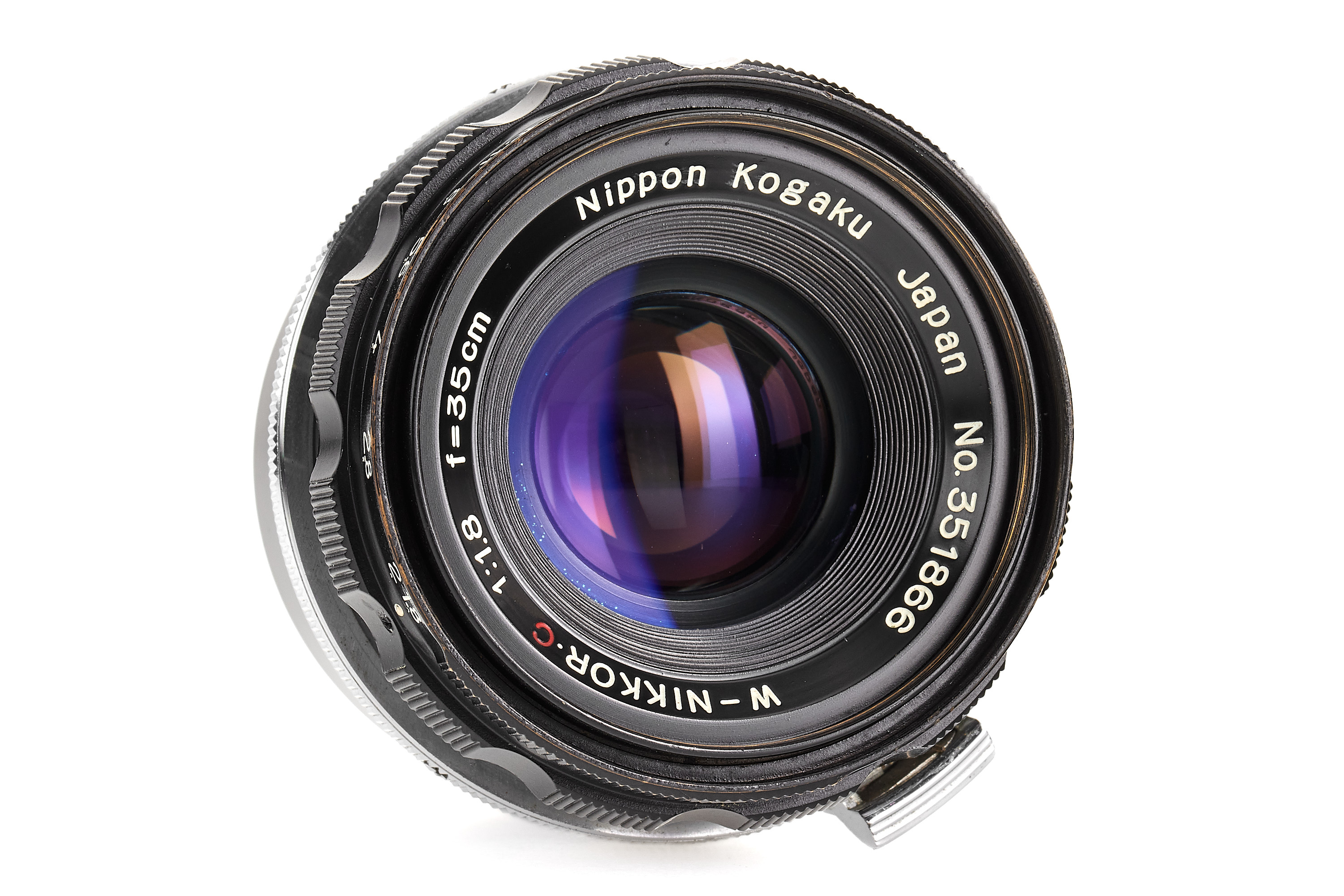 Extremely rare fast wide angle for RF Nikon cameras, one of the ca. 75 first ever made, with black rim, in beautiful, mint condition, lenses showing some cleaning marks and a light haze, with both caps, also note the mis-engraved '35cm' instead of 3,5cm.