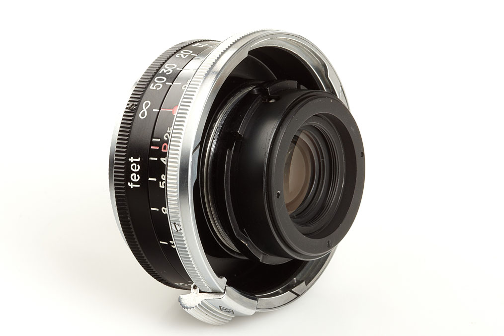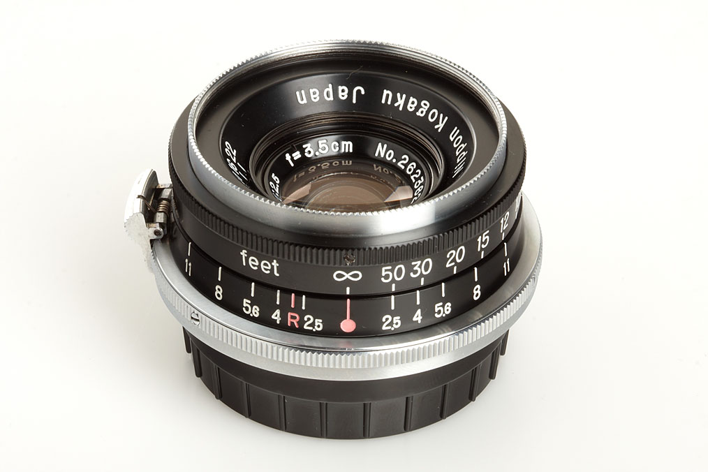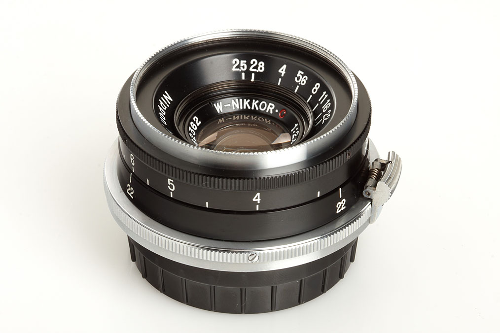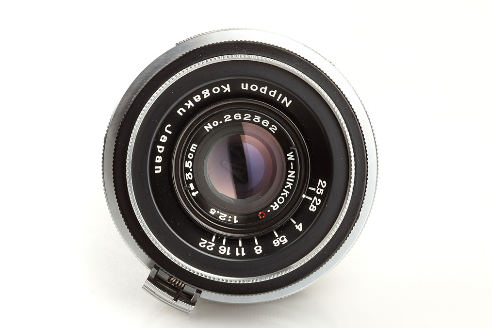 black/chrome W-Nikkor, E-P engraved, with clean lenses, both caps, keeper, hood (cond. B+)