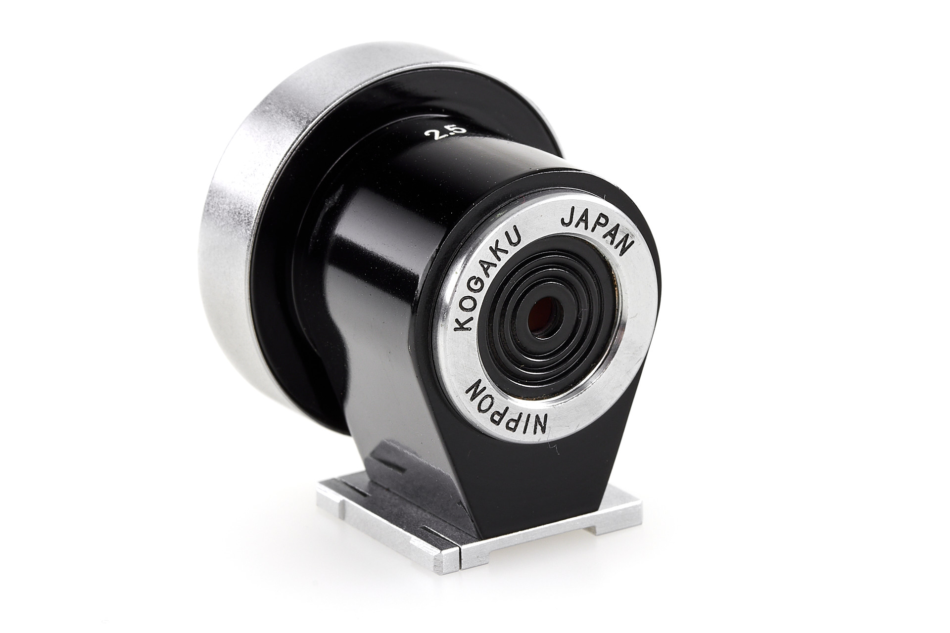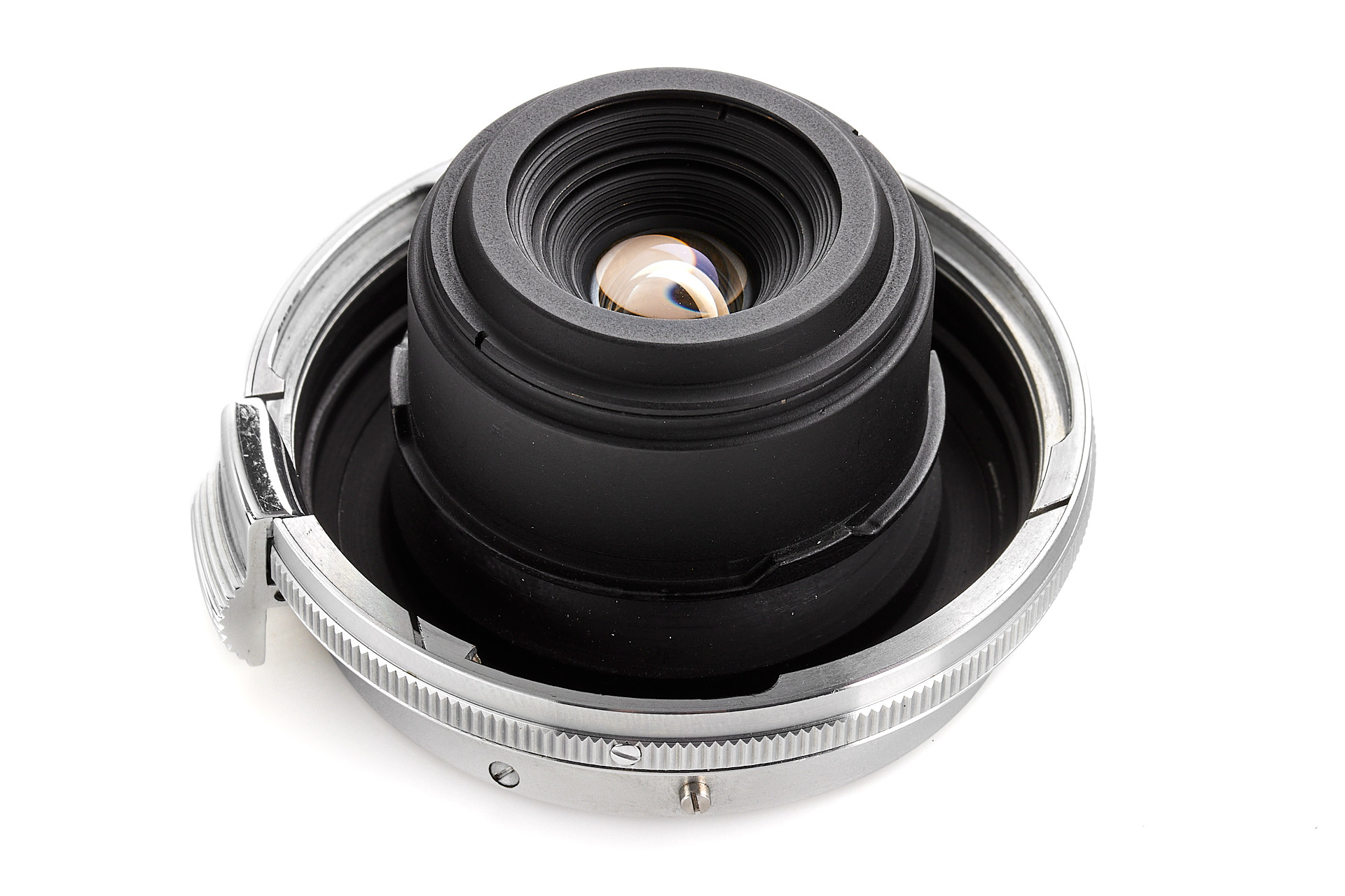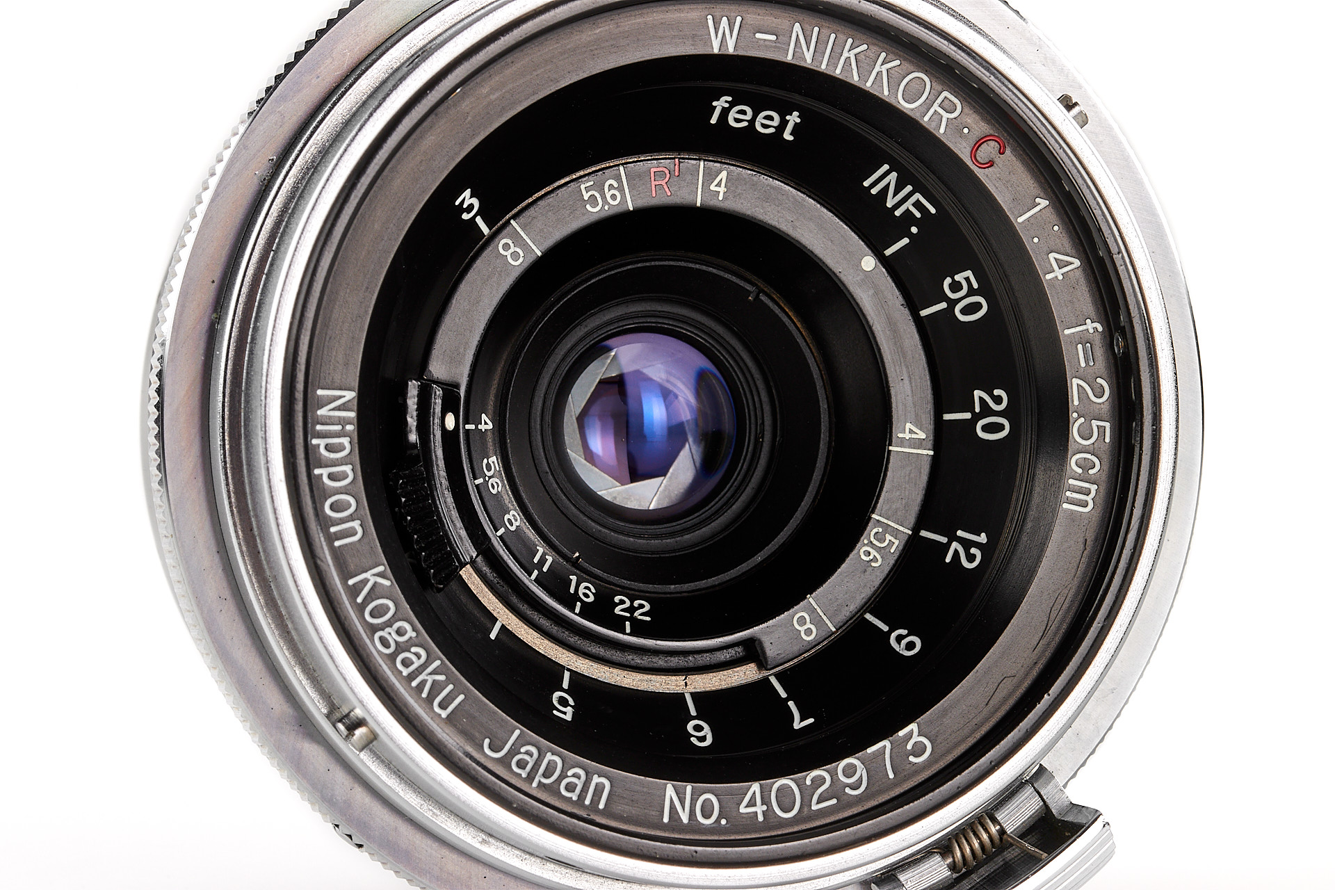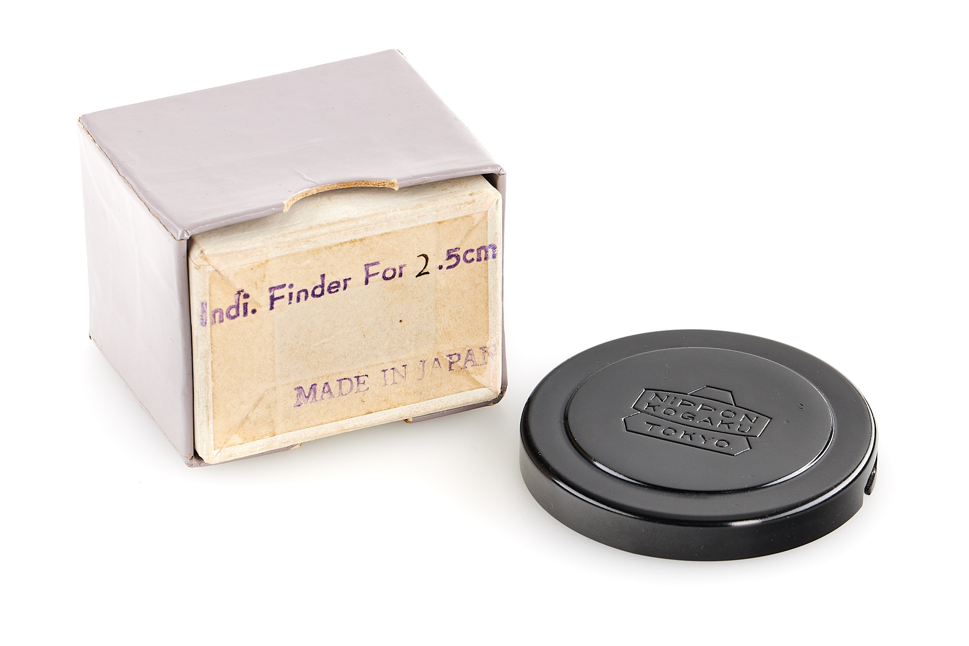 Rare wide-angle lens for Nikon RF cameras, first, chrome version in mint condition, very good optics only showing few dust particles, Nippon Kogaku Japan engravings, with rare original 2.5cm finder engraved E-P (maker's box), metal rear cap and rare matching front cap.