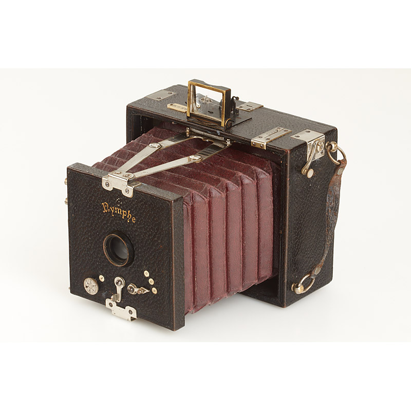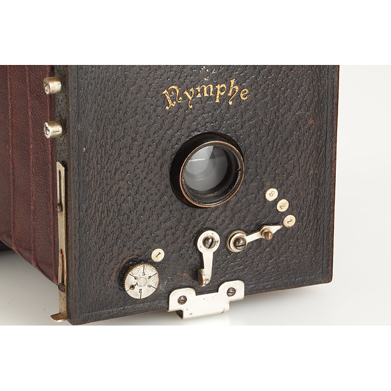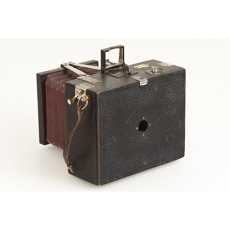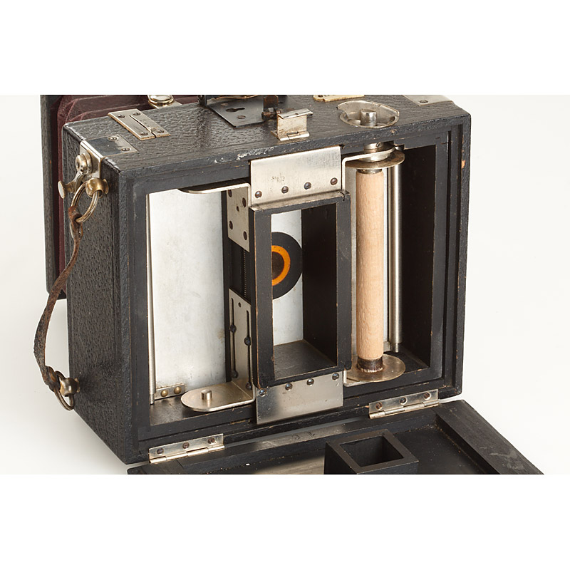 wooden leather covered strut-folding camera for roll film, very uncommon for 2.9x7.5cm exposures, shutter sticky, focusing over knob on left hand side, folding finder, a very rare and attractive German camera