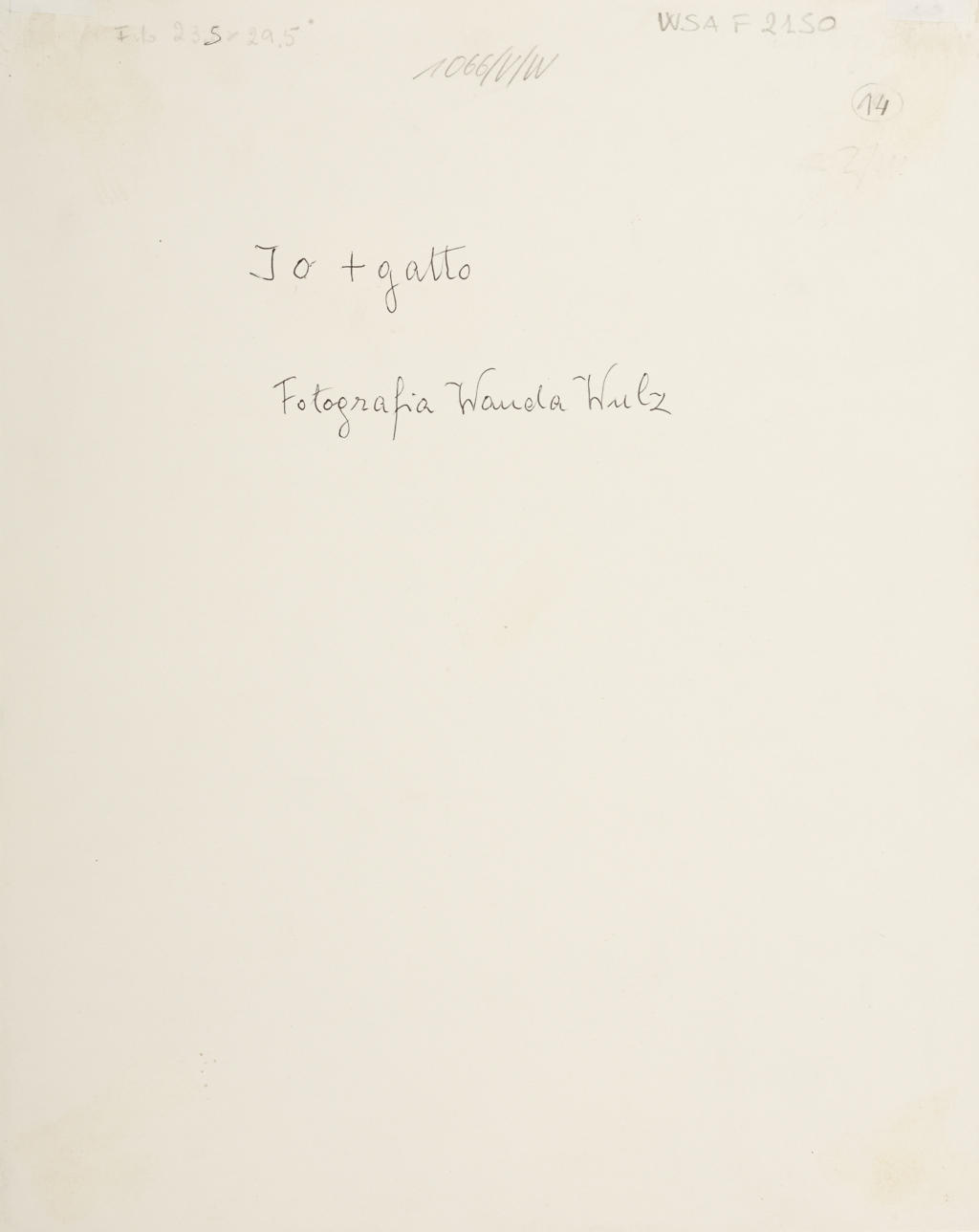 Gelatin silver print, printed in the early 1950s 29,4 x 23,5 cm (11.6 x 9.3 in) Signed and titled “Io + Gatto, Fotografia Wanda Wulz” by the photographer in ink on the reverse, diverse other numerical annotations in unknown hands on the reverse LITERATURE La Trieste dei Wulz, Florence 1989, p. 167; Cento Capolavori dalle Collezioni Alinari, Florence 2003, p. 105; L'insistenza dello sguardo. Fotografie italiane 1839–1989, Florence 1989, cover. PROVENANCE The Alinari Collection, Florence, acquired from the daughter of Wanda Wulz Wanda Wulz, Tochter einer angesehenen Fotografenfamilie aus Triest, führte ab 1928 ihr eigenes Atelier. Neben ihrer Arbeit als Porträtfotografin, widmete sie sich vor allem in den frühen 1930er Jahren der experimentellen Fotografie (Fotomontagen, Fotocollagen, Doppelbelichtungen, Stillleben). 1931 begegnet sie mit Filippo Tommaso Marinetti, einem Propagandisten des Futurismus, fortan ist sie aktives Mitglied dieser Bewegung. Mit der Aufnahme ‘Io + Gatto ’ (Ich + Katze) schuf Wulz aus einer Fotografie ihres Katers Pippo (bei der das Negativ der Katze seitenverkehrt verwendet wurde) und einem Selbstporträt, eine der bekanntesten Doppelbelichtungen der Kunstgeschichte. 1932 stellte Wulz die Fotografie bei der ‘Mostra Fotografica Futurista’ in Triest aus, wo sie als Höhepunkt der Ausstellung gefeiert wurde. Fotografien von Wanda Wulz sind extrem selten, da sie sich ab den späten 1930er Jahren der Porträtmalerei zuwandte. In den letzten Jahrzehnten sind nur fünf ihrer Arbeiten bei Auktionen angeboten worden; jüngstens ‘Futurist Breakfast’ aus der Sammlung von Margaret Weston (Sotheby’s New York 25.04.2007, Lot 36). Die vorliegende Fotografie, in den frühen 1950er Jahren geprintet, kommt aus der Sammlung Alinari in Florenz. Nur zwei weitere Abzüge von ‘Io + Gatto’ sind bekannt. Einer befindet sich in der Sammlung des Metropolitan Museum (Sotheby's New York, Italian Futurist Photographs Sale, November 9, 1982, Lot 72, vorher in der Sammlung von Giovanni Lista), der andere im Museo Alinari in Florenz. Wanda Wulz, daughter of a respected family of photographers from Trieste, led her own studio from 1928. In the early 1930s, in addition to her work as a portrait photographer, she concentrated mainly on experimental photography (photo montages, photo collages, double exposures, still life). In 1931, she met Filippo Tommaso Marinetti, a propagandist of Futurism, and from then on she was an active member of this movement. Her self-portrait ‘Io + Gatto’ (Me + Cat), where she superimposes a photo of her cat Pippo on top of an image of herself, is one of the most famous double exposures in art history. In 1932, Wulz presented the photograph in the ‘Mostra Fotografica Futurista’ in Trieste, where it was hailed as the highlight of the exhibition. Photographs of Wanda Wulz are extremely rare, as in the late 1930s she turned to portrait painting. In recent decades only five of her works have been offered at auction, the most recent being 'Futurist Breakfast' from the collection of Margaret Weston (Sotheby 's New York 25.04.2007, Lot 36). The present photograph, printed in the early 1950s, comes from the Alinari collection in Florence. Only two other copies of ‘Io + Gatto’ are known, one is located in the collection of the Metropolitan Museum (Sotheby's New York Italian Futurist Photographs Sale, November 9, 1982, Lot 72, formerly collection Giovanni Lista), the other one in the Museo Alinari in Florence.