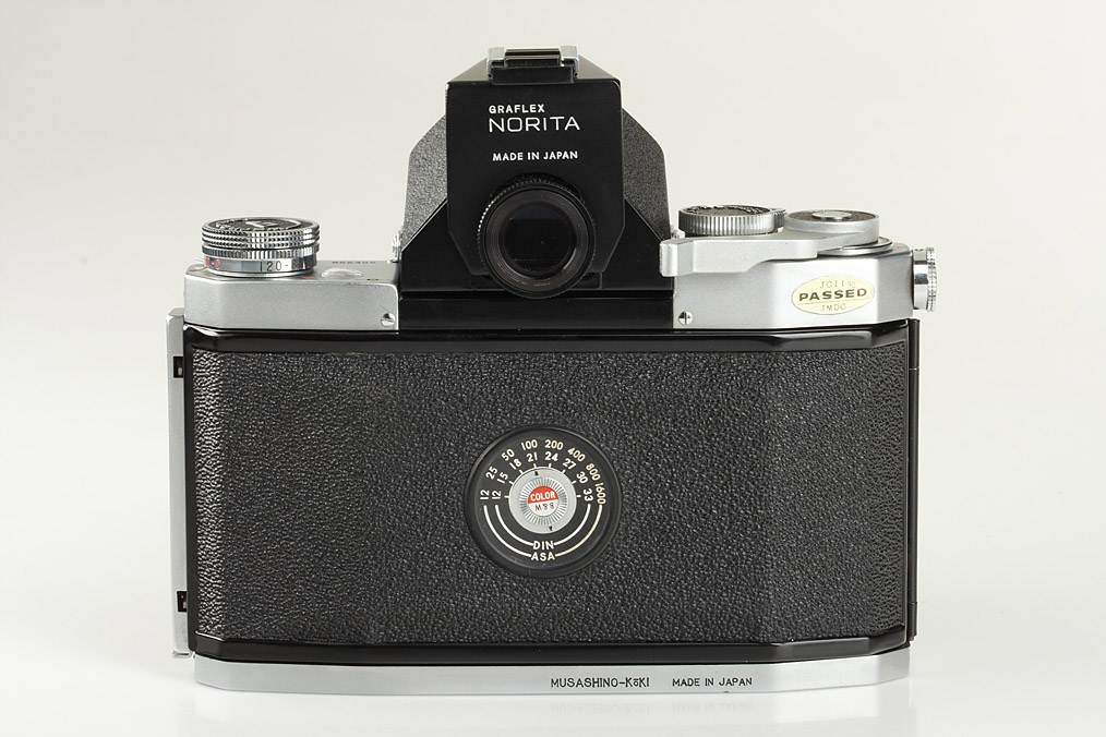 6x6cm SLR for 120/220 film, rare name variation of the Norita, chrome version, in excellent condition, body with prism finder, Noritar 2/80mm no.4010034, cap, black painted Graflex Noritar 4/240mm no.4190221 (caps, keeper)