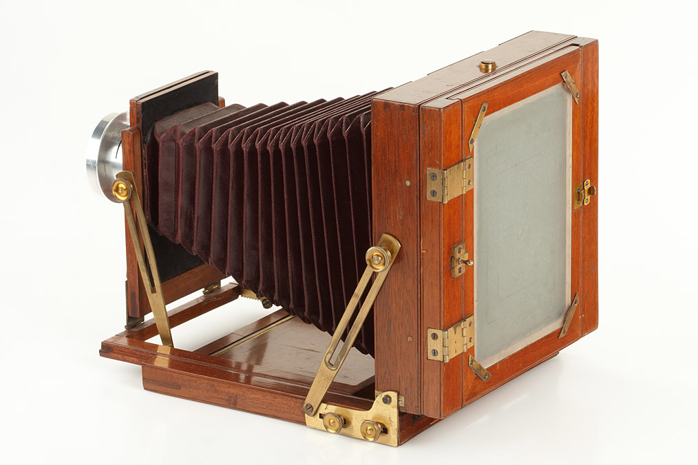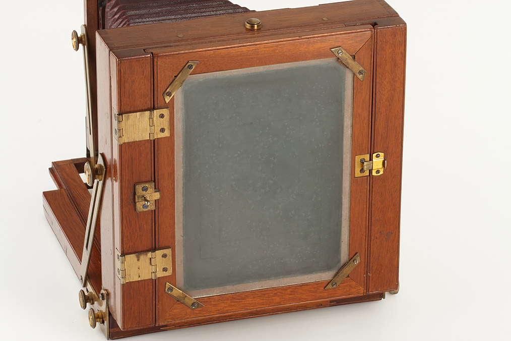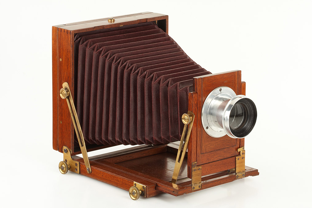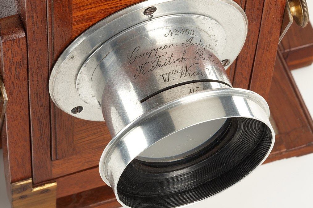 very attractive 13x18cm wooden camera in fine condition with aluminium K.Fritsch-Prokesch Gruppen-Antiplanet 45/250mm no.463, caps, 6 waterhouse stops, 3 platefilm holders, Lumiere orange filter in maker's box, case