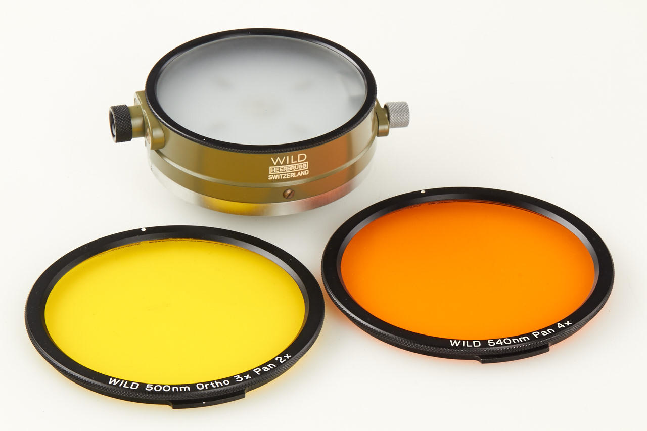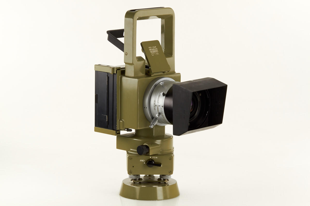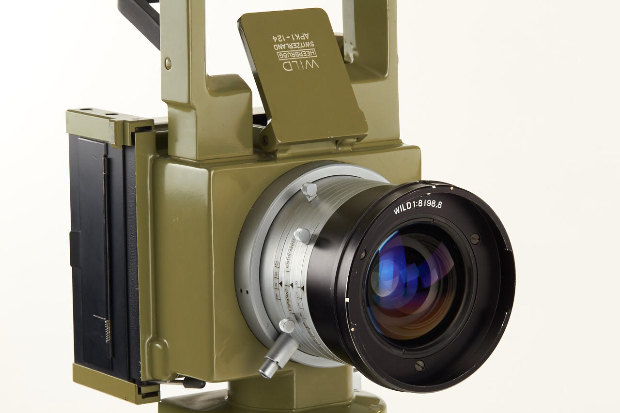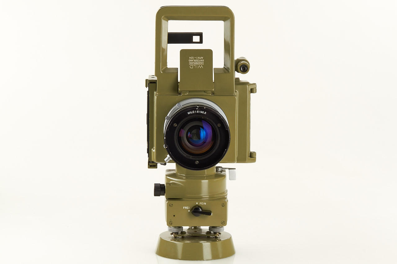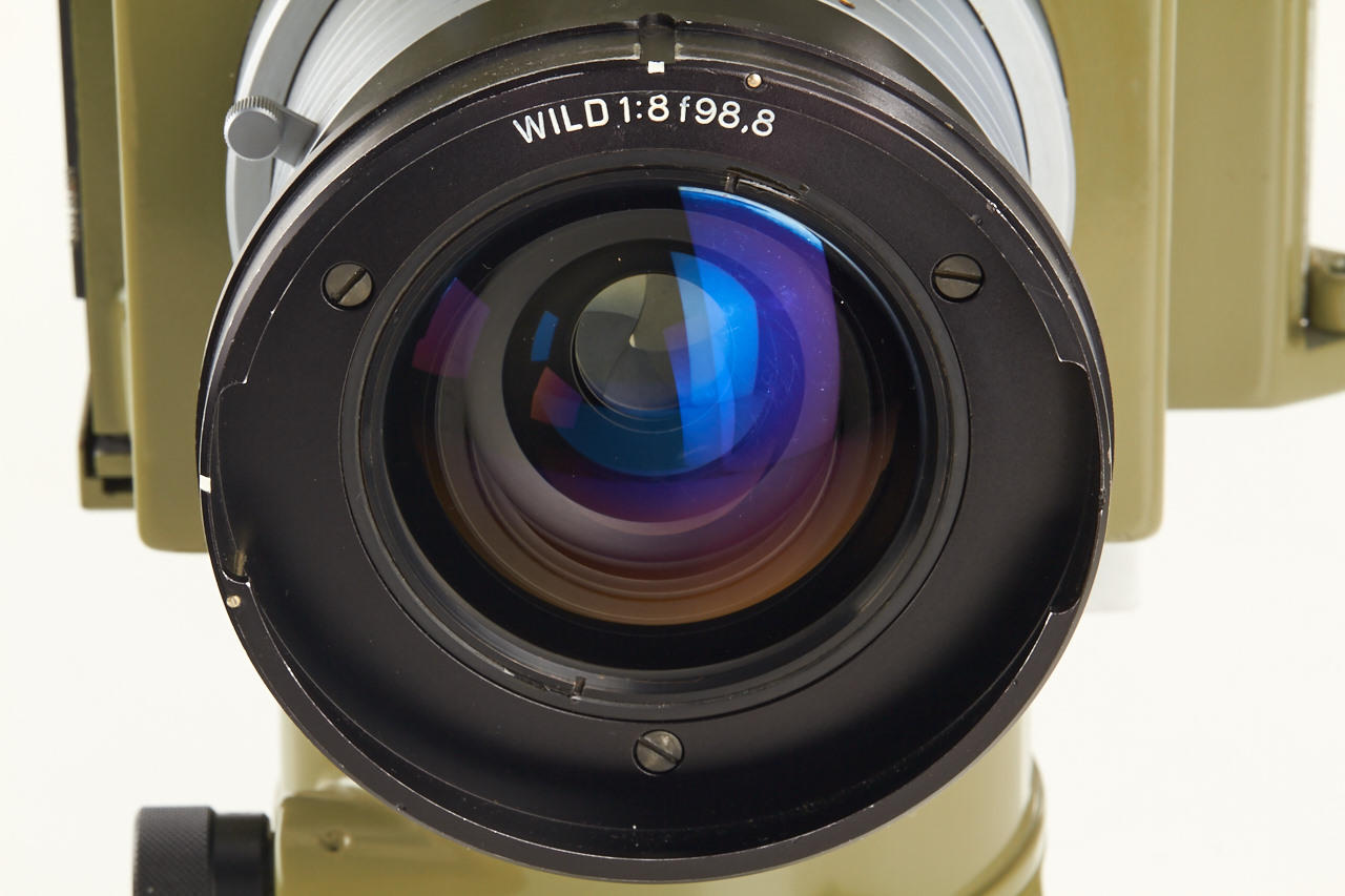 very rare 4x5" wide angle panoramic camera for seven single exposures on standard 4x5" film holders, one of only few examples made, with Wild 8/98,8mm lens, complete outfit with large wooden tripod, Wild compass, Gossen Sixtar light meter, orange and yellow filter, 6 Linhof double film holders, Polaroid holder, hood, cap and military backpack for the outfit