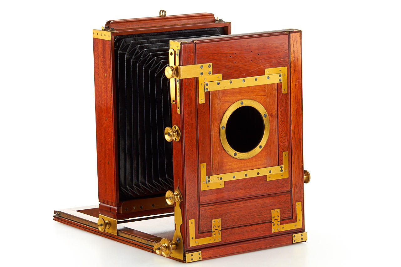 well made 18x24cm mahogany field camera in beautiful condition, with three lens boards, seven wooden double film holders, large case for the camera and for the film holders, provenience: Austrian archduchess Marie Therese von Braganza