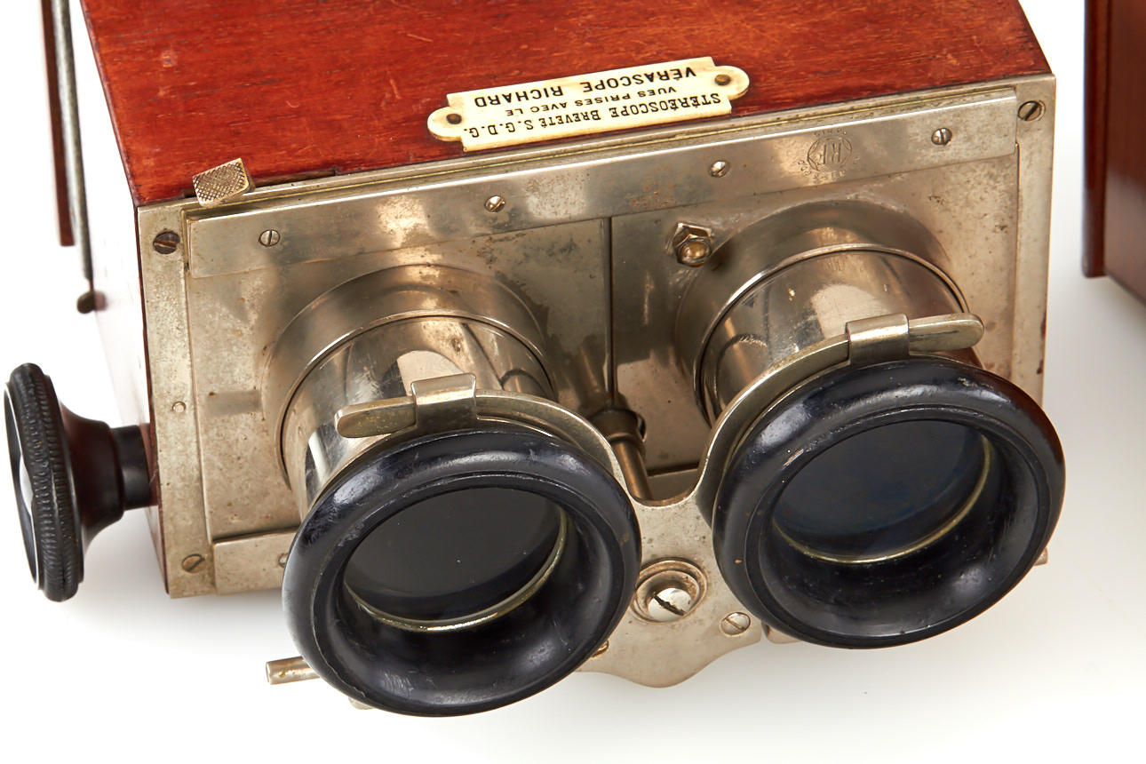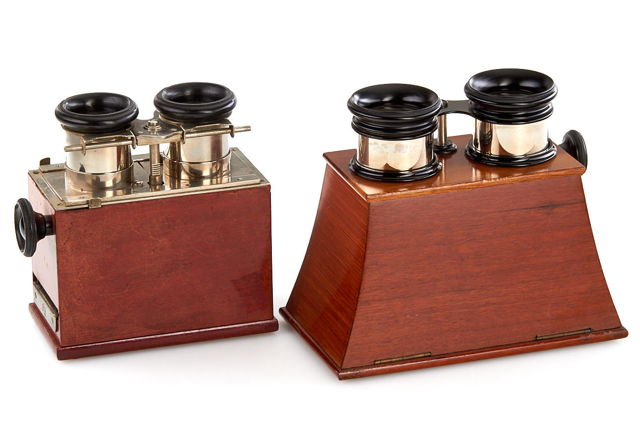 two wooden stereo viewers in excellent condition: (1) unmarked (probably German) viewer for 8x16cm plates or prints, (2) Richard Verascope viewer for 45x107mm plates, both viewers in excellent condition