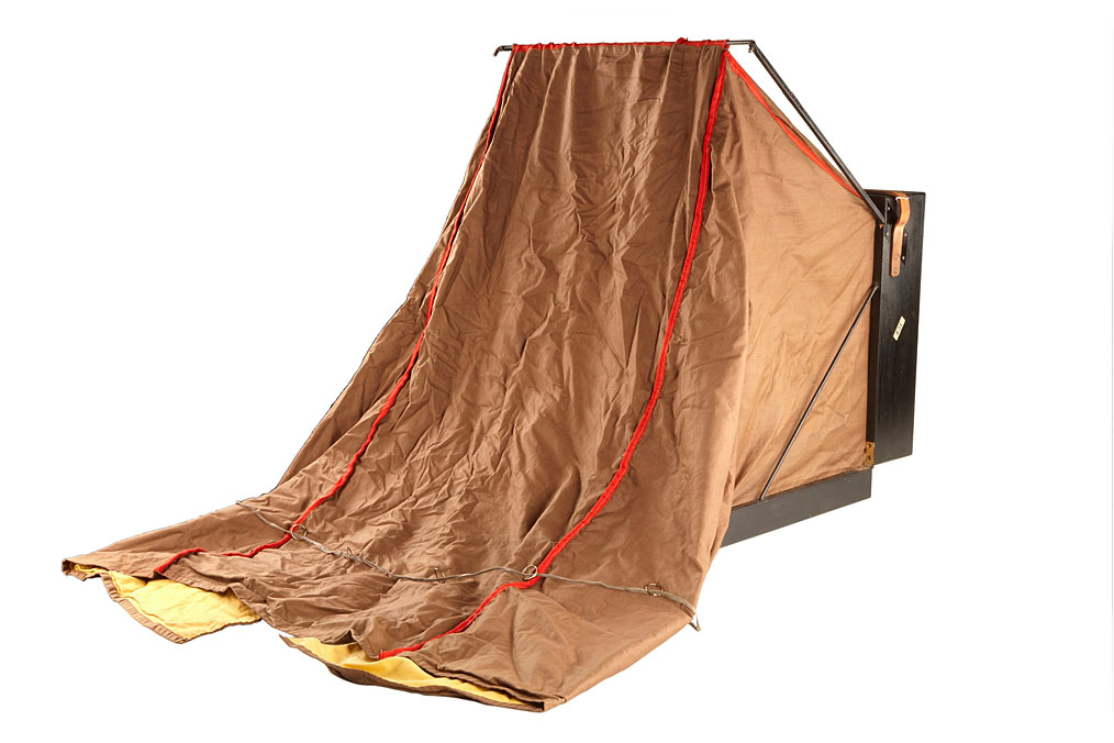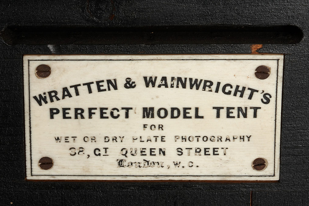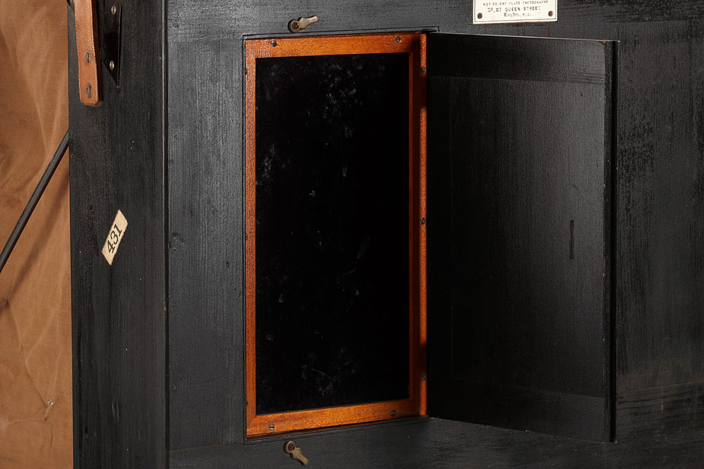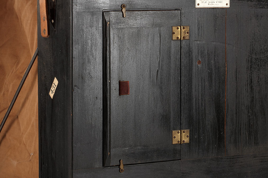 Perfect Model Dark Tent, ebonised wood body, the body sections with opening doors to revealing a red safelight window and drainage channel, yellow and brown light-tight cloth, metal support rods, internal cupboard holding chemical bottles, with leather carrying strap, in maker's case, mounting frame, a very rare outfit for wet or dry plate photography - ex Jim Barron Collection