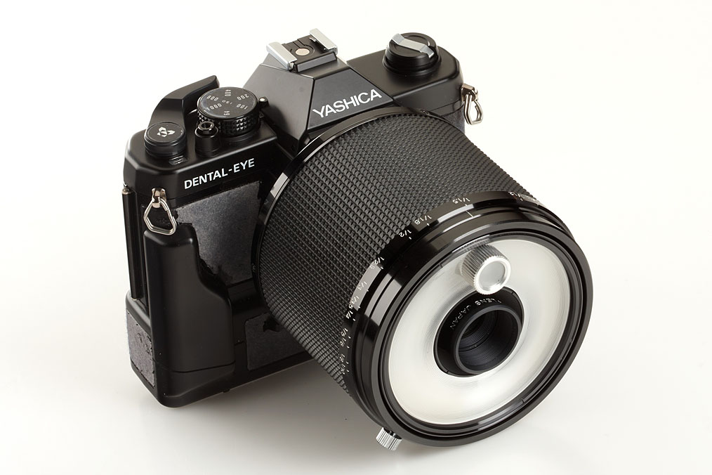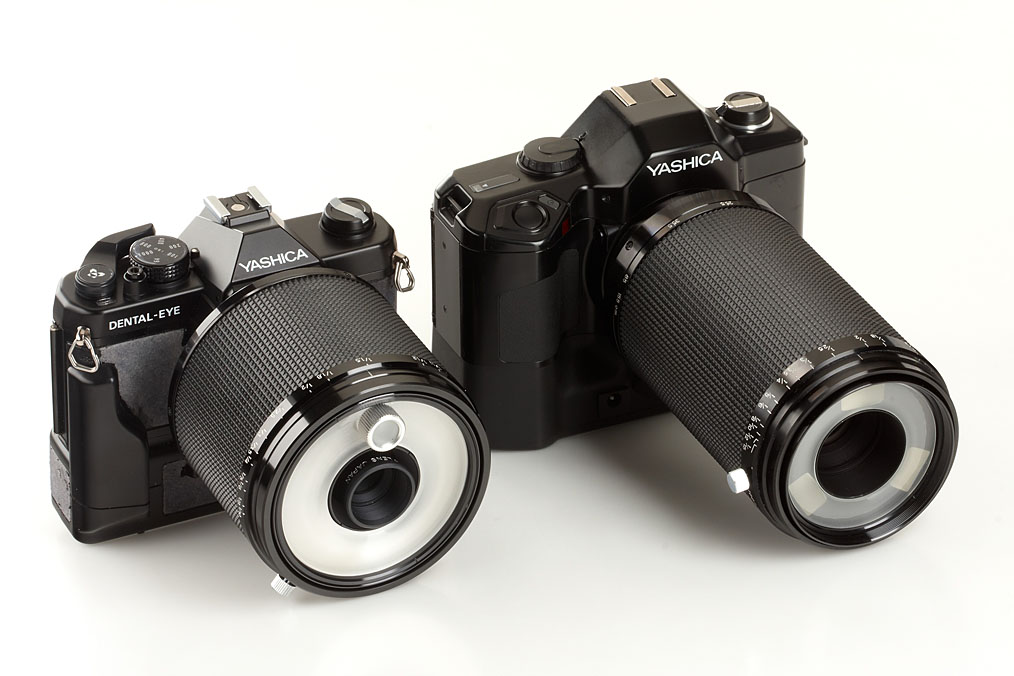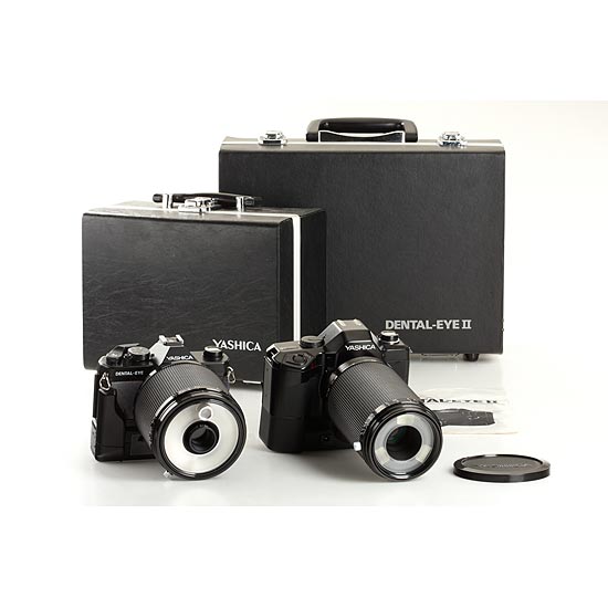 (1) early version (missing leather covering) with 4/55mm lens and built-in flash (not tested), cap, instructions, eye-cup, carrying case, (2) Dental-Eye II with 4/100mm lens with built-in flash (working), strap, cap, instructions, carrying case (2)
