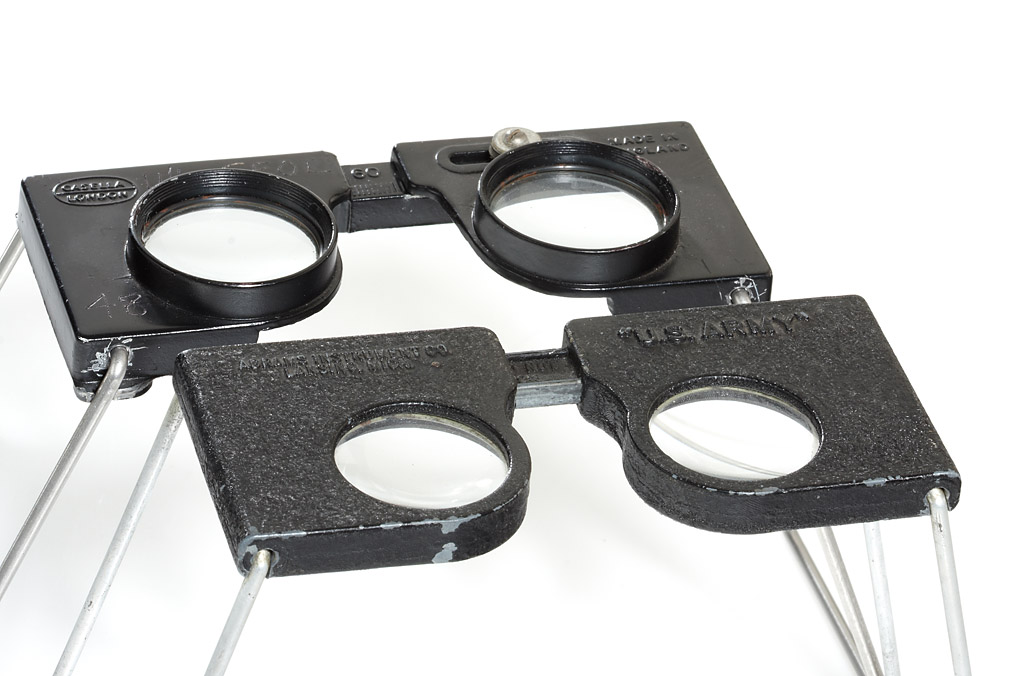 lot of three folding stereoscopes for military field use, (1) contemporary Zeiss Aerotopograph for use in photogrammetry, with micrometer adjustment, in mint condition, (2) folding viewer produced for the U.S. Army by Abrams Instrument Co., cast aluminium body with enamel finish and wire stands, in good condition, (3) 'Casella Stereoscope London', in used condition. (3)