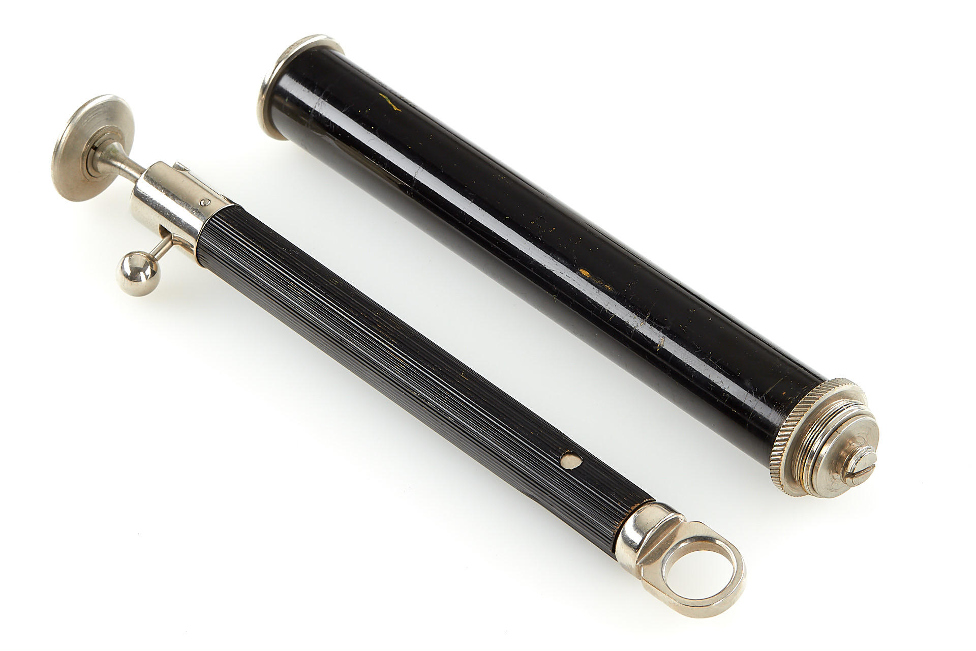 (1) very rare table tripod with chain ('Made in Germany' engraved), (2) thin monopod with ball head, (3) black/chrome/nickel tilt head, (4) black/nickel Duotar adjustable tripod head, (5) mint Micrometer focusing device 5522/5 in maker's box, (6) nickel tripod plate, (7) black tripod head with handle for use with large wooden tripod legs