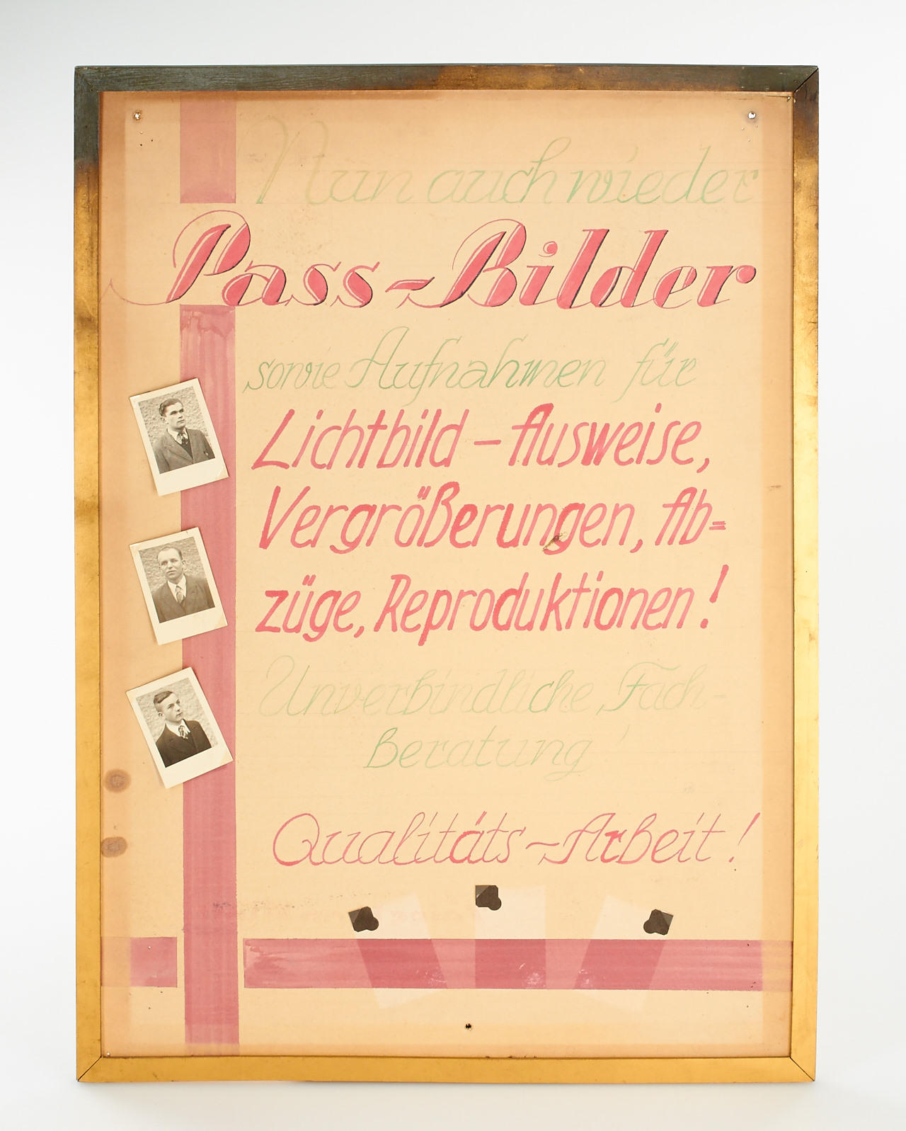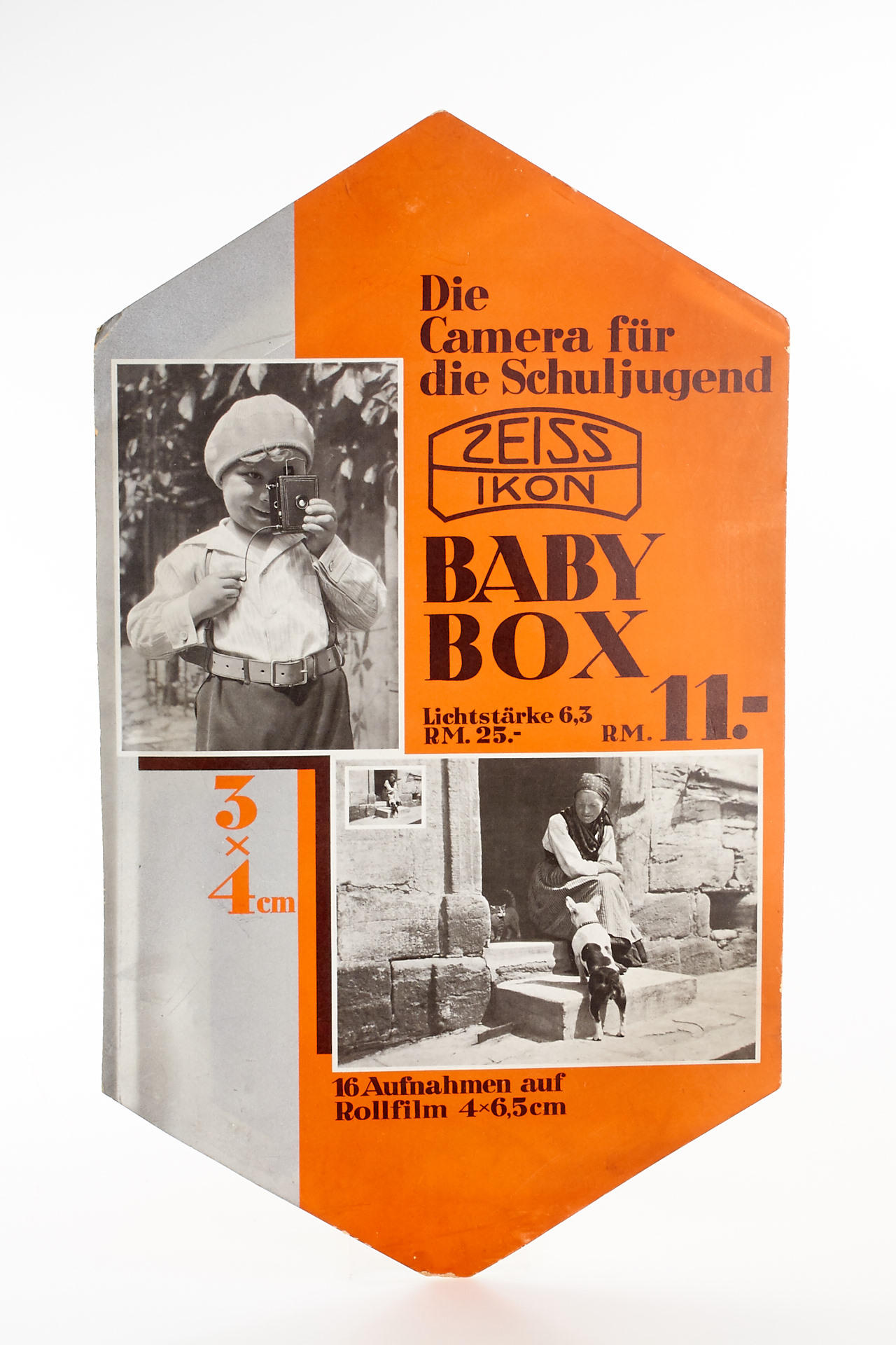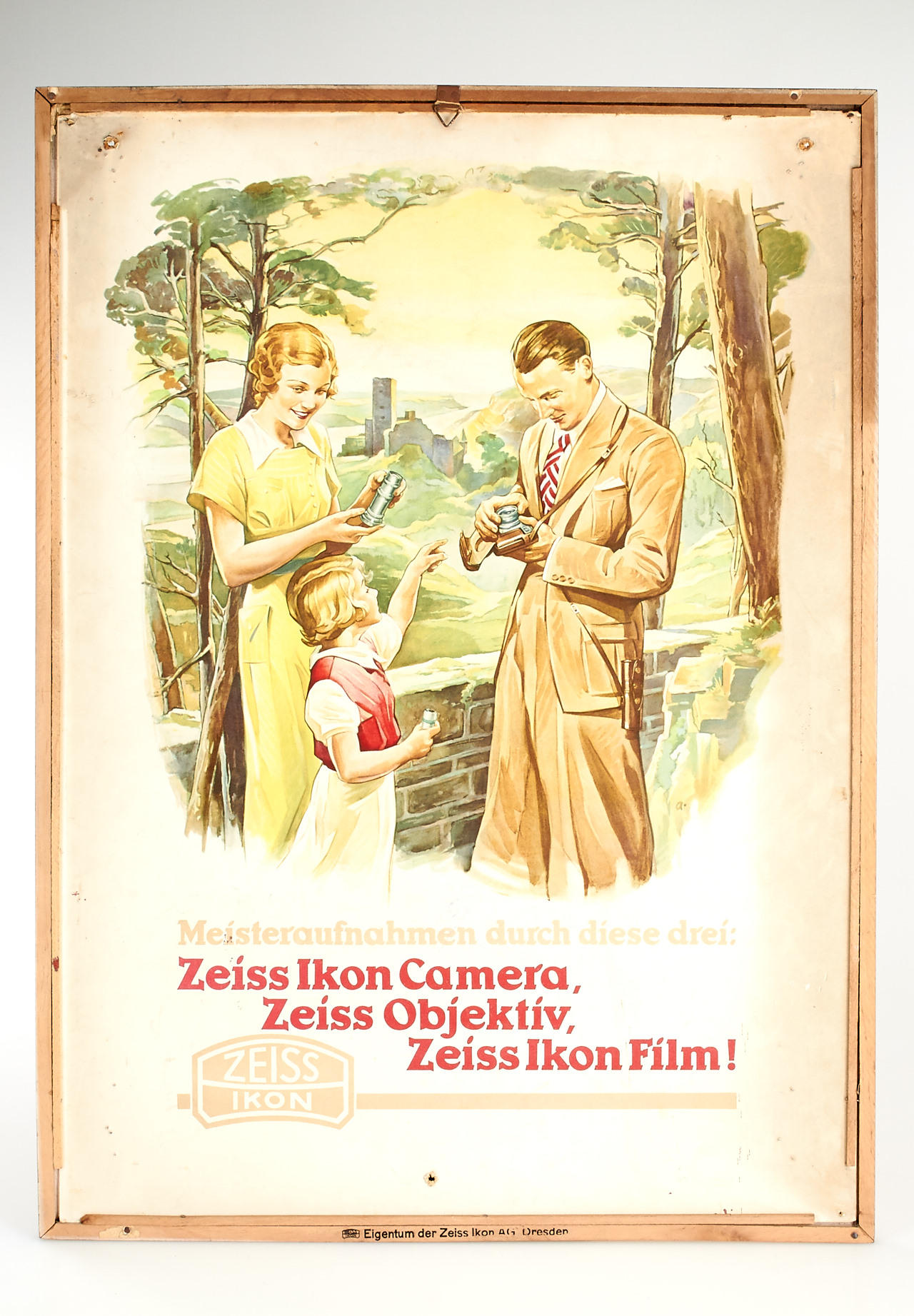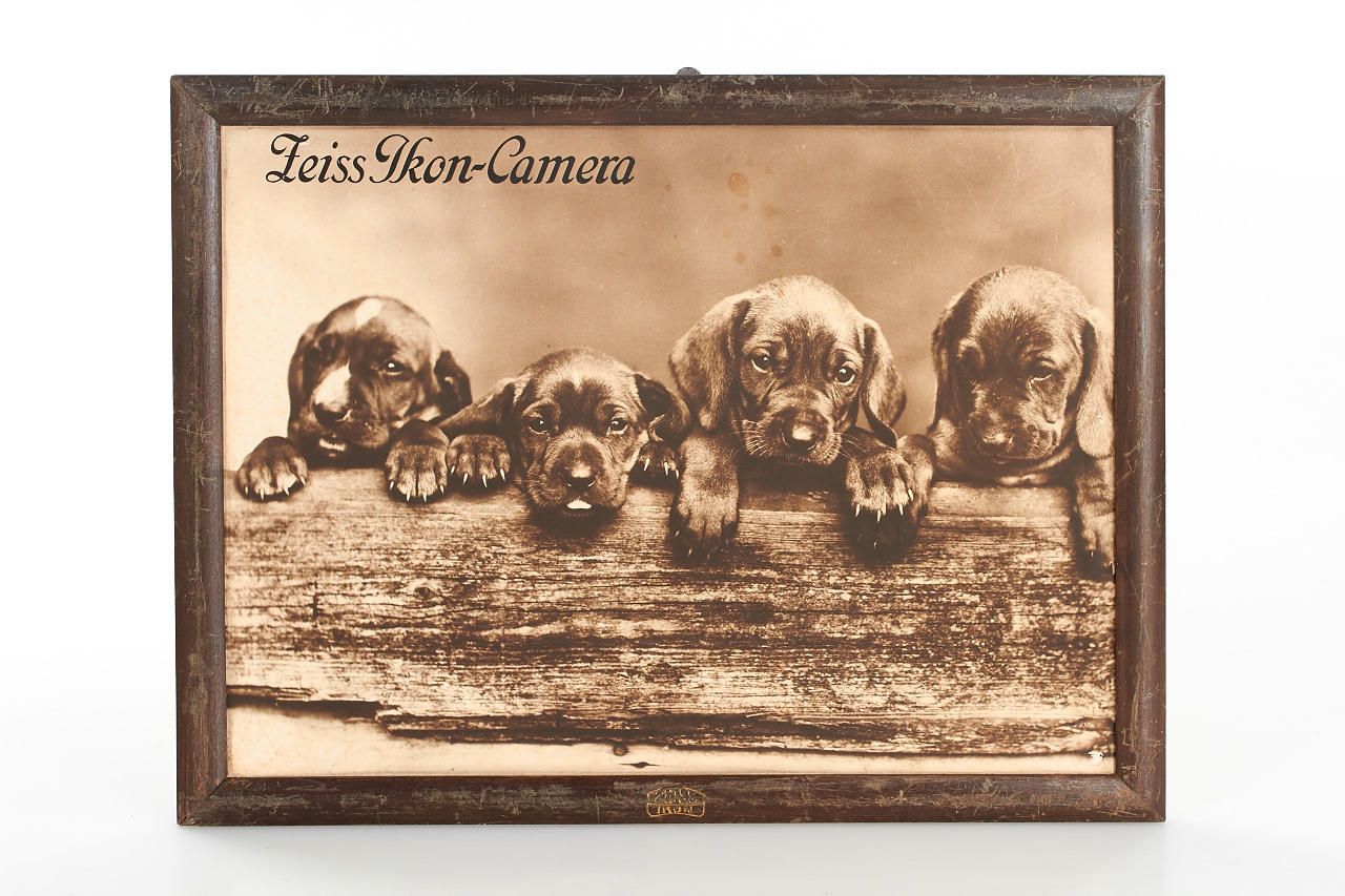 framed Zeiss Ikon advertising photograph (c.43x32cm) in original frame, together with Zeiss Ikon Baby Box cardboard sign (c.64x38cm) and framed Zeiss Ikon advertisement (c.70x50cm) with hand-written advertising slogans on reverse