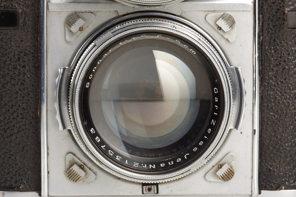 extensive outfit in fine condition including camera no.A.U.49889 (matching serial number in back door, shutter working), Sonnar 1.5/5cm no.2135783 (cap), Sonnar 2/5cm no.1930562 (cap), Sonnar 2/8.5cmm no.2041025 (cap, keeper), Triotar 4/8.5cm no.1504542 (cap, keeper), Sonnar 4/13.5cm no.2071507 (cap), very rare hood for Sonnar 1.5/5cm, very rare prism finder 860/46A, everready case, extremely rare tripod adapter with accessory shoe