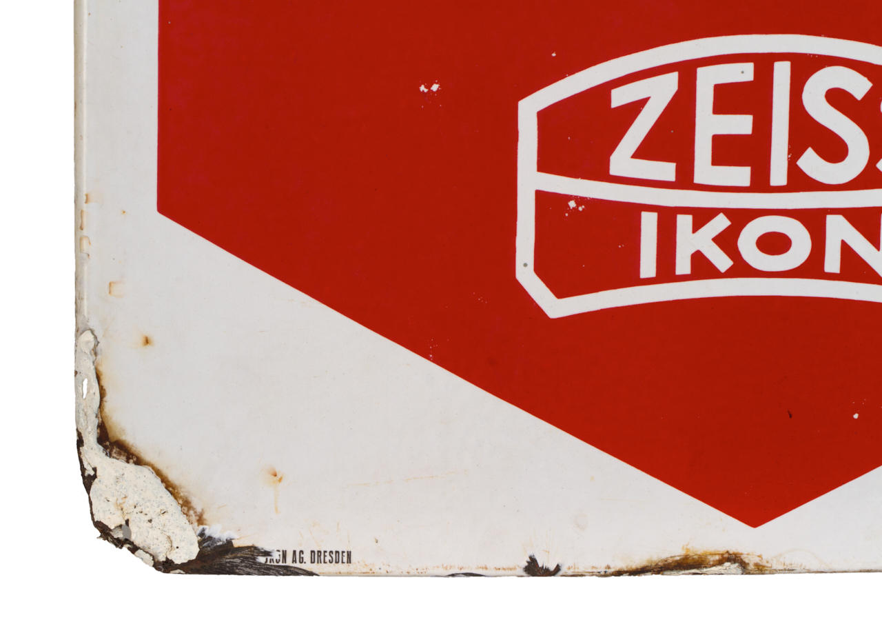 98x48cm large enamel sign with folding rollfilm camera, edges and back repainted to prevent corrosion