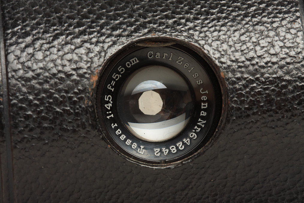 very rare Zeiss detective monocular camera for plates 4.5x6cm, Tessar 4.5/5.5cm no.642842, focusing adapter, in original condition with Japanese rollfilm holder and case