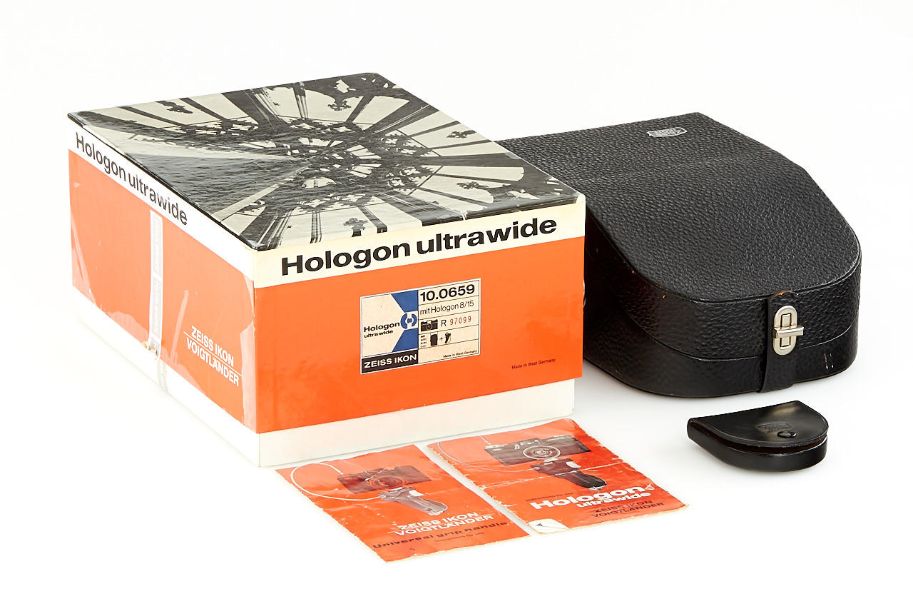 35mm ultra wide angle camera in near mint condition and in perfect working order, Hologon 8/15mm no.4851323, with center filter, caps, grip with cable release, instructions, case and maker's box