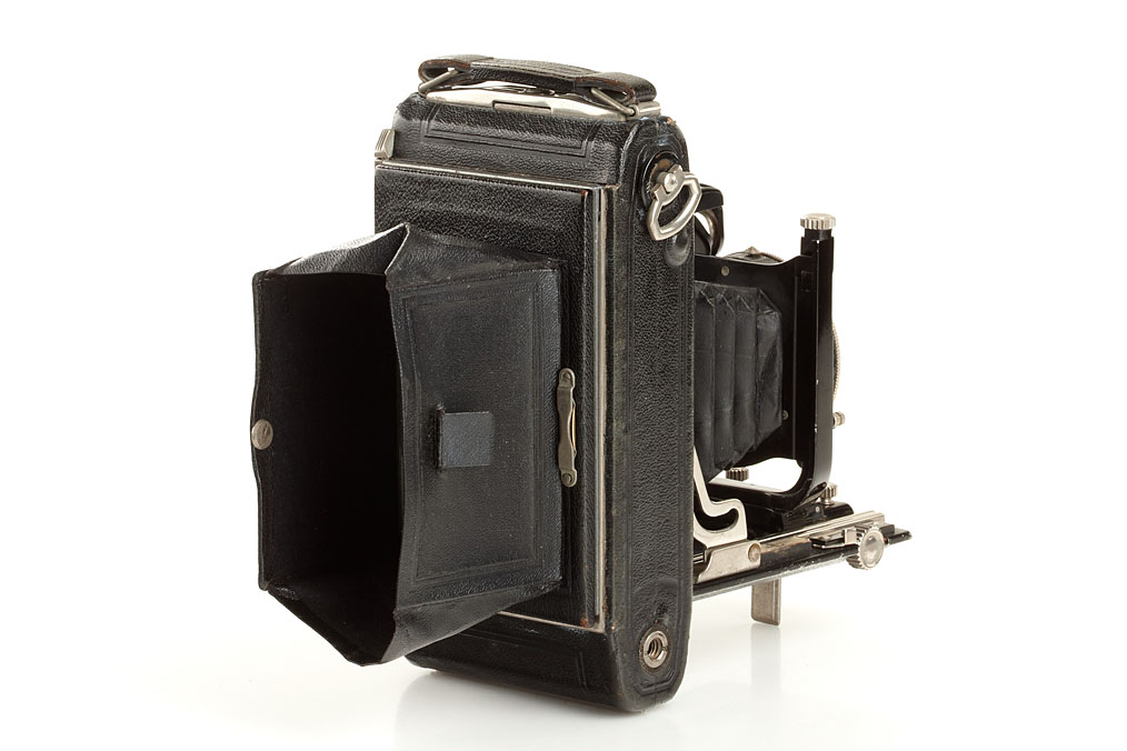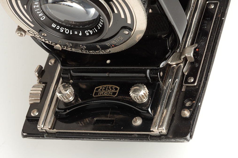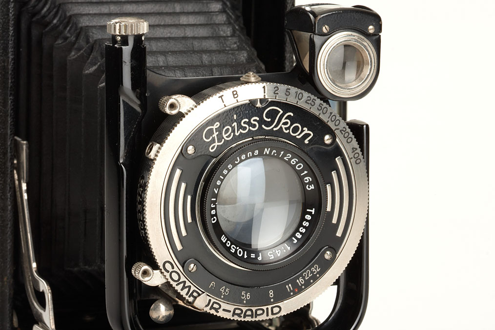 6.5x9cm for plates and roll film, sought after model, early export version with nickel fittings, Tessar 4.5/10.5cm no.1260163 in Compur-Rapid shutter, with fix mounted viewfinder 433/20, in good condition
