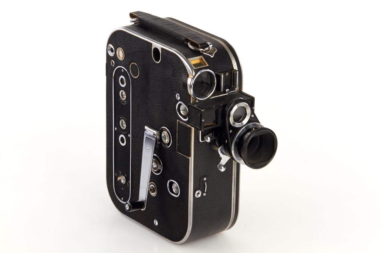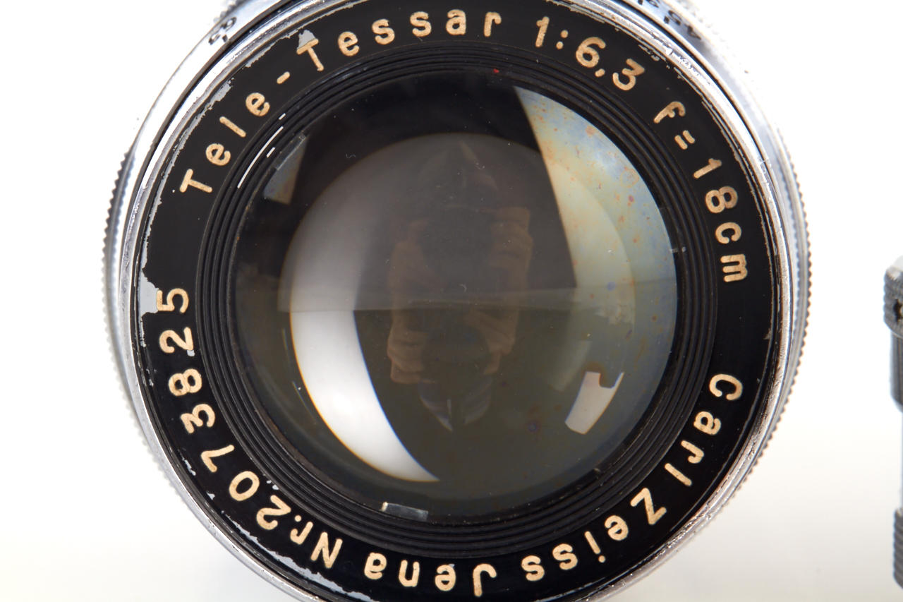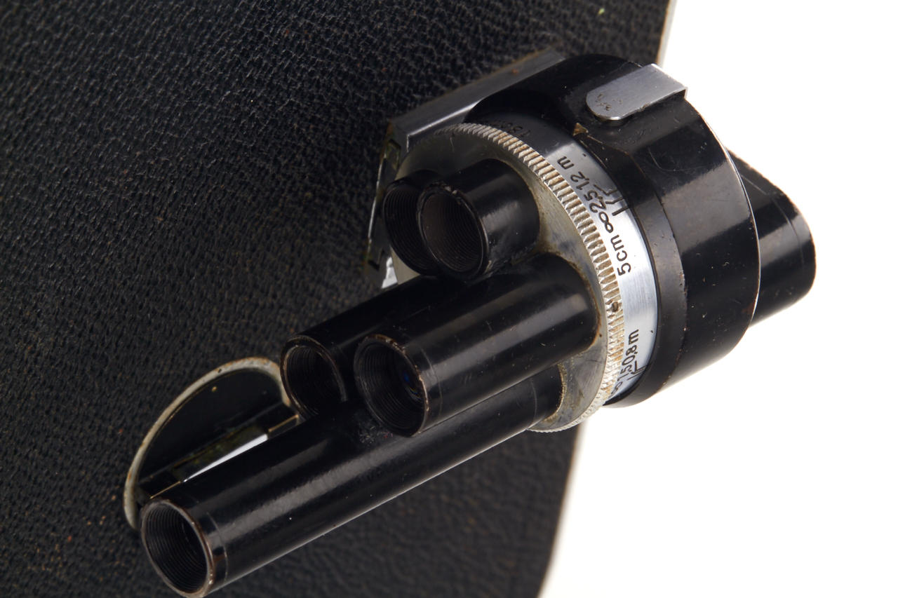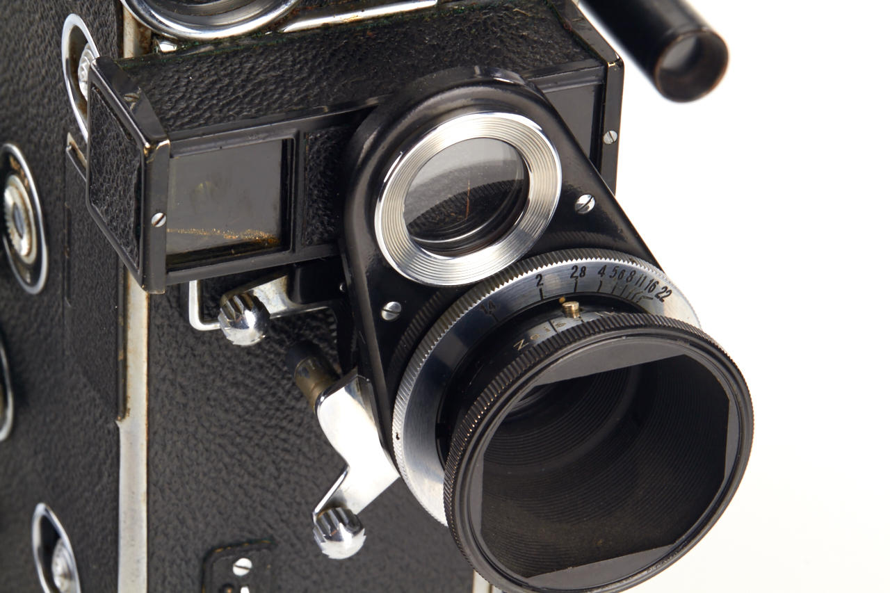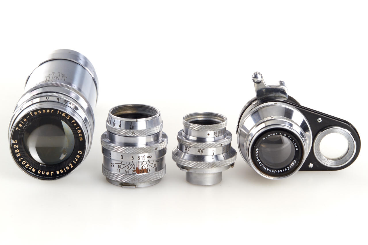 16mm spool load camera in very good working condition, with a complete set of 5 lenses: Tessar 2.7/2cm no.1121145, Sonnar 1.4/2.5cm no.1914293 (hood), Sonnar 2.8/5cm no.2014879, Sonnar 2.8/7.5cm no.2254559 (hood), very rare Tele-Tessar 6.3/18cm no.2073825, matching, very rare 436/21 viewfinder for every lens from 2cm to 18cm, red leather outfit case
