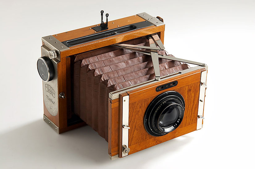 rare Nettel tropical 10x15 cm, in fantastic original condition, working shutter, Tessar 4.5/18 cm no. 938166, cap, filter, 3 original teak plate-holders, case, instructions, beautiful and complete outfit