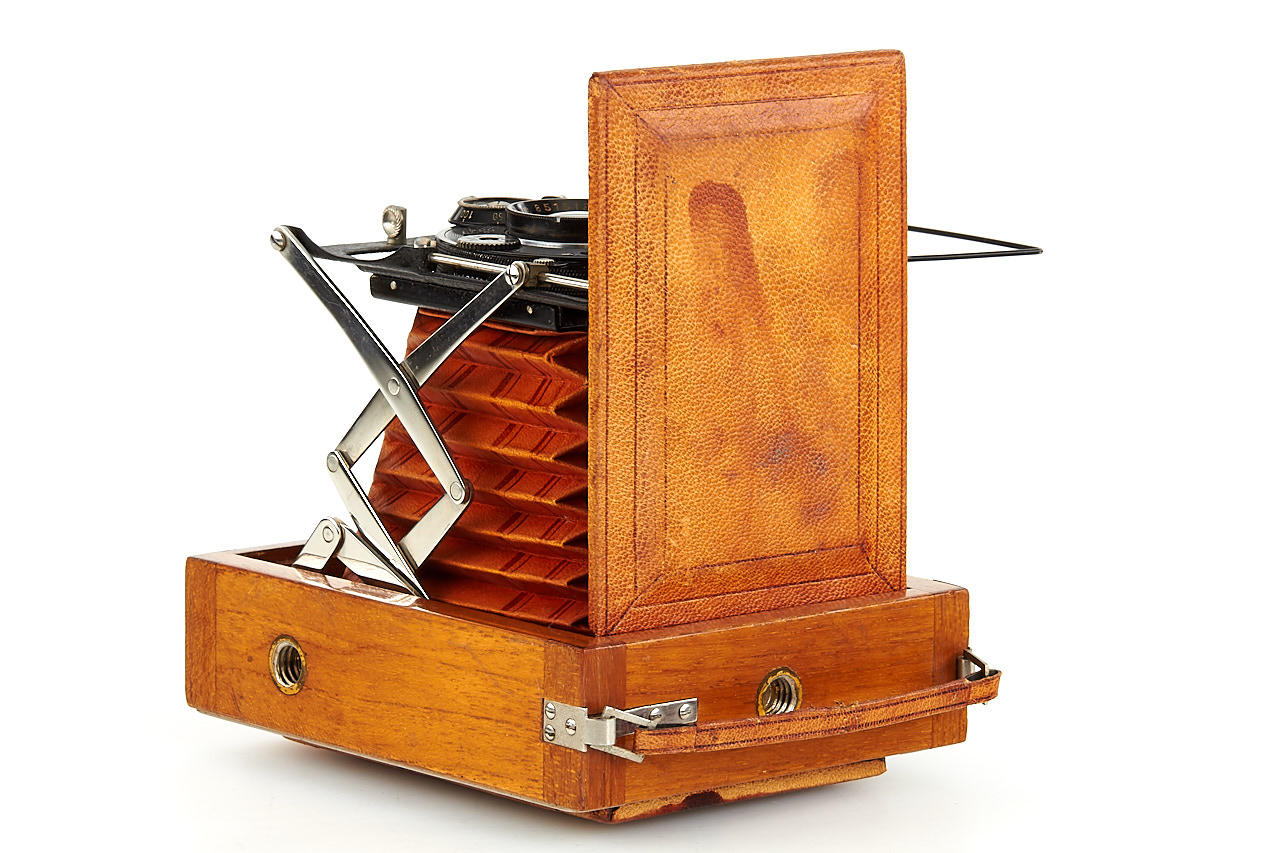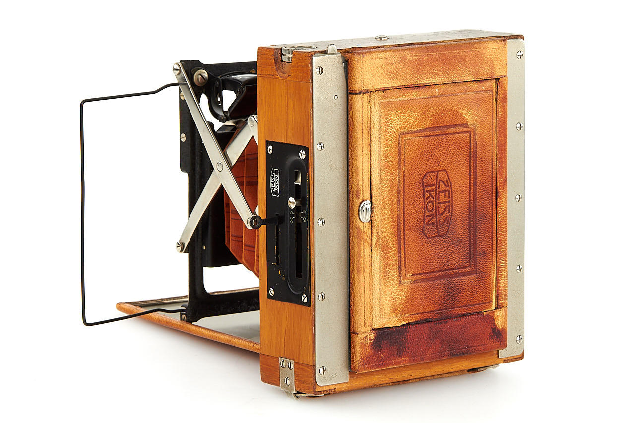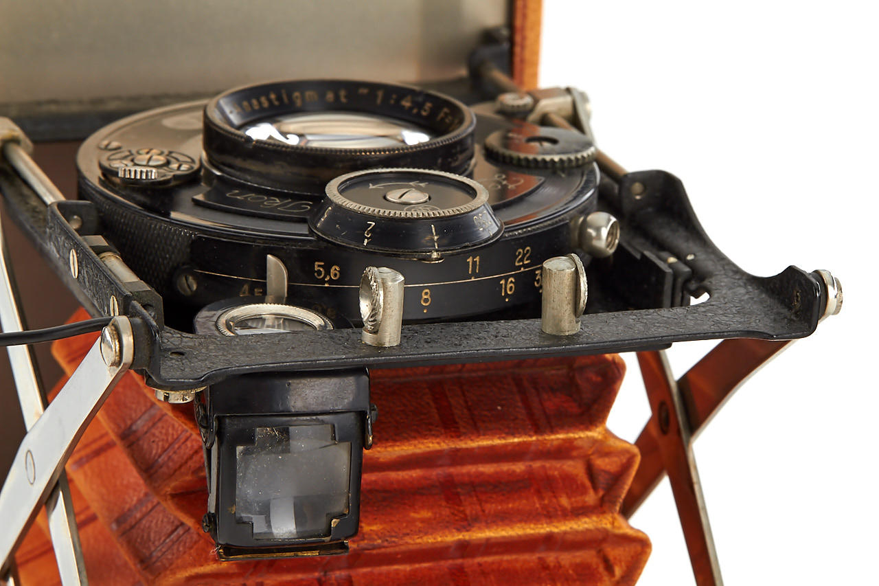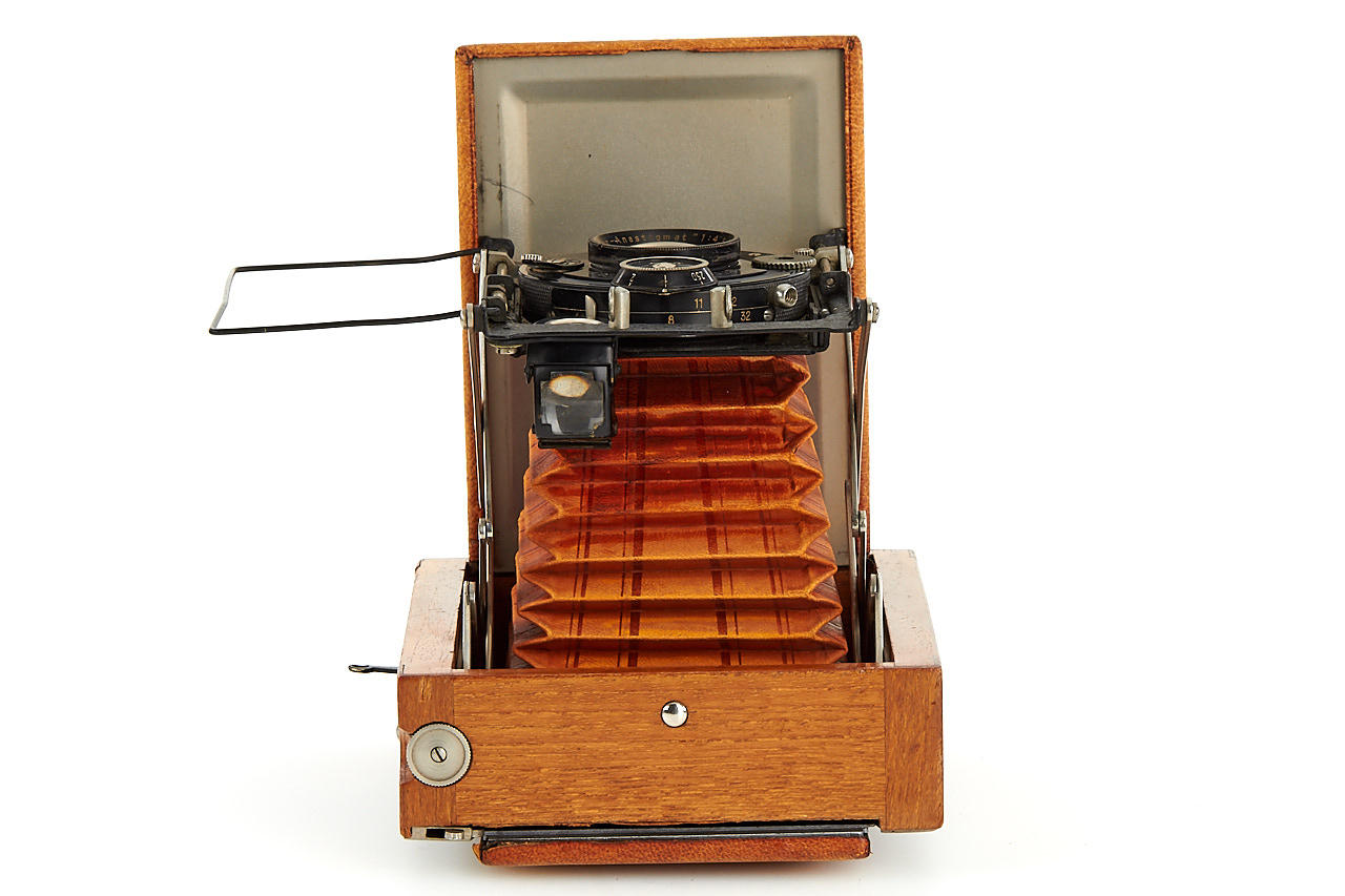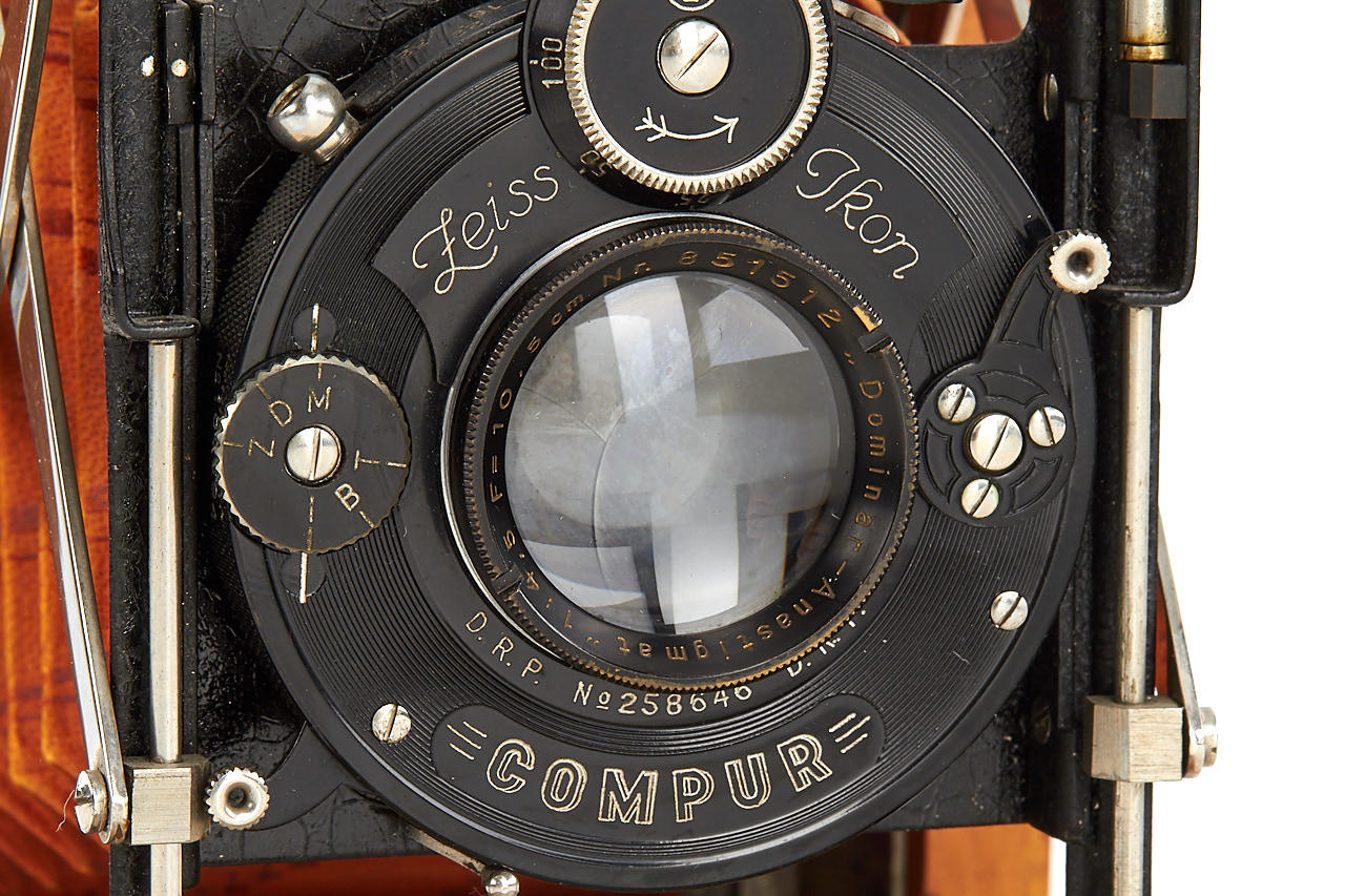 rare tropical camera for 6.5x9cm, brown leather bellows, uncommon Dominar-Anastigmat 4.5/10.5cm no.851512 in Compur shutter, with matching focusing screen back, in excellent condition
