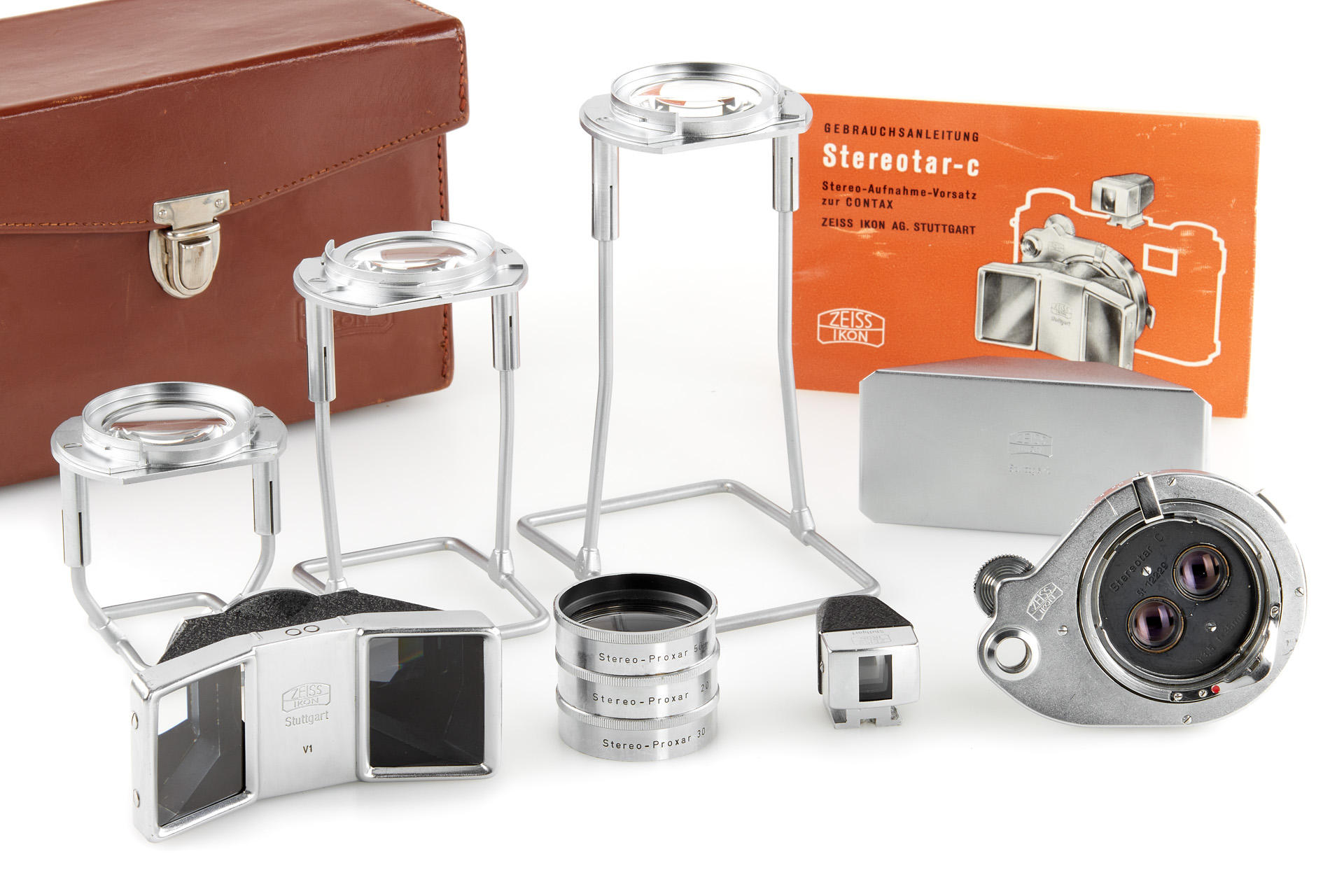 810/01 Stereotar C outfit in good condition, good lenses showing a light scratch, with prism (minor cleaning marks), Stereo 420 finder, 3 Stereo-Proxar lenses, and German manual, in leather outfit case, this set includes the rare 810/13, 810/9 and 810/6 close up attachments