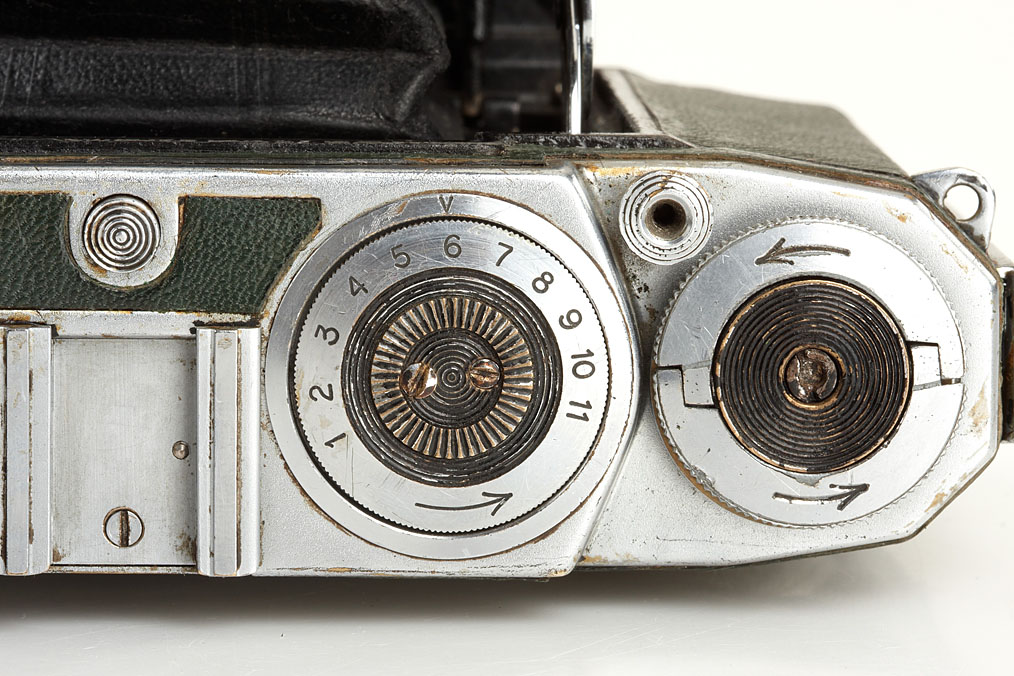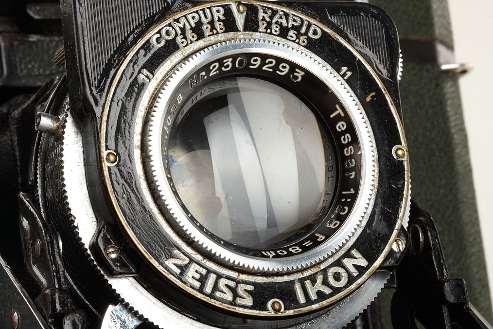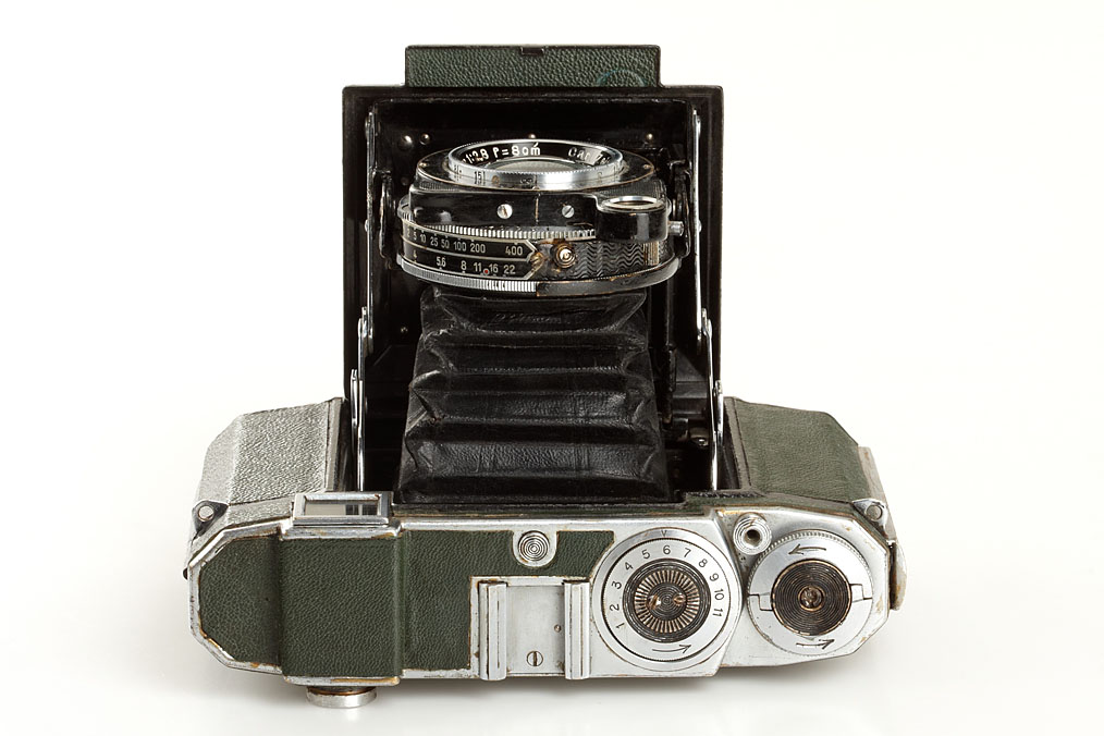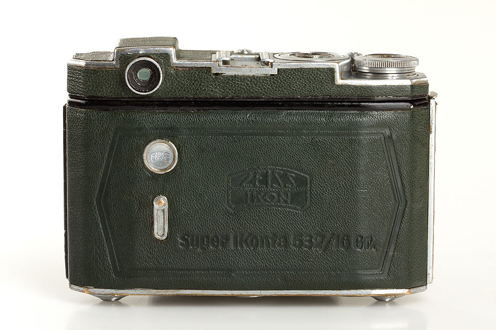 very rare prototype or design model with green leather covering, the back is marked with the Zeiss Ikon logo and Super Ikonta 532/16 Gr., no serial number, with Tessar 2.8/8cm no.2309293 in Compur-Rapid shutter