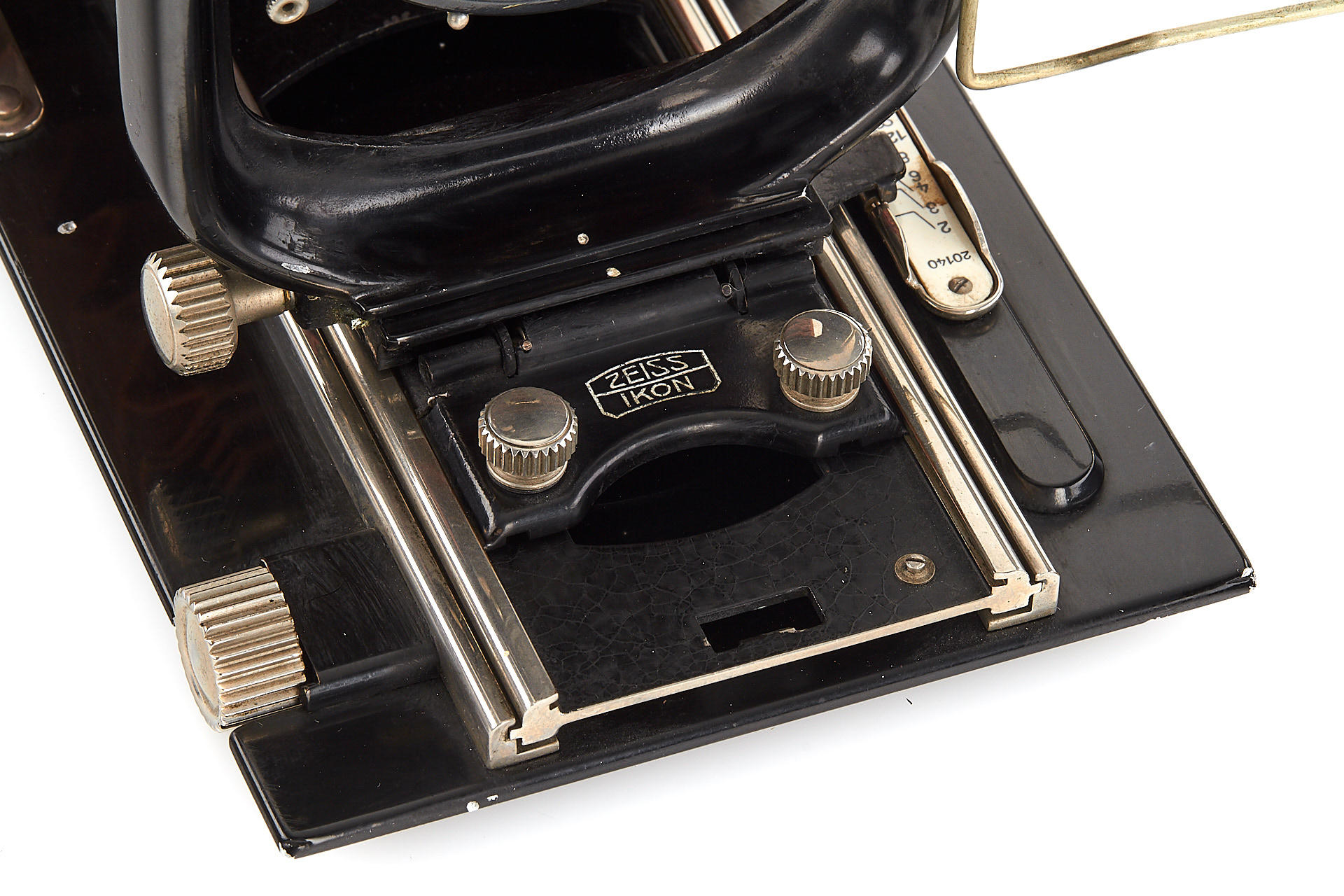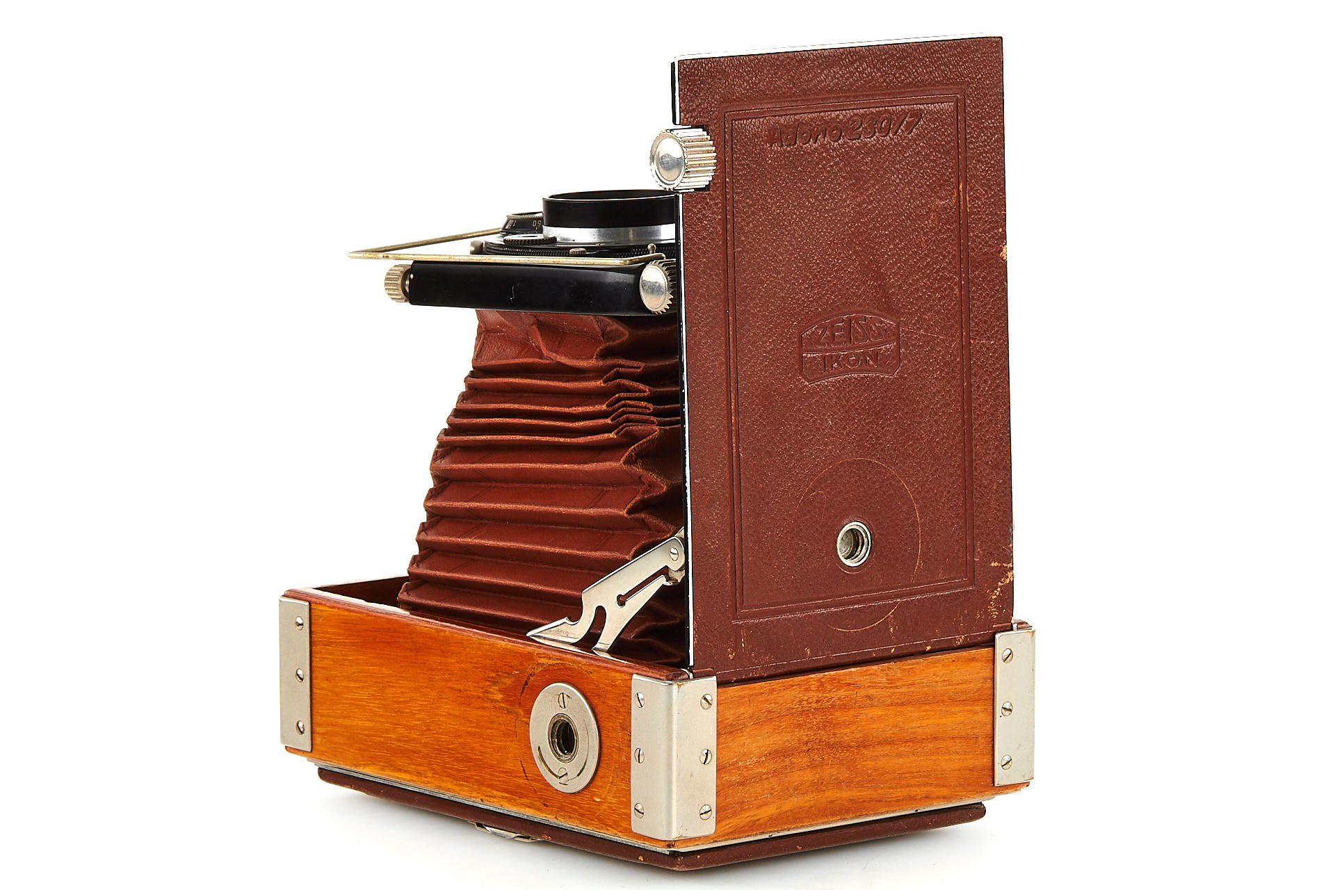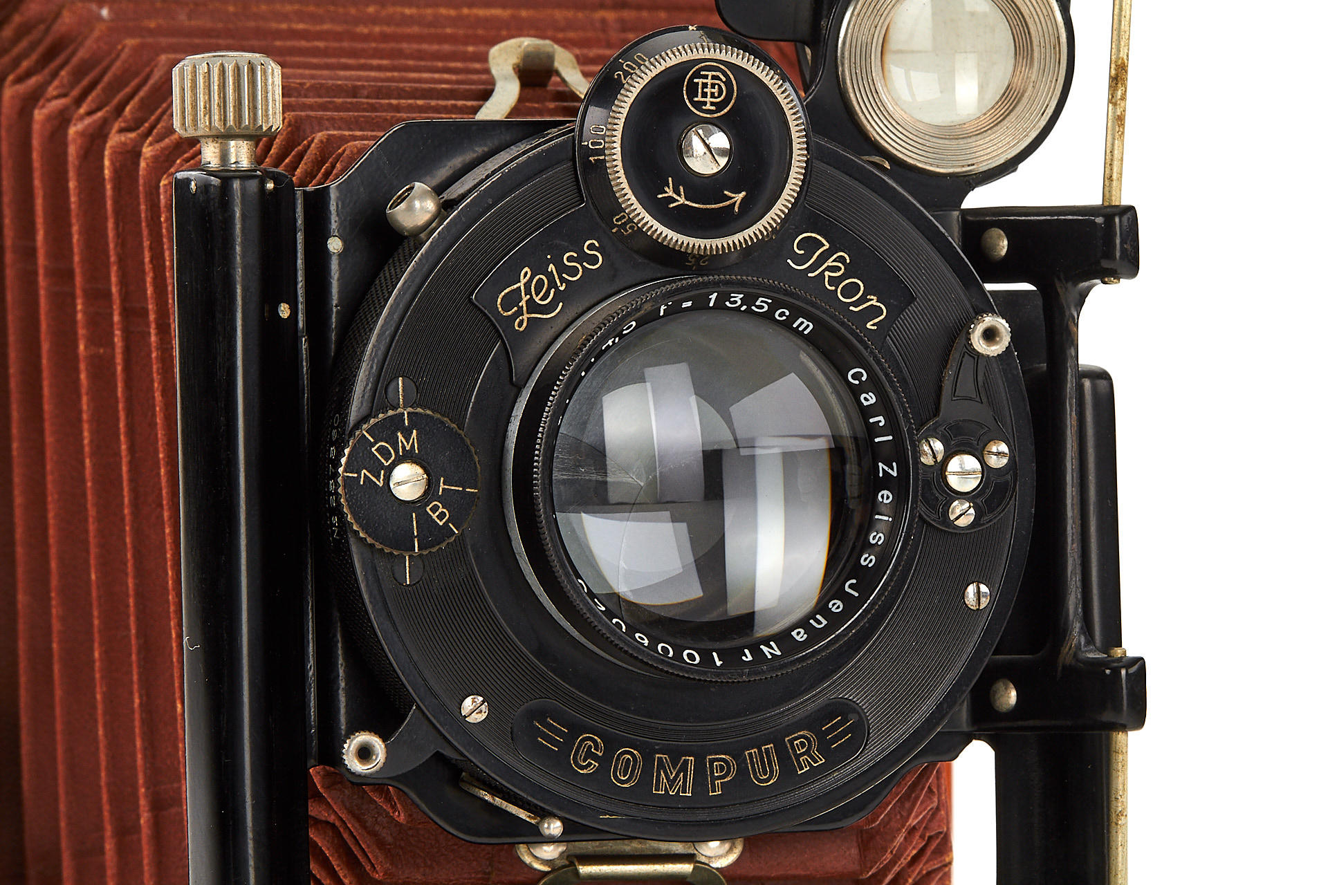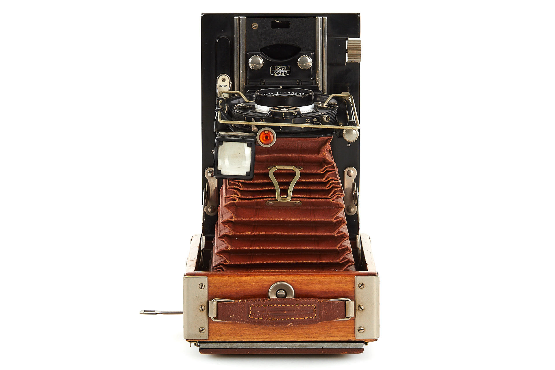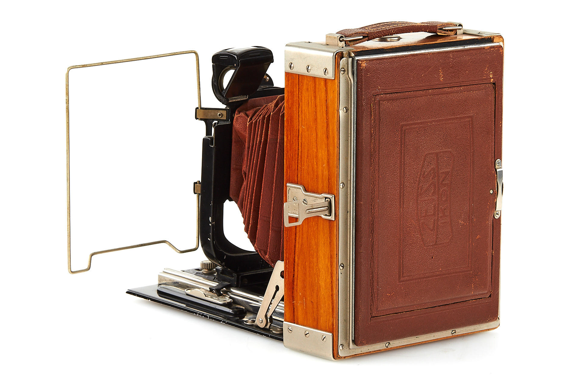 tropical camera for 9x12cm plates, polished teak, brown leather bellows, reinforced edges, with Tessar 4.5/13.5cm no.1006020 in Compur shutter, excellent condition