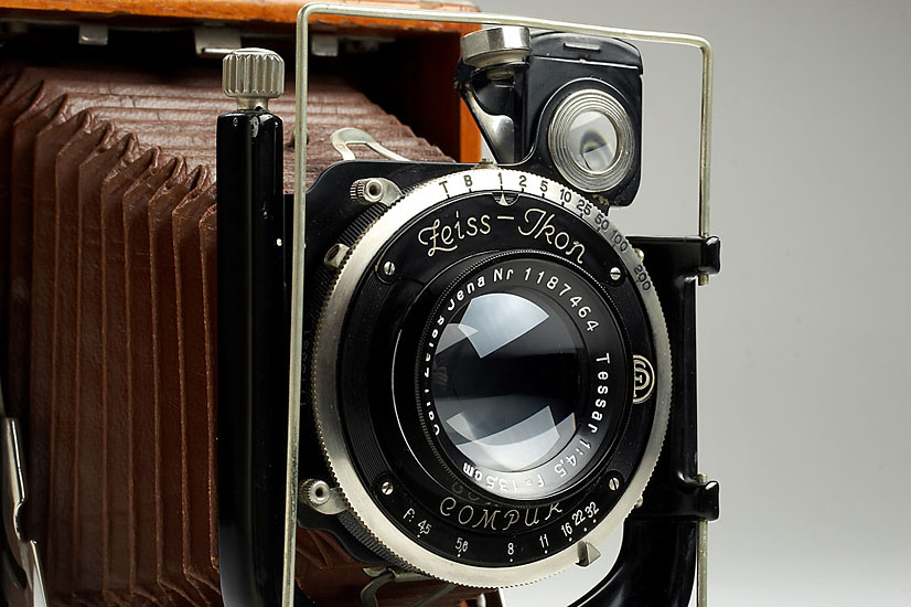 9x12cm, mahogany body with nickel fittings, brown leather bellows, Tessar 4.5/13.5cm no.1187464 in Compur, focusing screen adapter, in fine original condition