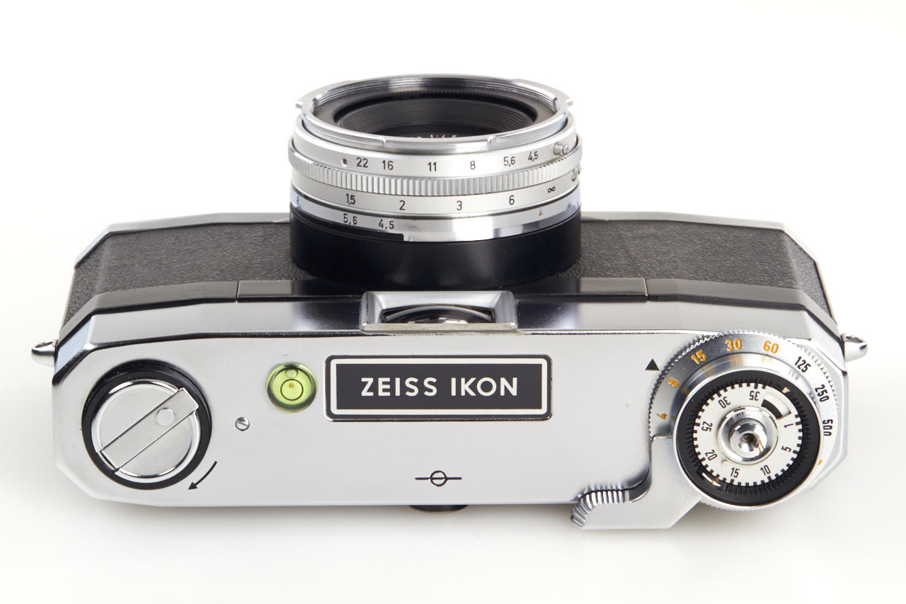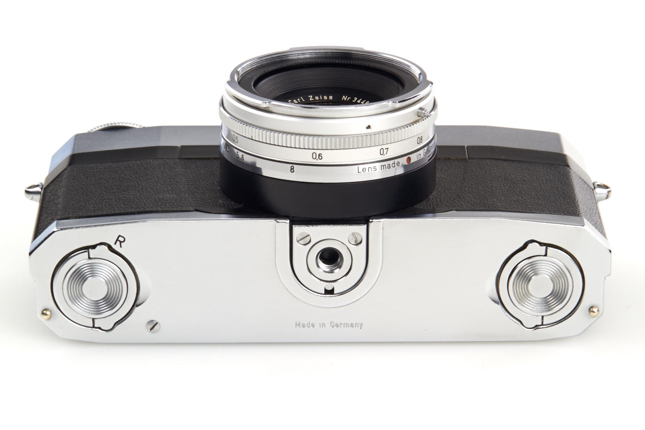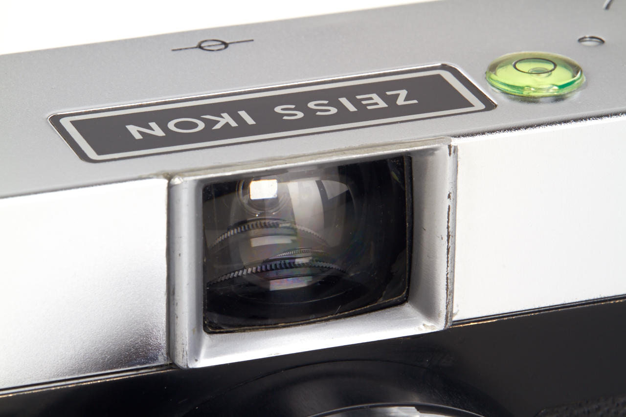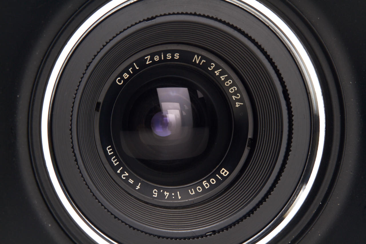 beautifully designed and converted Contarex Microscope Camera with built-in 21mm viewfinder and spirit level, fixed Biogon 4.5/21mm no.3448624, chrome hood - useful compact wide-angle camera in perfect condition