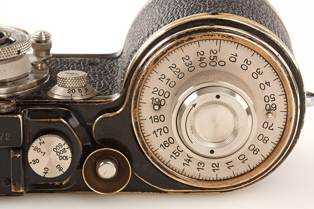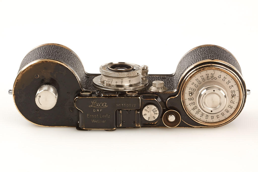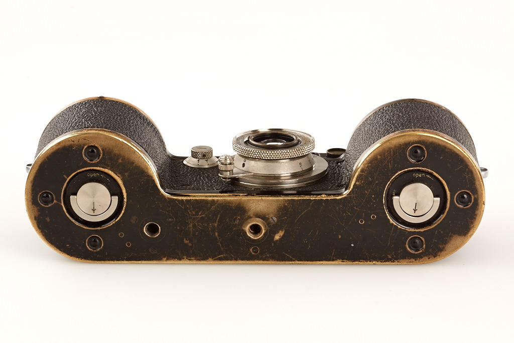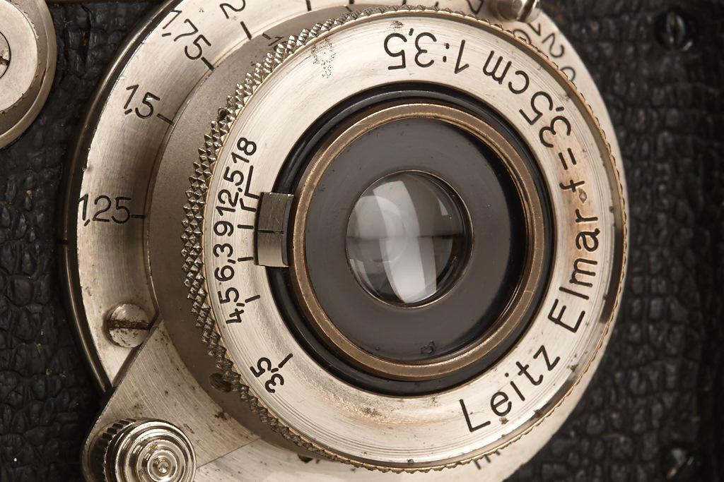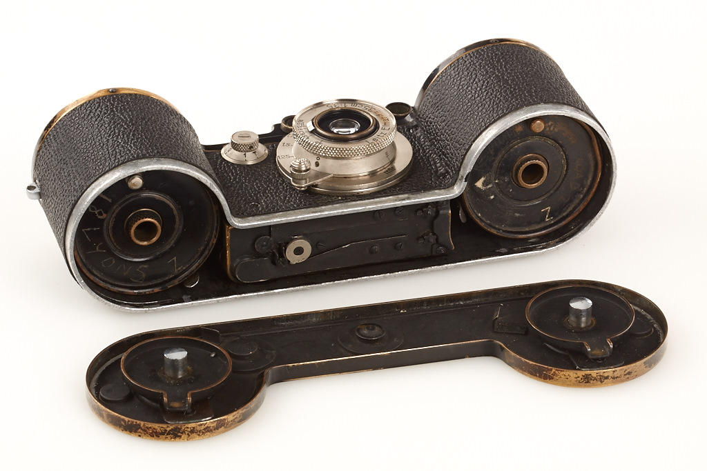early 250 FF camera from the first production year with nickel fittings in used condition, unnumbered nickel Elmar 3.5/3.5cm, camera with both spools, base plate engraved 'open-close' and 'Germany'