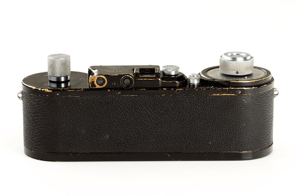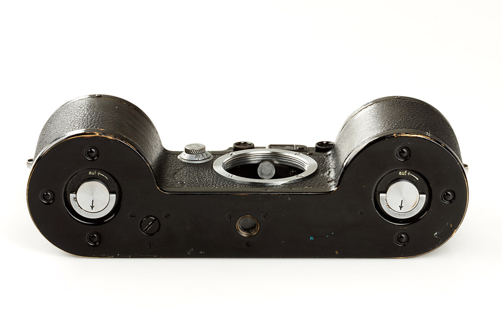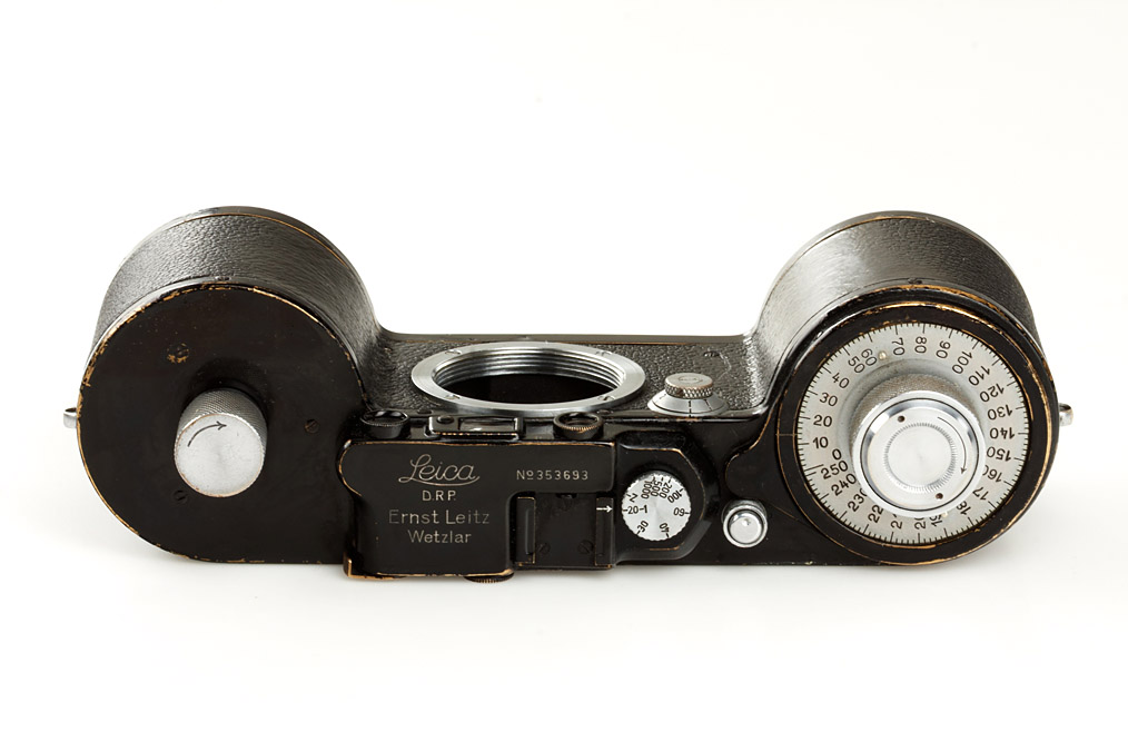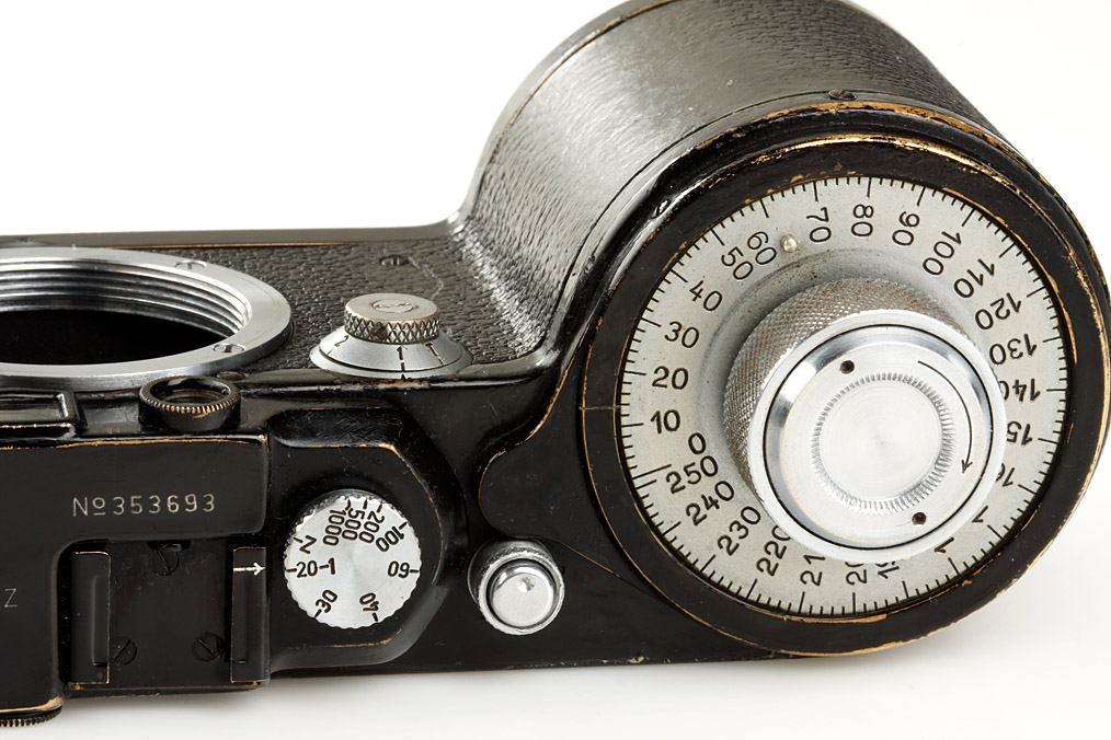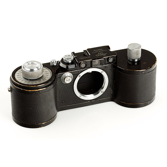 war-time Leica Reporter for 250 exposures in good working condition, chrome knobs, repainted black metal parts and restored leather covering, with rare everready case ESFOO, according to the 'Hahne list' cameras nos.353681-353695 were stolen from the Leitz factory in 1943