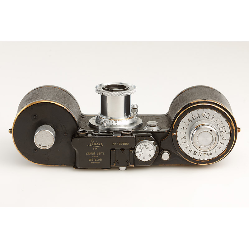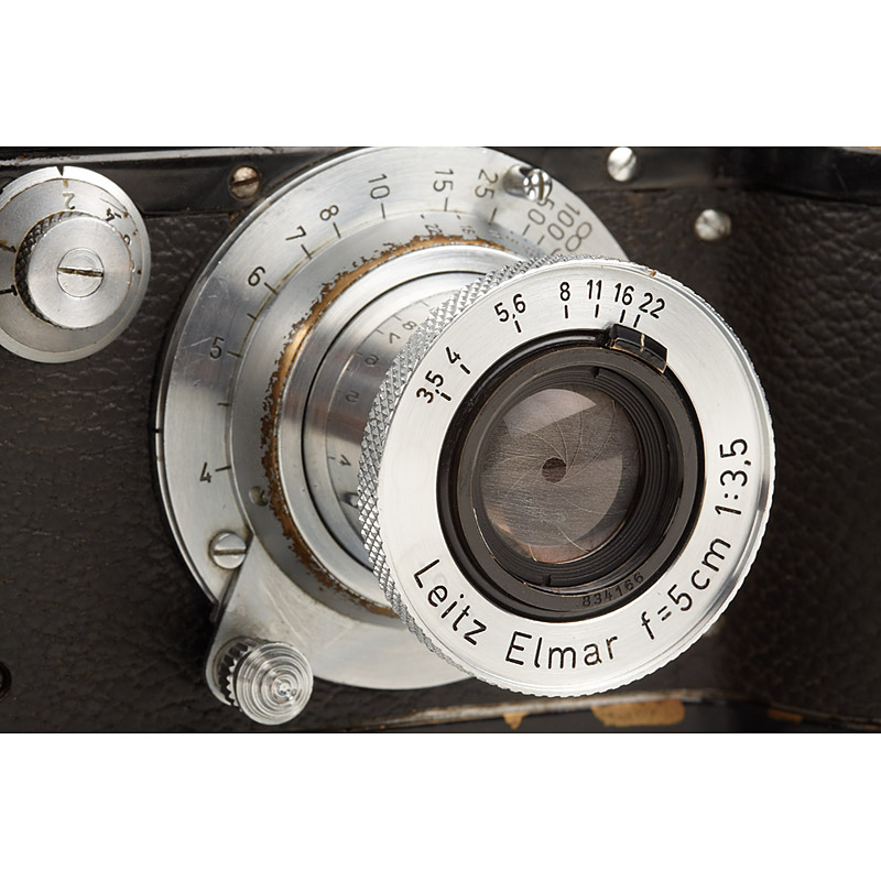 very early 250 FF camera modified to GG (f) synchronised, chrome knobs, export camera with all matching features (top-plate engraved 'Germany', base-plate engraved 'open-closed'), some parts repainted, chrome Elmar 3.5/5cm no.834166 in Feet, engraved 'Germany' (cap)