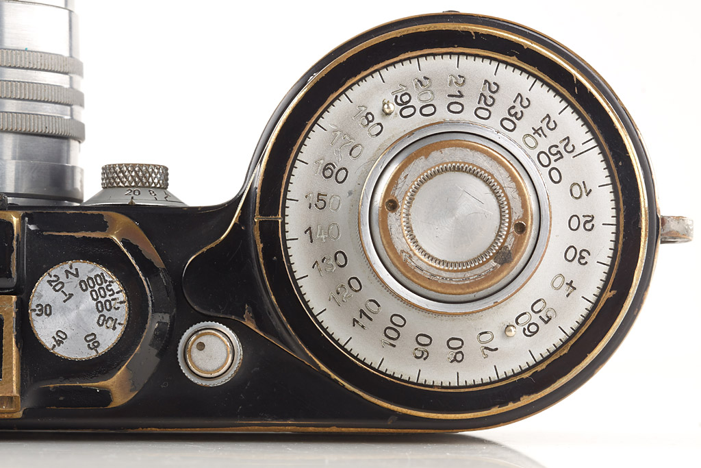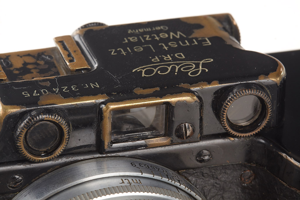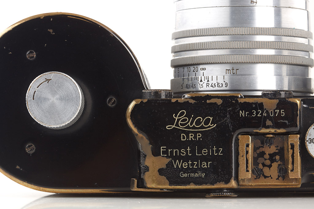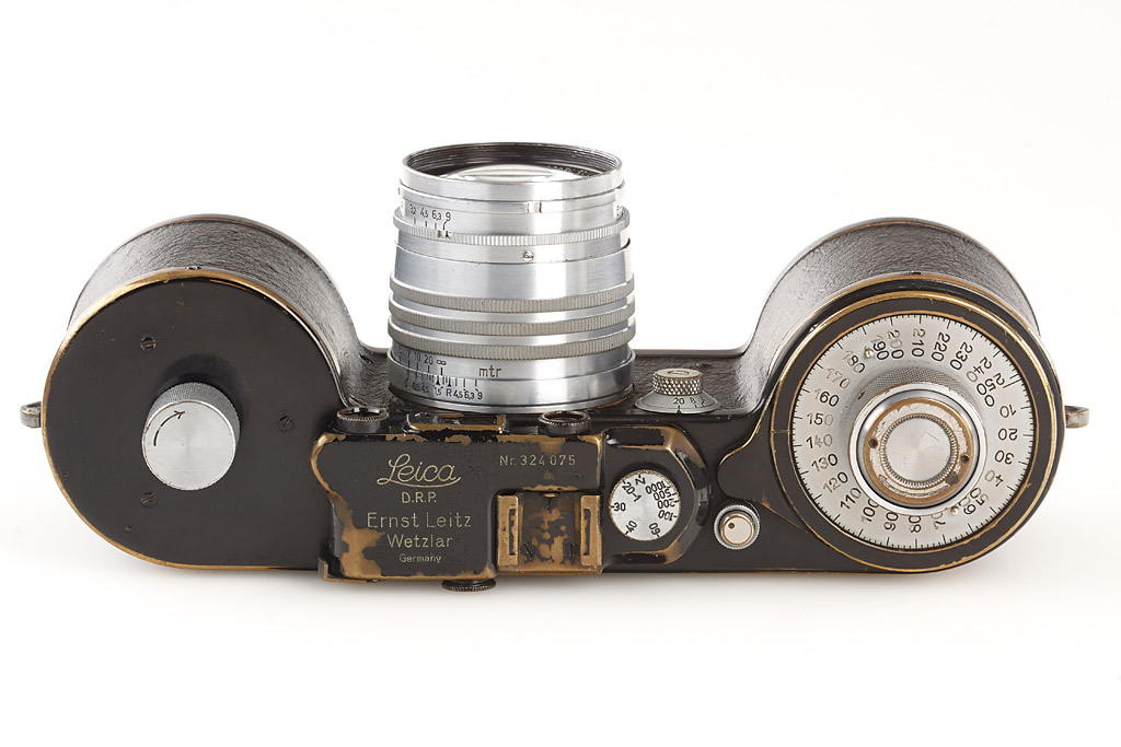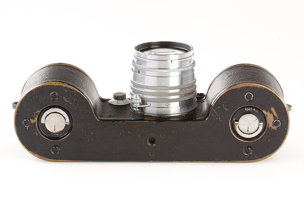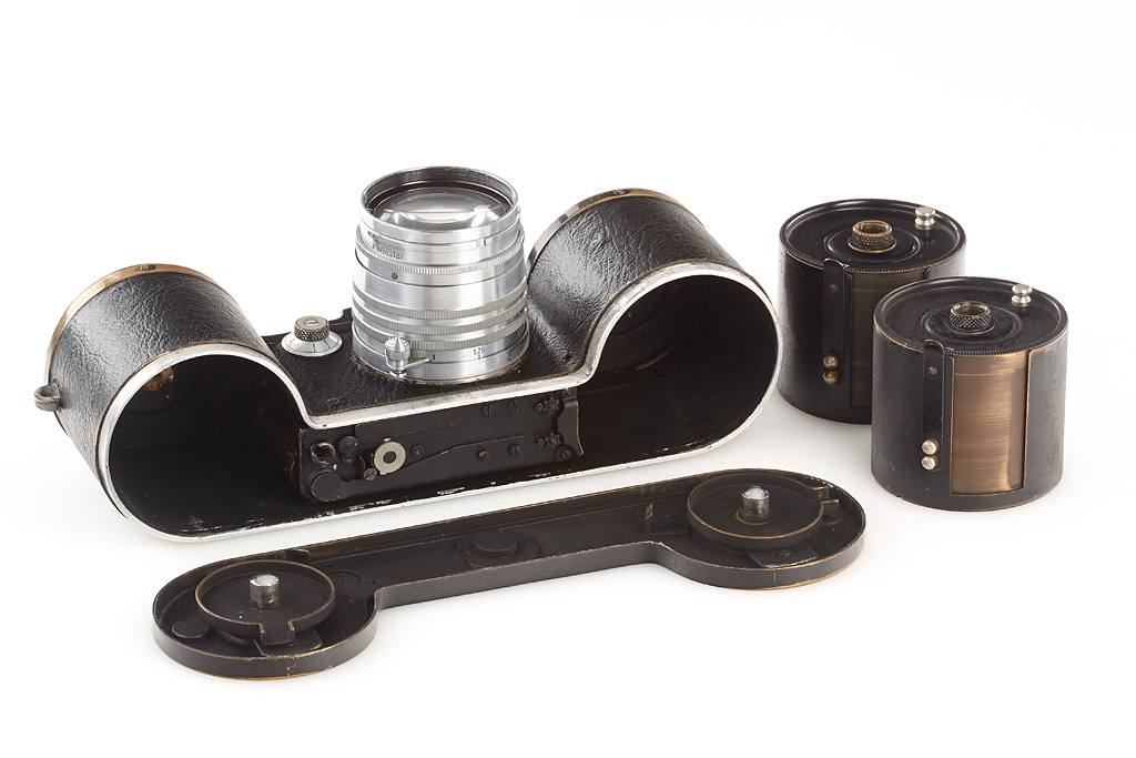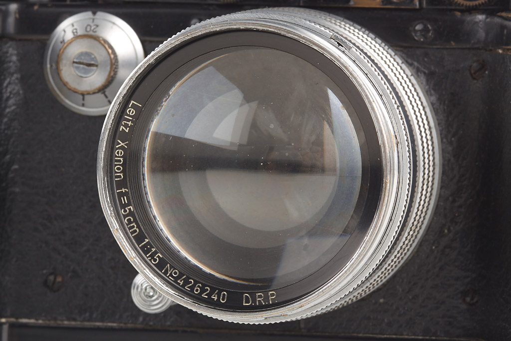 motor-coupled export camera in fine condition, leather covering replaced, both film cassettes, top plate engraved 'Germany', base plate engraved 'open-close' Germany, with Xenon 1.5/5cm no.426240