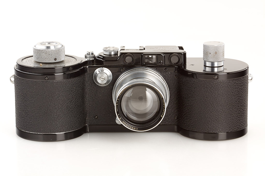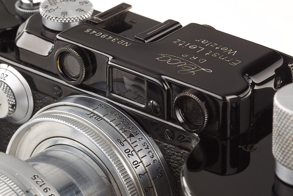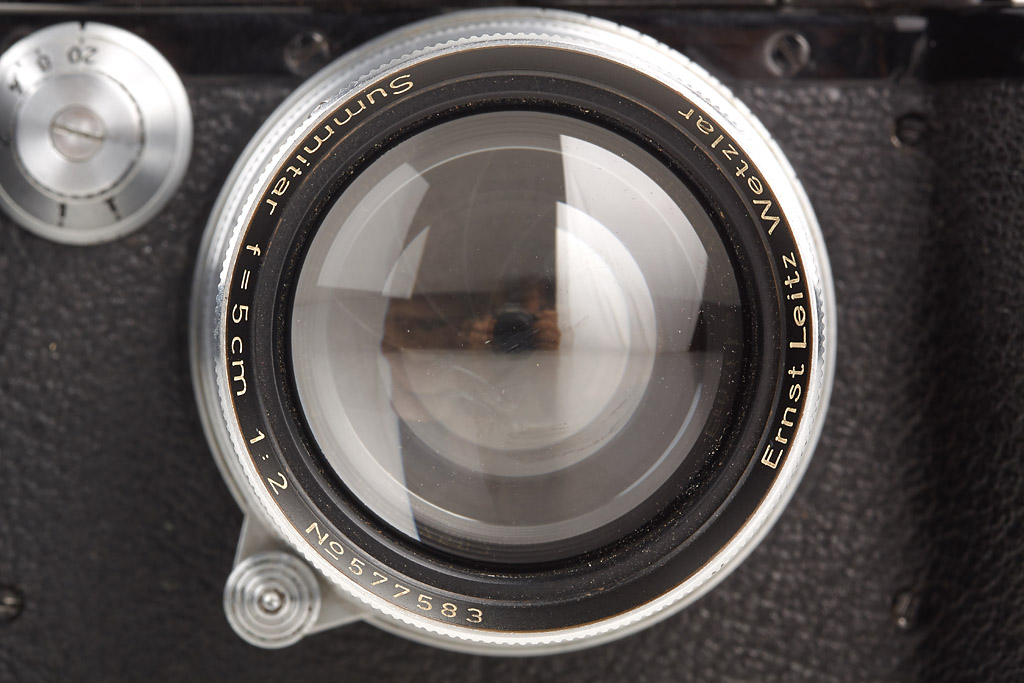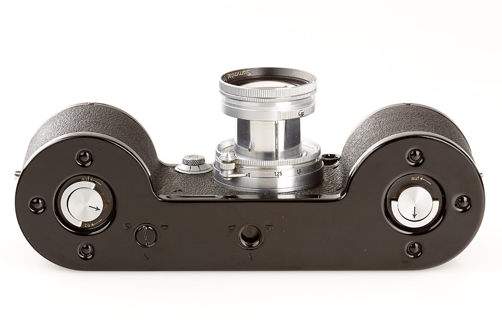 This is the most beautiful Leica 250 GG we have ever seen, in almost like new and original, perfect working condition, it comes with both film cassettes, near mint Summitar 2/5cm no.577583 (cap), ESFOO everready case, rare ANZOO film trimming template, instructions, original maker's box with matching number - the camera was delivered on December 24th (!), 1941 to the University in Straßburg and obviously never used !